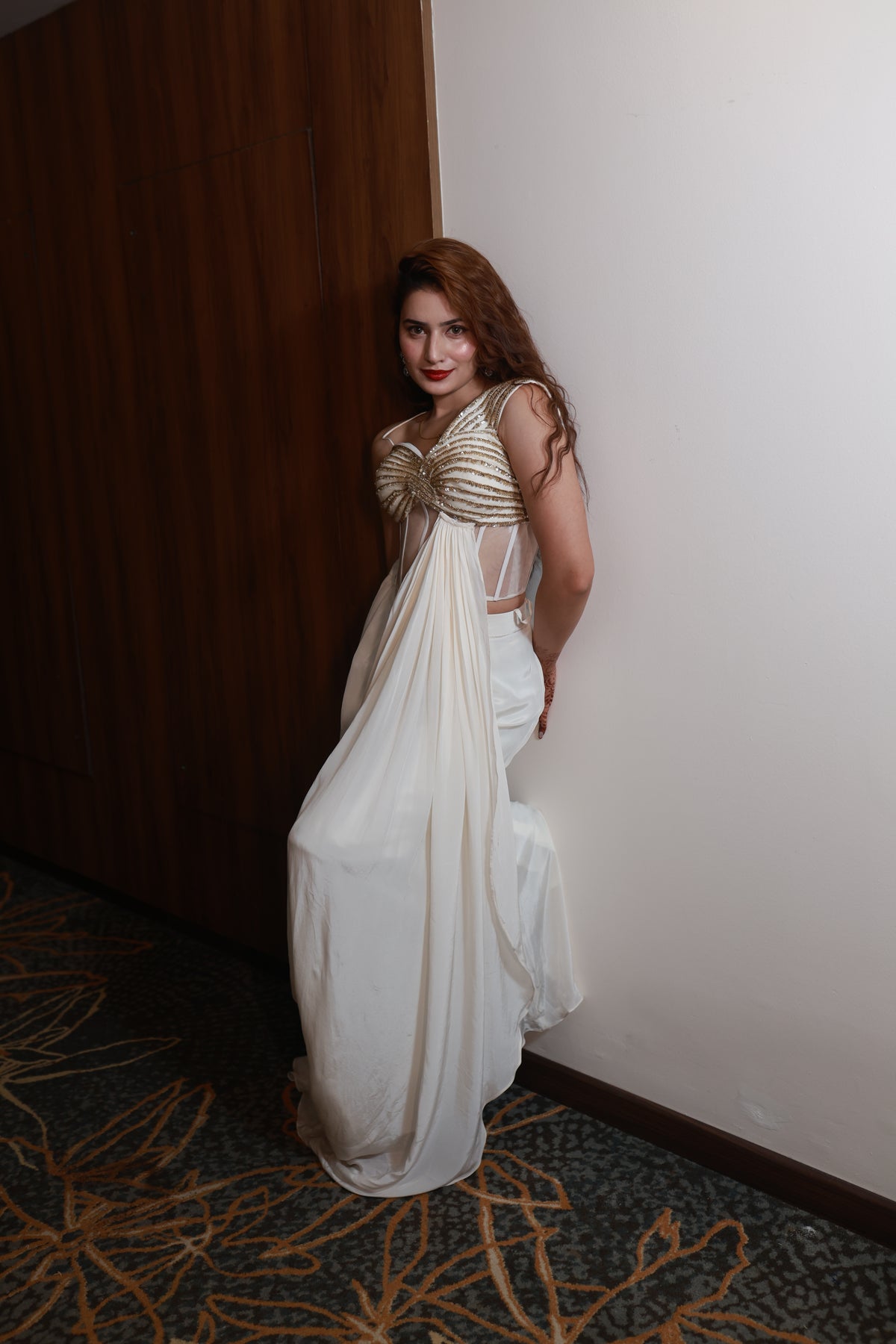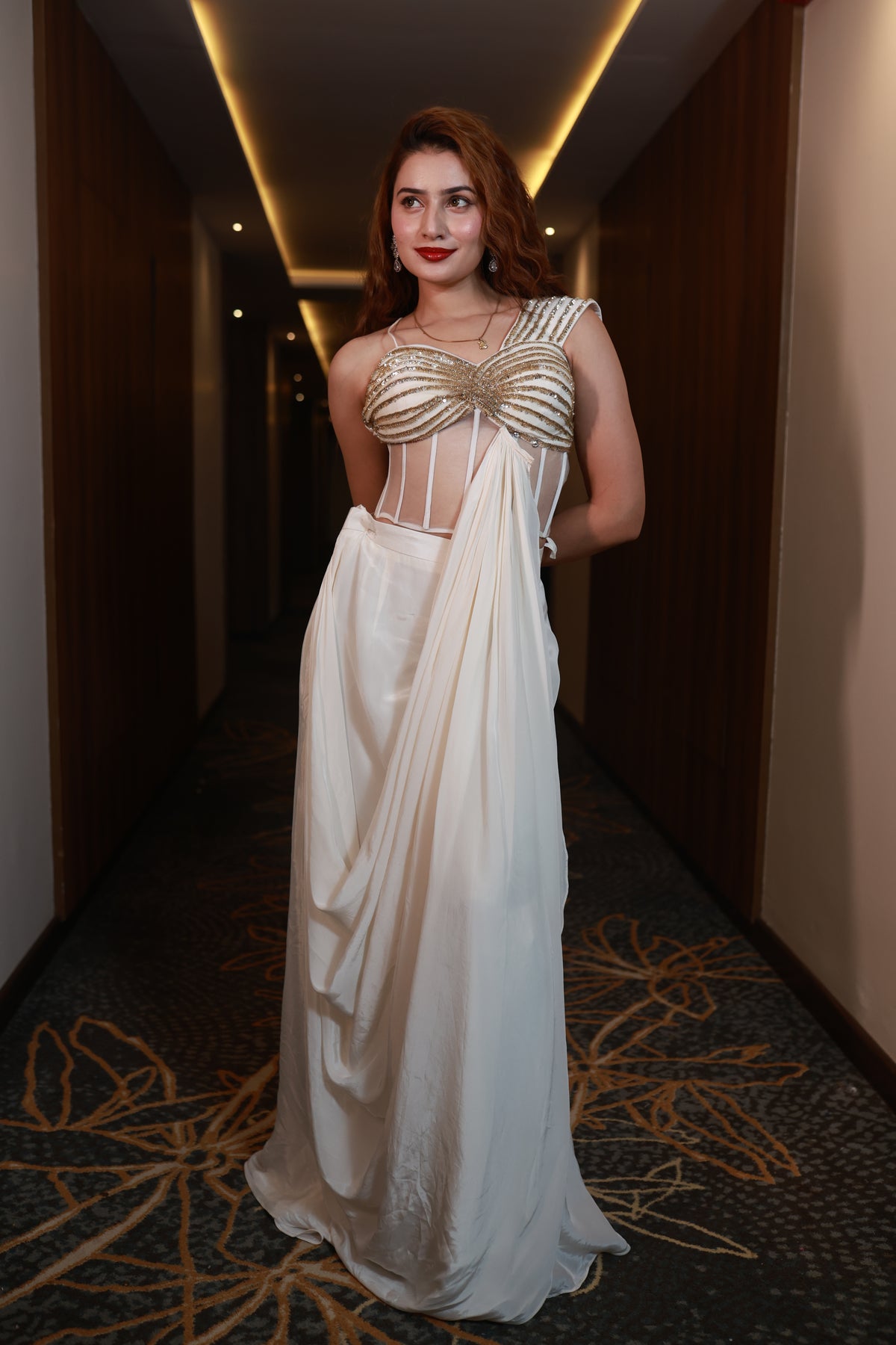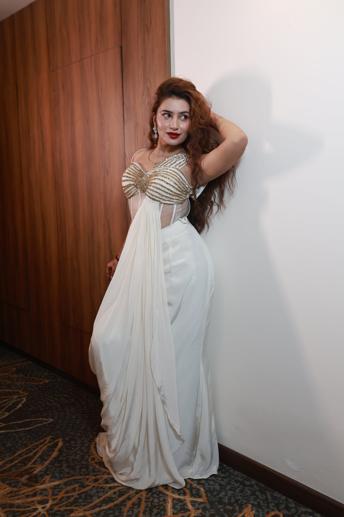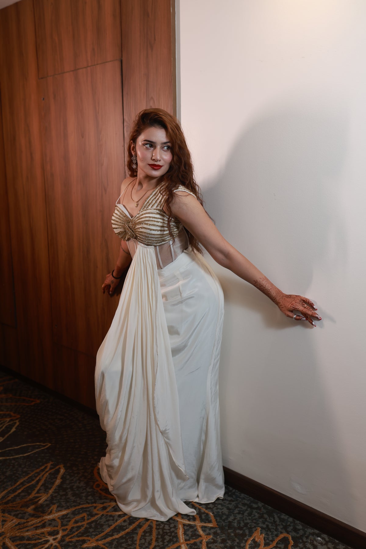 Crafted in pure ivory silk with a sculpted, hand-embellished bodice, this gown blurs the line between couture and art. The delicately draped silhouette accentuates fluidity, grace, and femininity — designed for the woman who turns every moment into a statement.