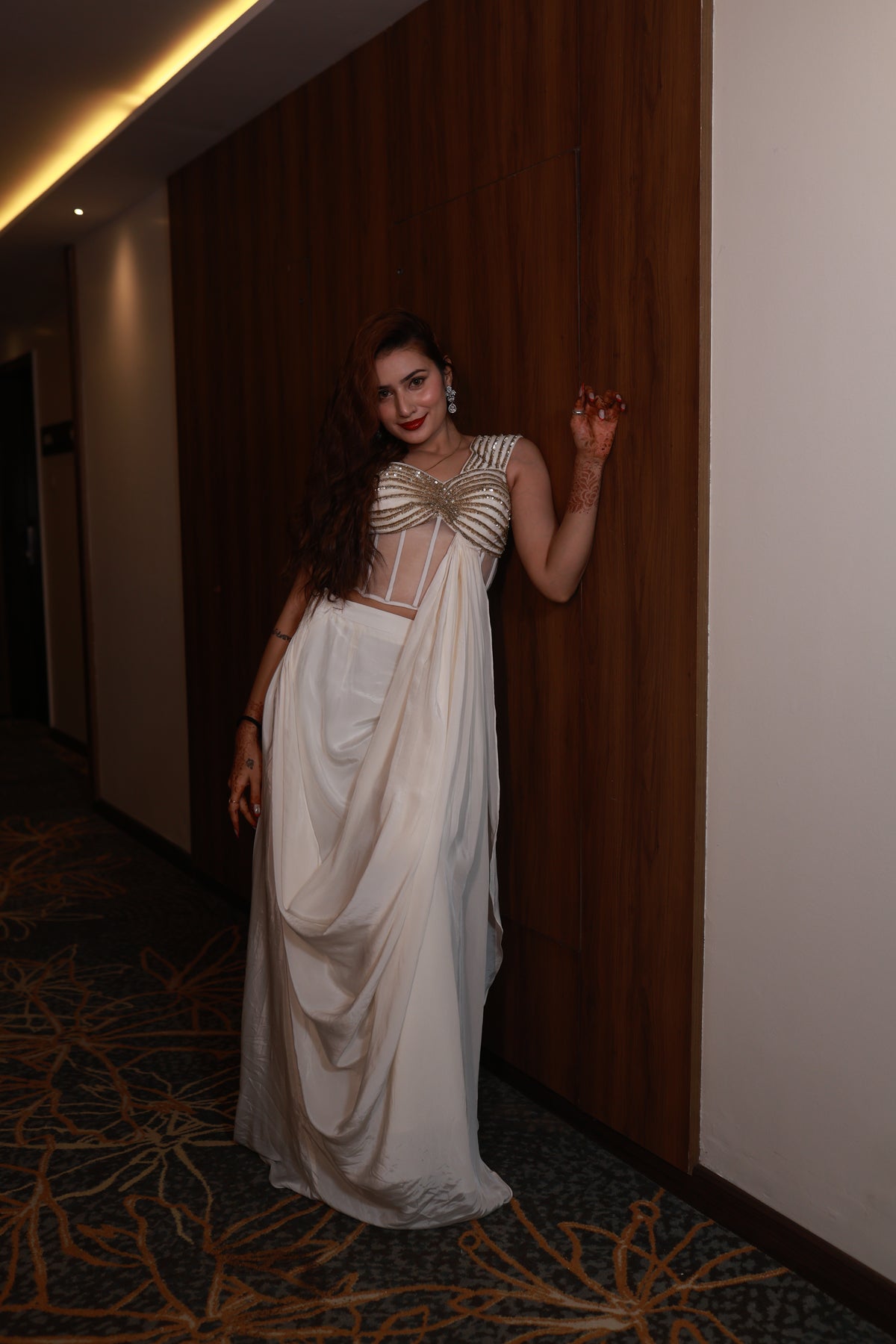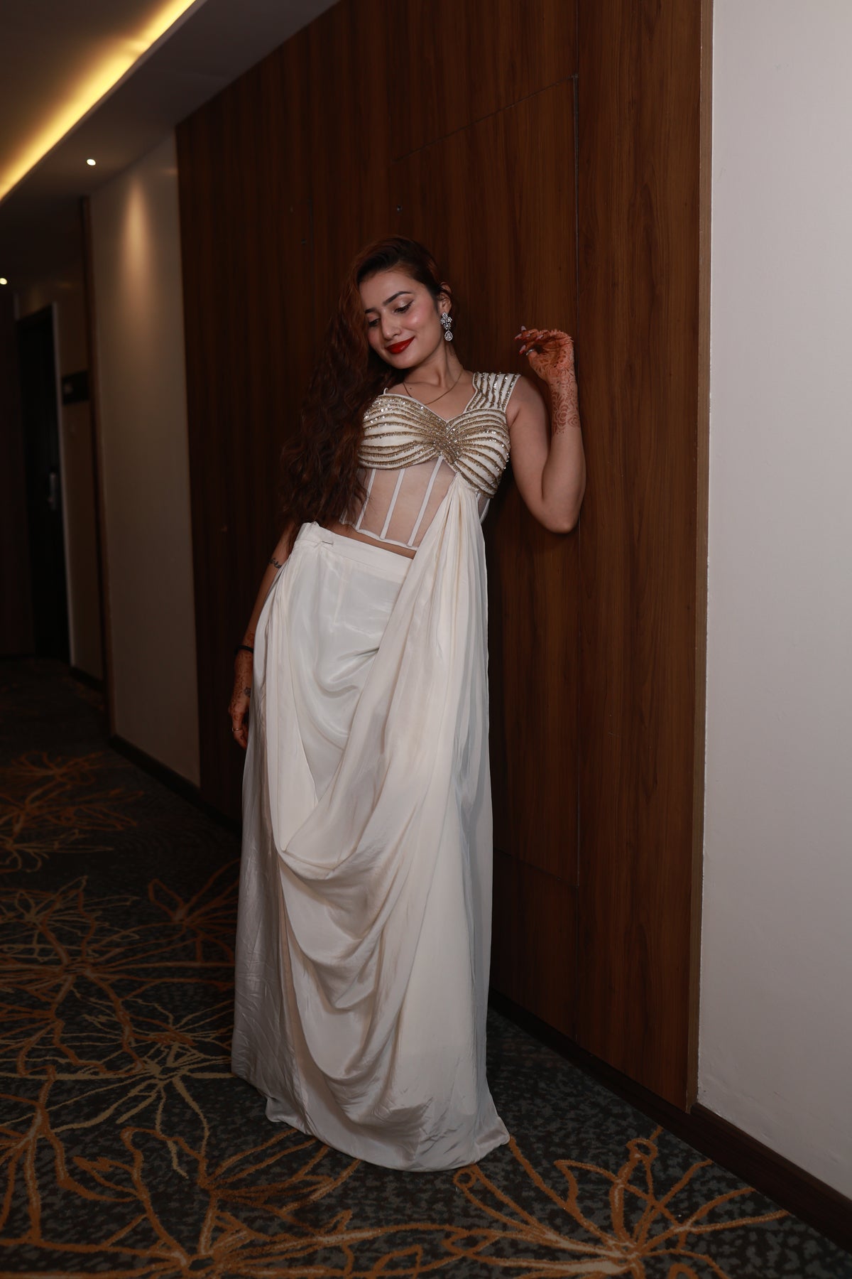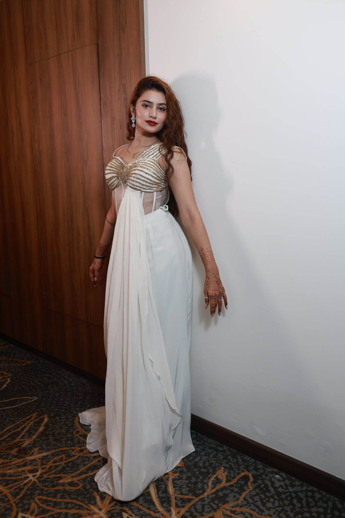 Crafted in pure ivory silk with a sculpted, hand-embellished bodice, this gown blurs the line between couture and art. The delicately draped silhouette accentuates fluidity, grace, and femininity — designed for the woman who turns every moment into a statement.