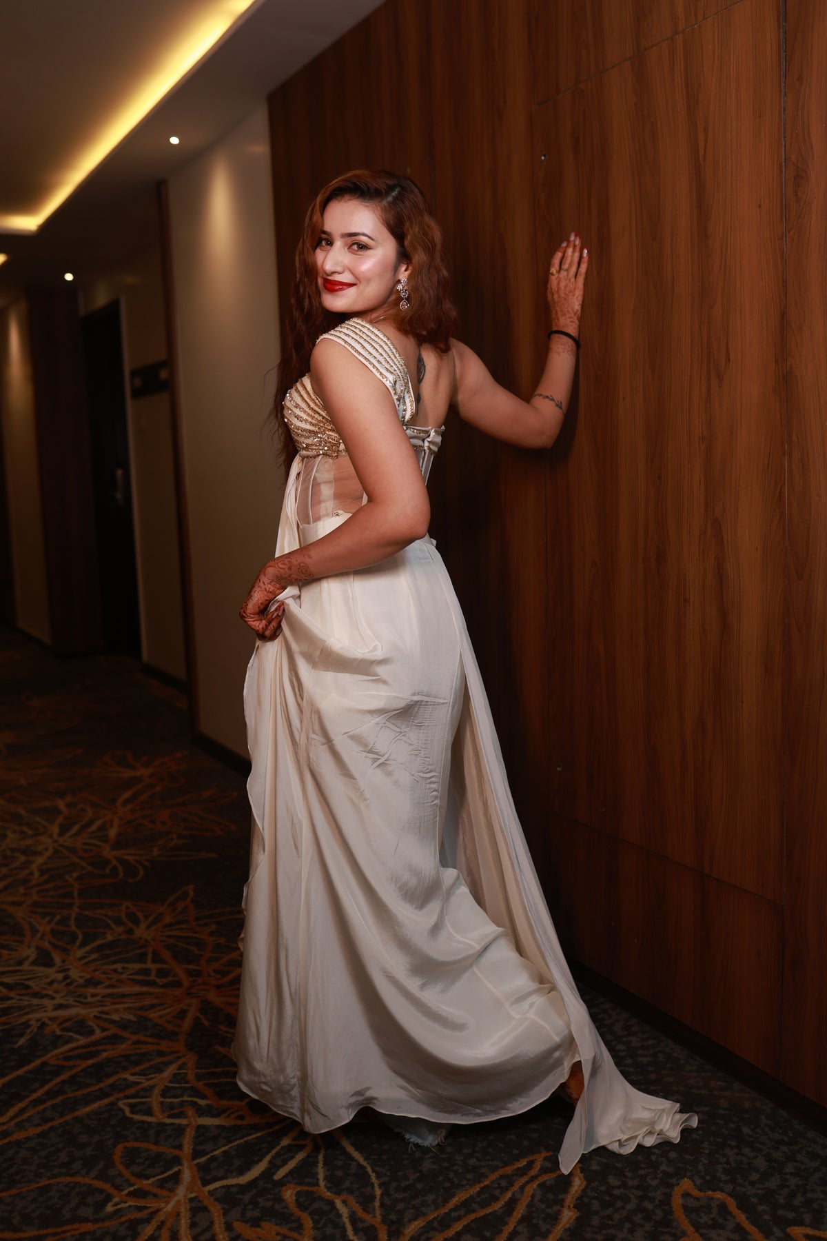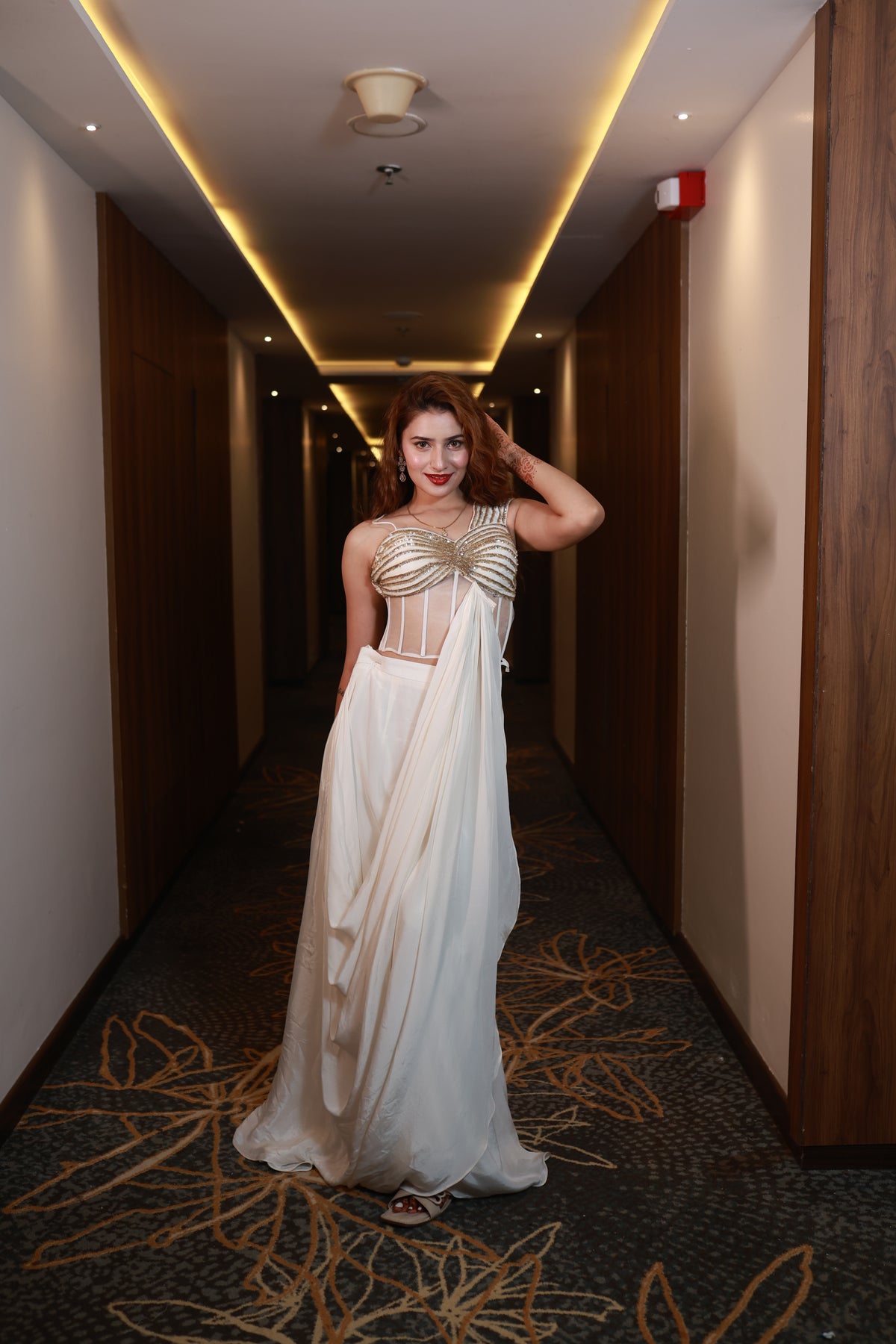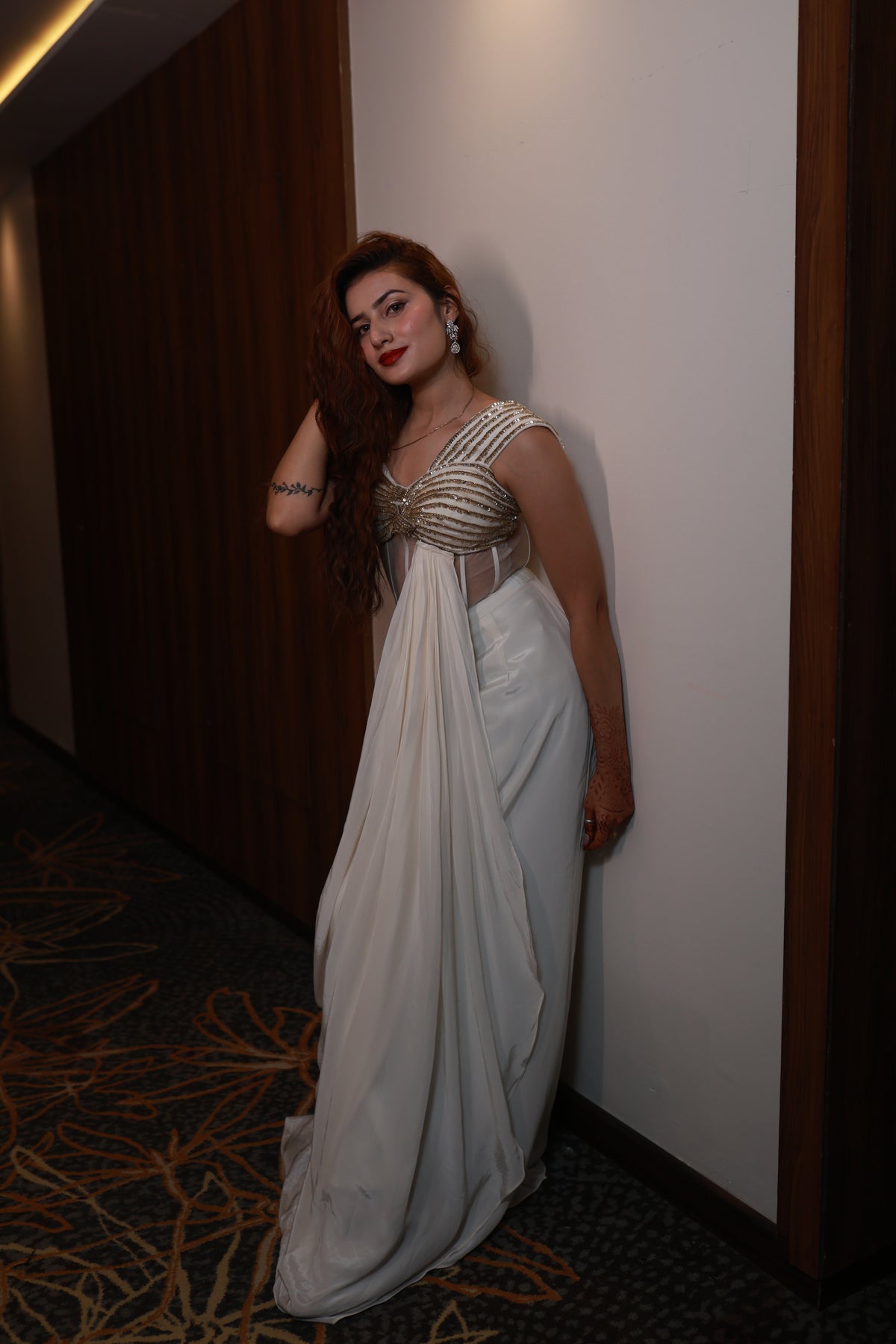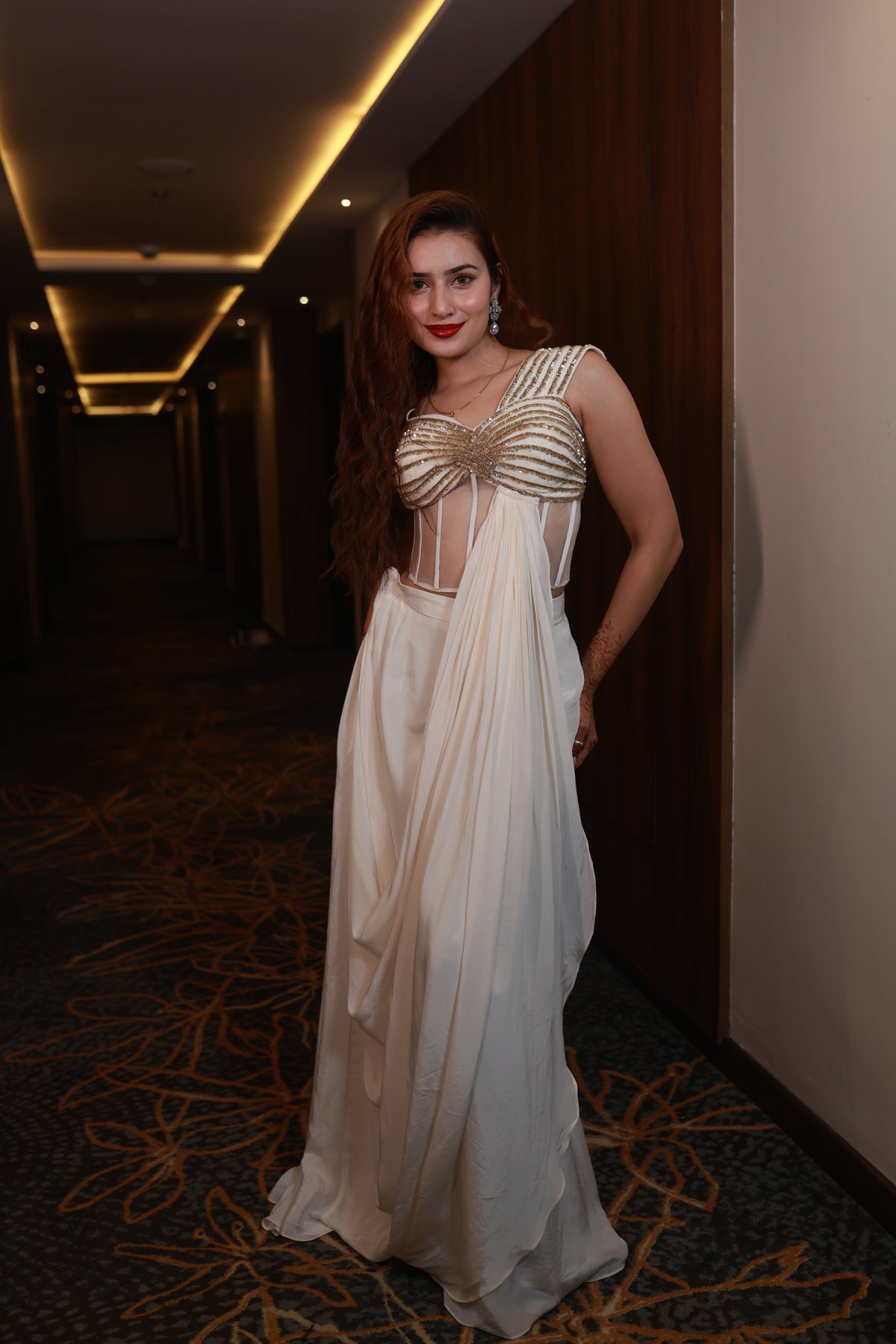 Crafted in pure ivory silk with a sculpted, hand-embellished bodice, this gown blurs the line between couture and art. The delicately draped silhouette accentuates fluidity, grace, and femininity — designed for the woman who turns every moment into a statement.