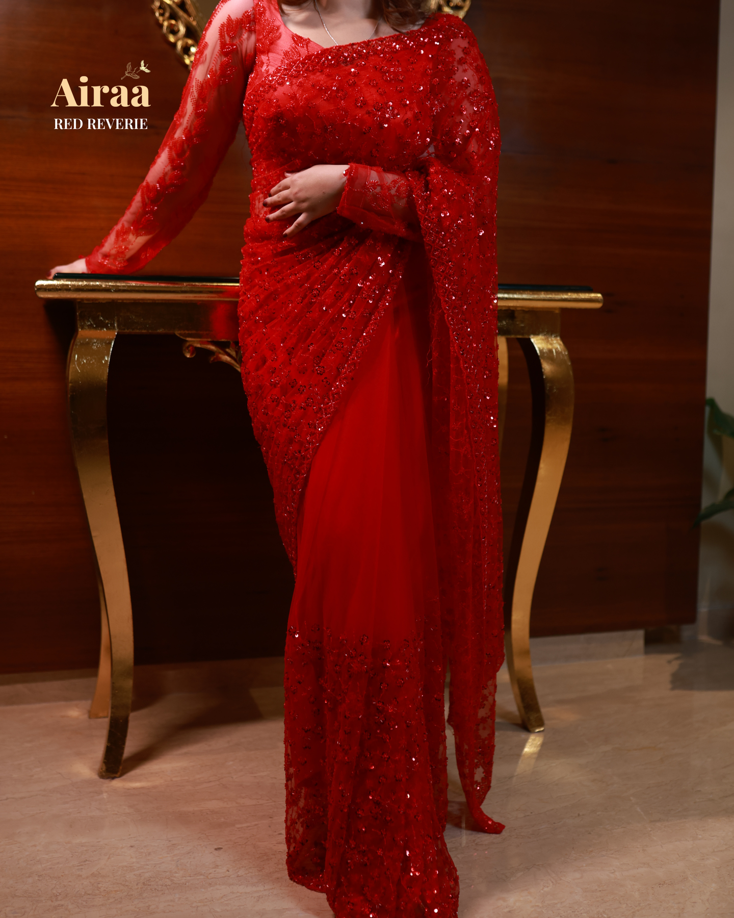 Draped in the passion of scarlet and the elegance of intricate sequin embroidery, this handcrafted pre-draped saree captures the essence of modern couture with a touch of vintage romance.