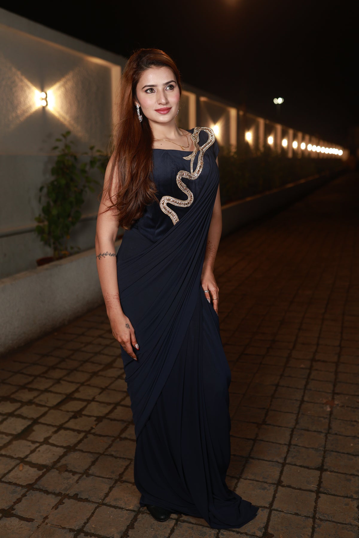 Crafted in deep midnight blue, this pre-draped saree features an intricately hand-embroidered serpent motif — a symbol of strength, grace, and mystique. The fluid drape hugs your silhouette beautifully, while the embellished detailing adds a touch of luxury that makes every glance linger.