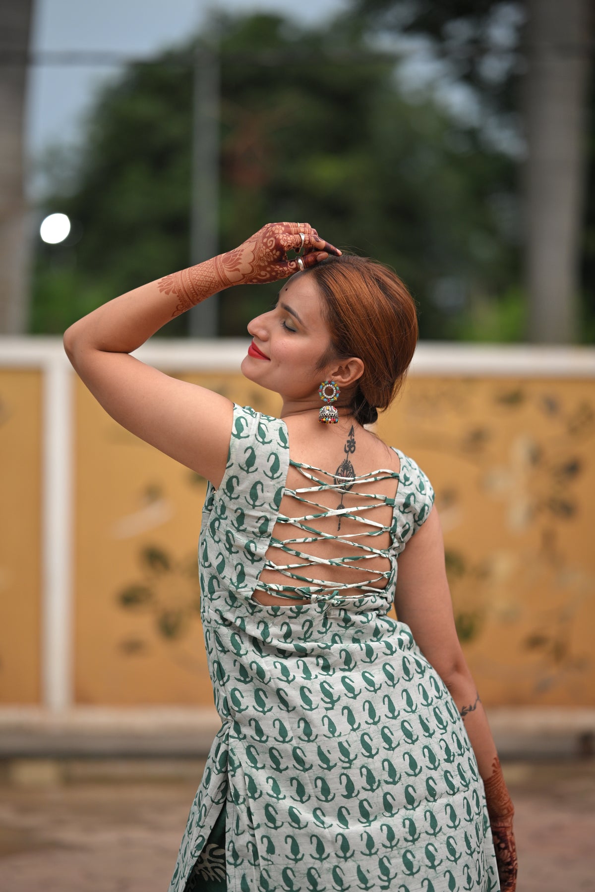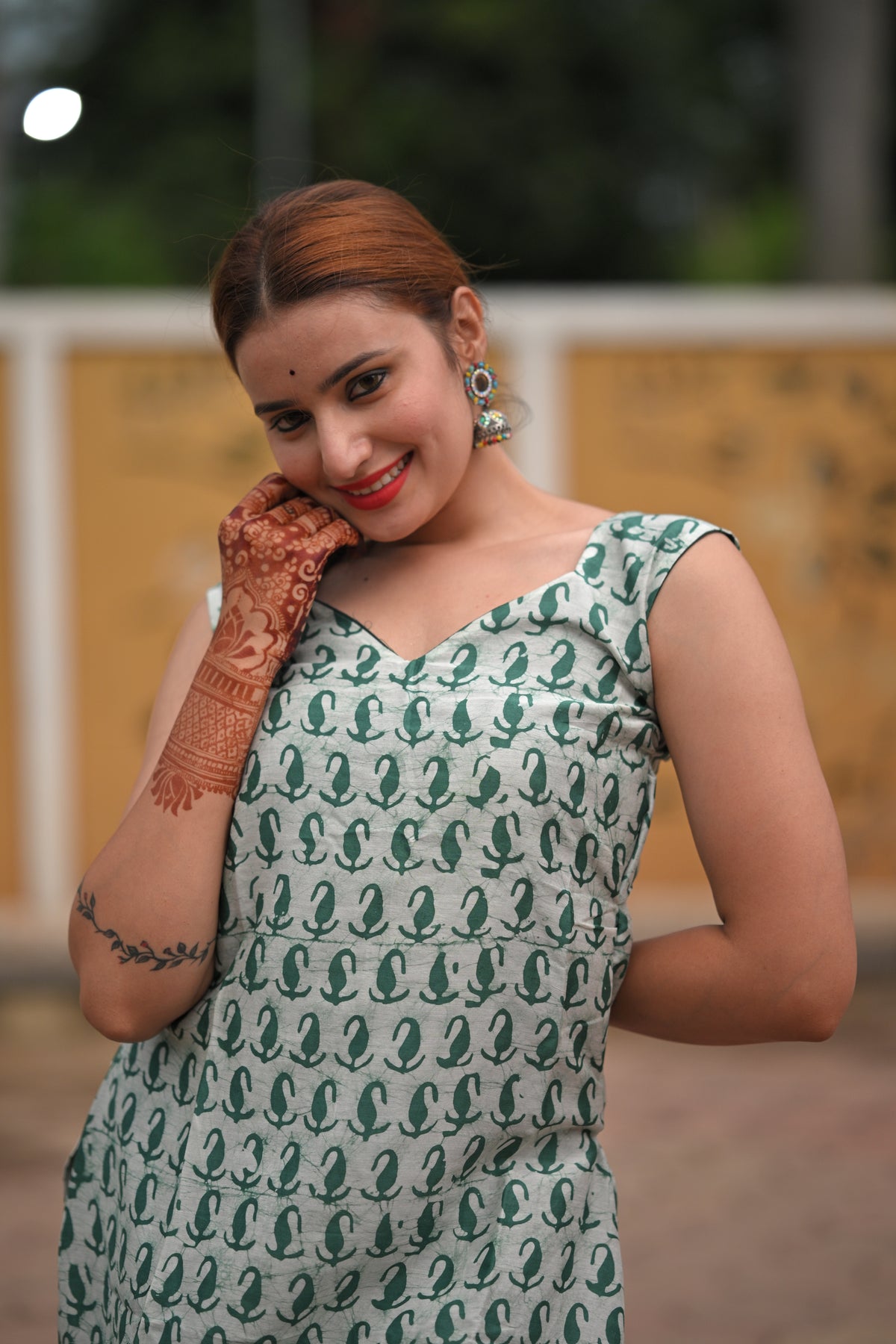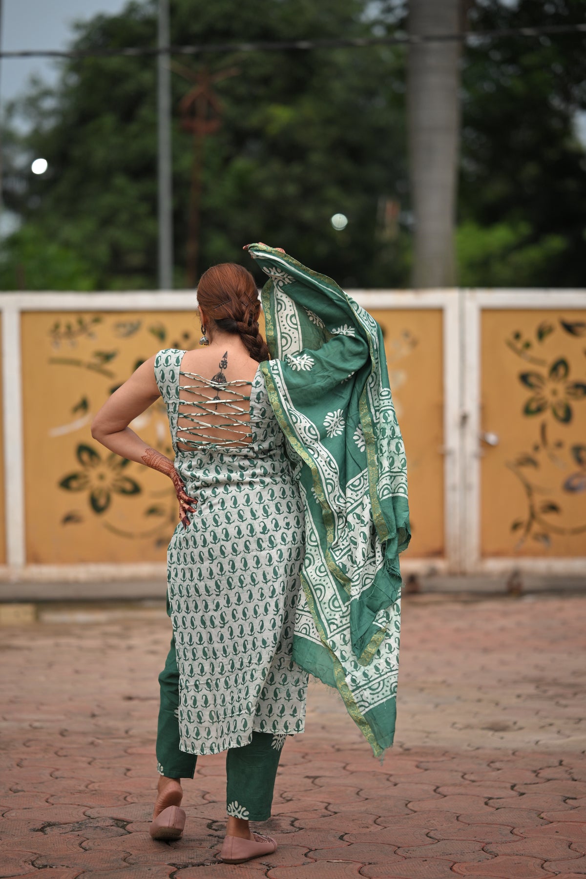 Bring freshness to your wardrobe with the Panna Handblock Cotton Suit Set, a soothing blend of style and comfort. This three-piece ensemble features a soft cotton kurta with delicate handblock prints, paired with matching trousers and a beautifully patterned dupatta. The cool green tones make it perfect for summer outings, office wear, or festive mornings. Its breathable fabric and artisanal detailing create a graceful and effortless look for every occasion.