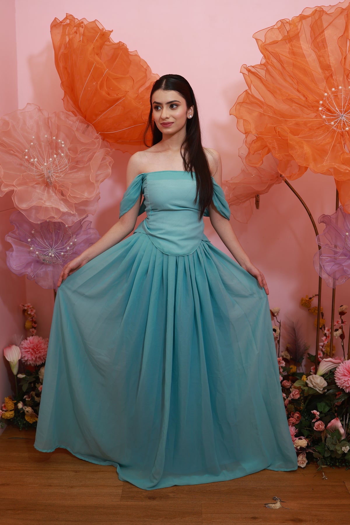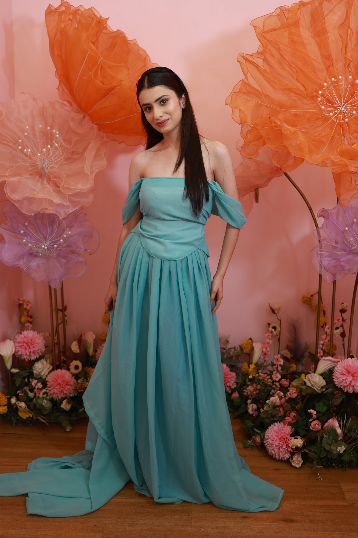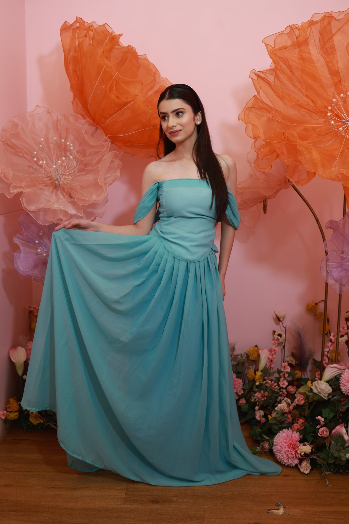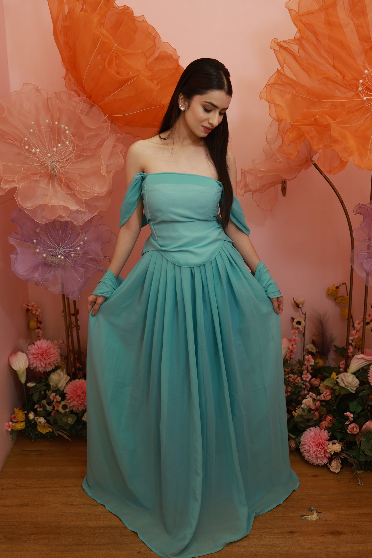 Aqua Blossom Gown – Soft Off-Shoulder Flowy Set (Emperia Collection)