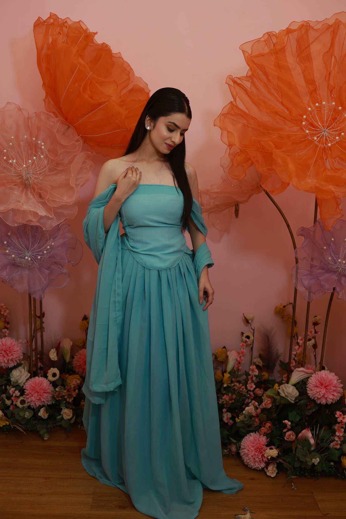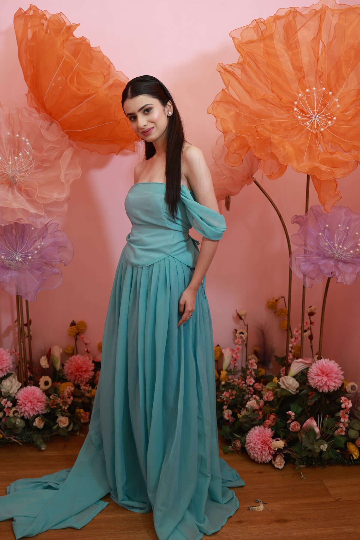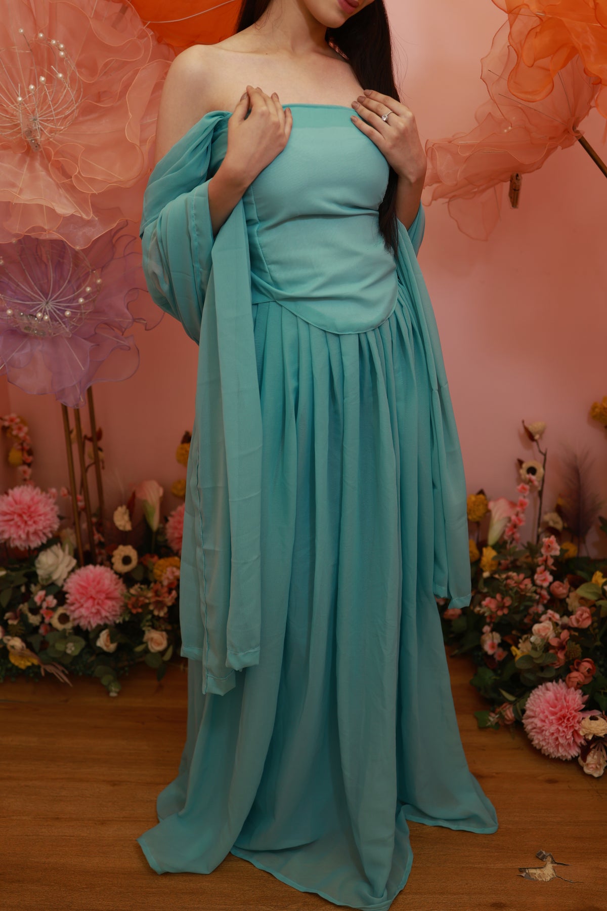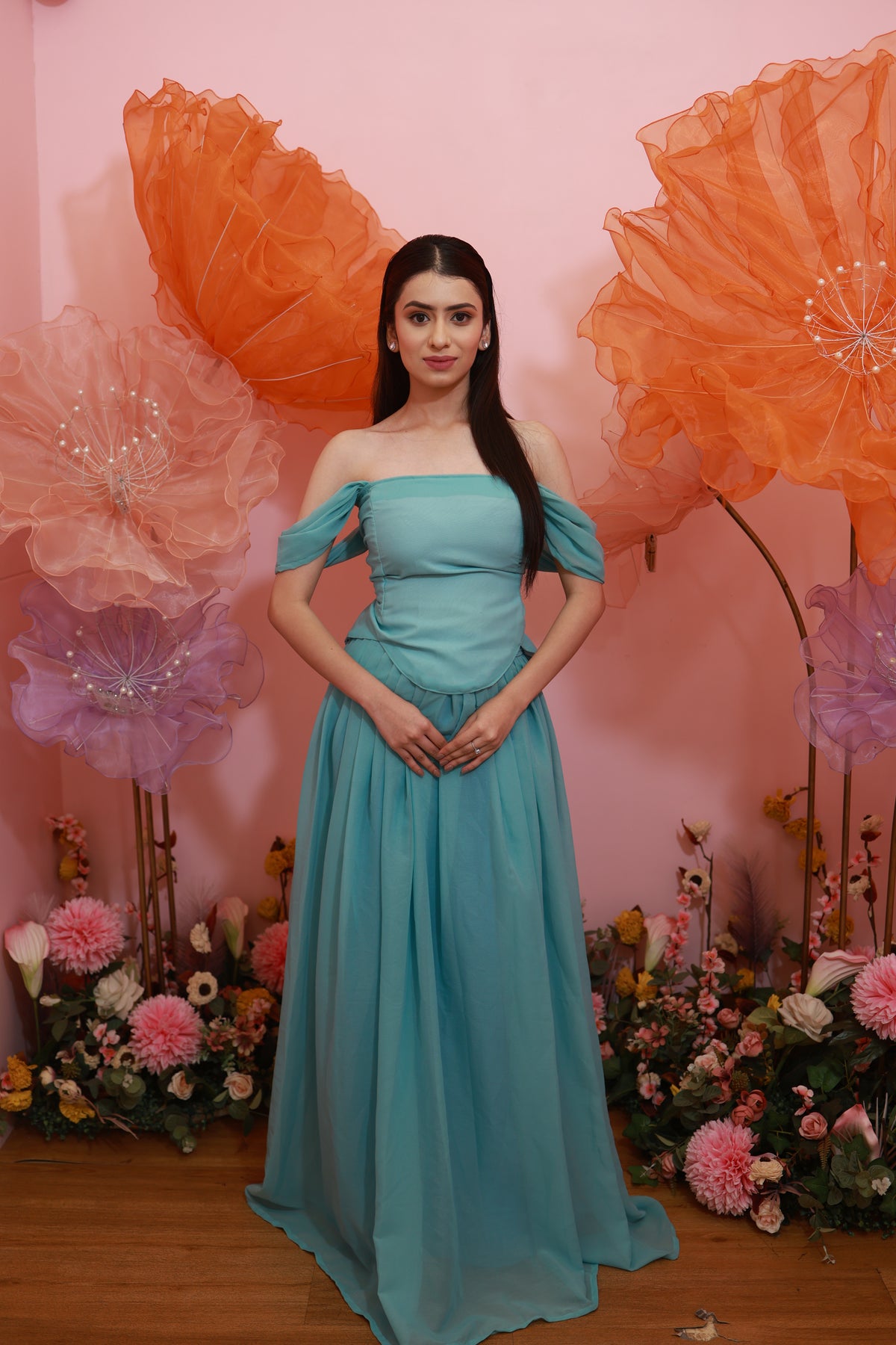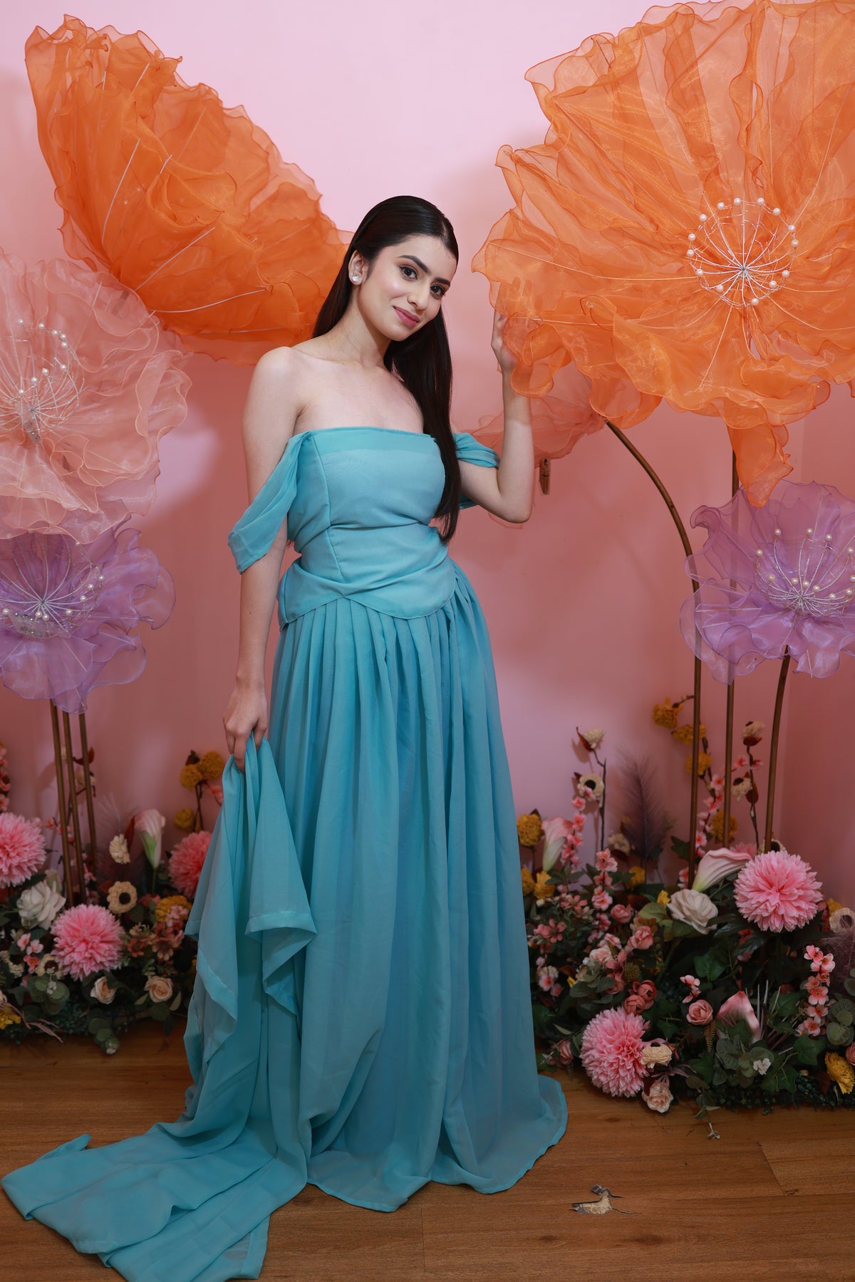 Aqua Blossom Gown – Soft Off-Shoulder Flowy Set (Emperia Collection)