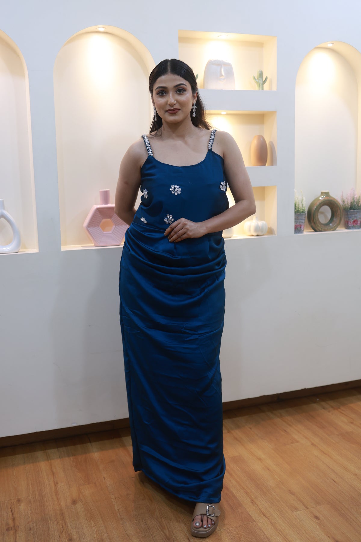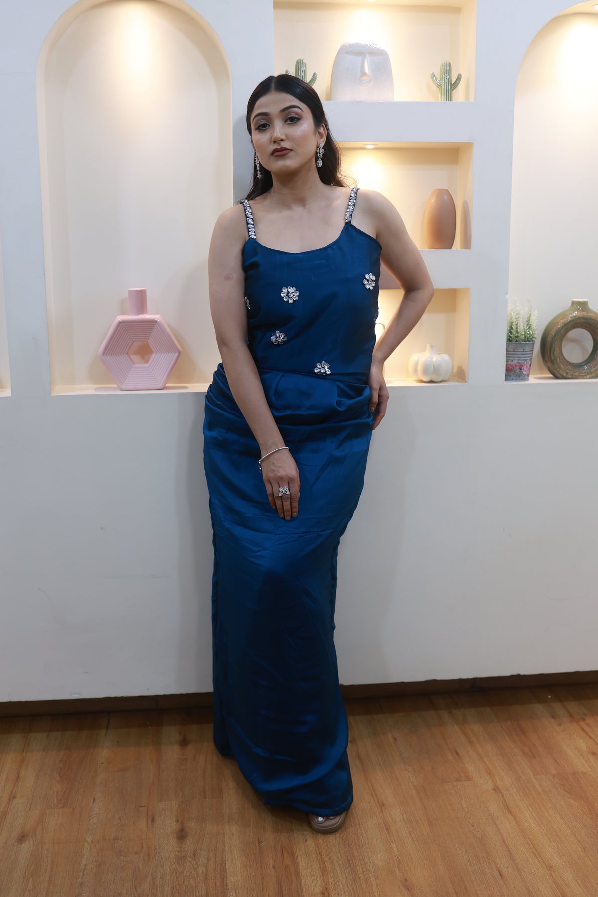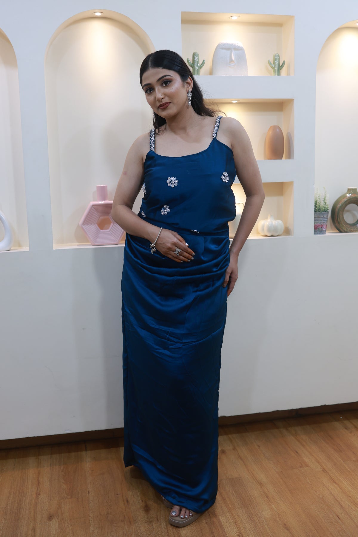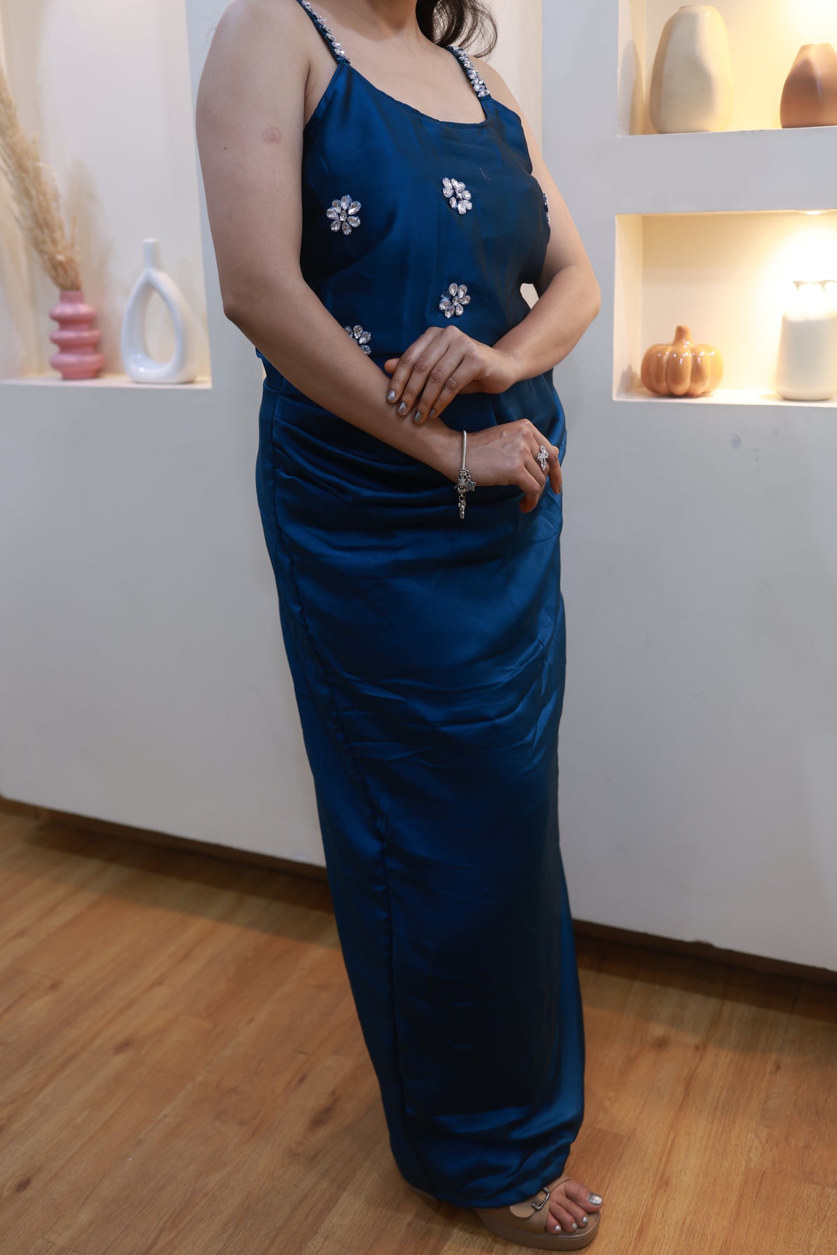 This stunning blue satin ensemble drapes beautifully along the body, creating a sleek, elongated silhouette. Delicate hand-embellished floral motifs add just the right touch of sparkle, while the crystal-detailed straps bring a soft, glamorous finish.