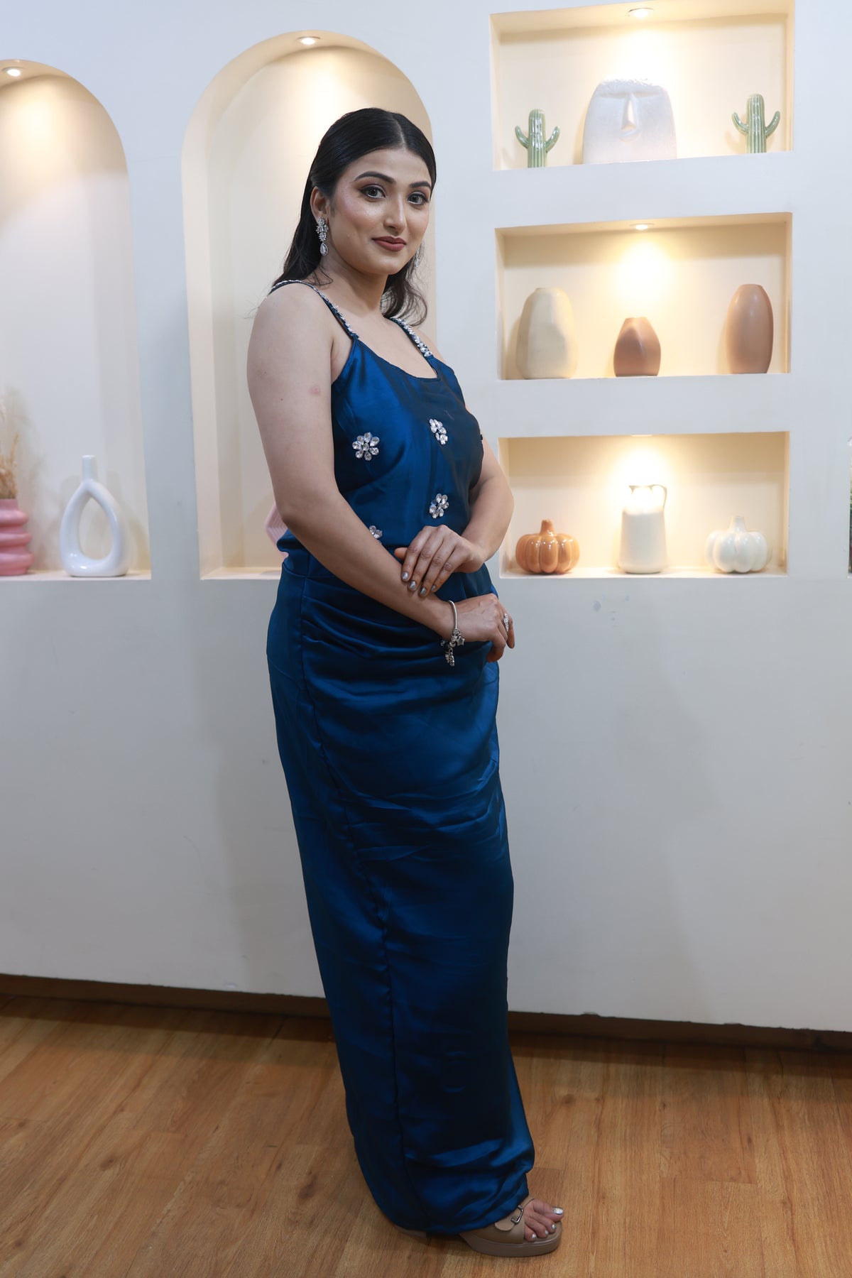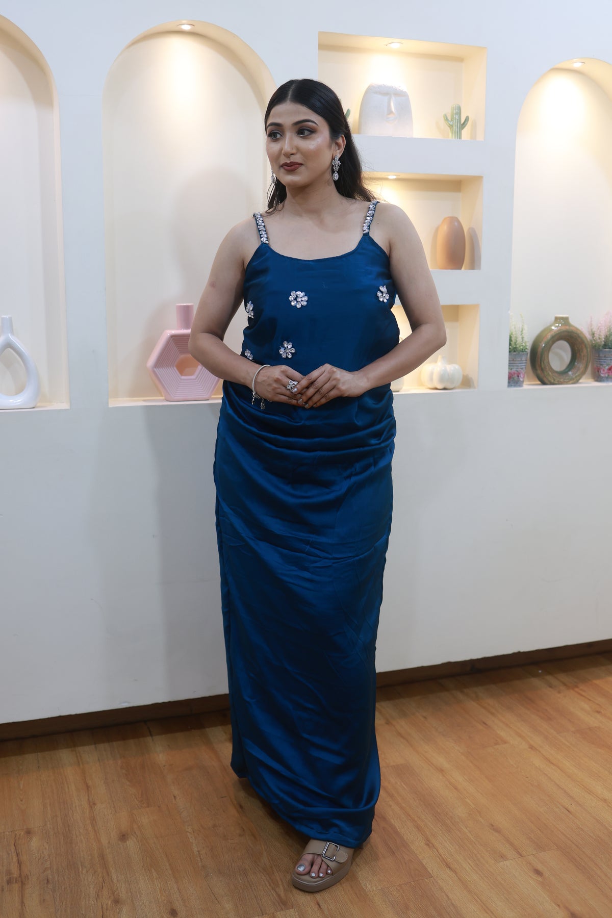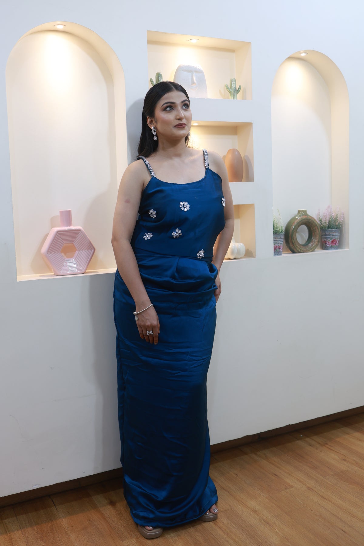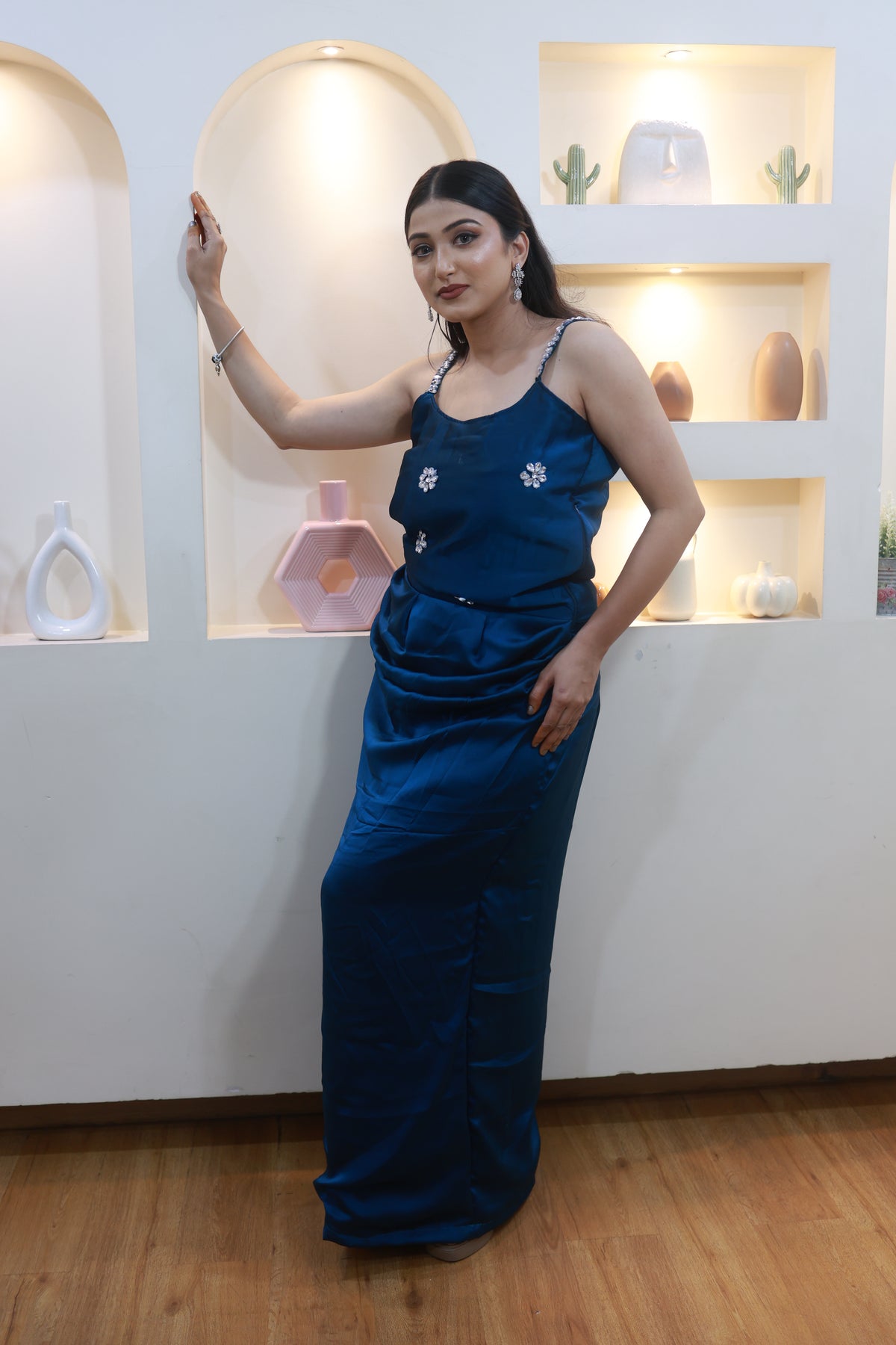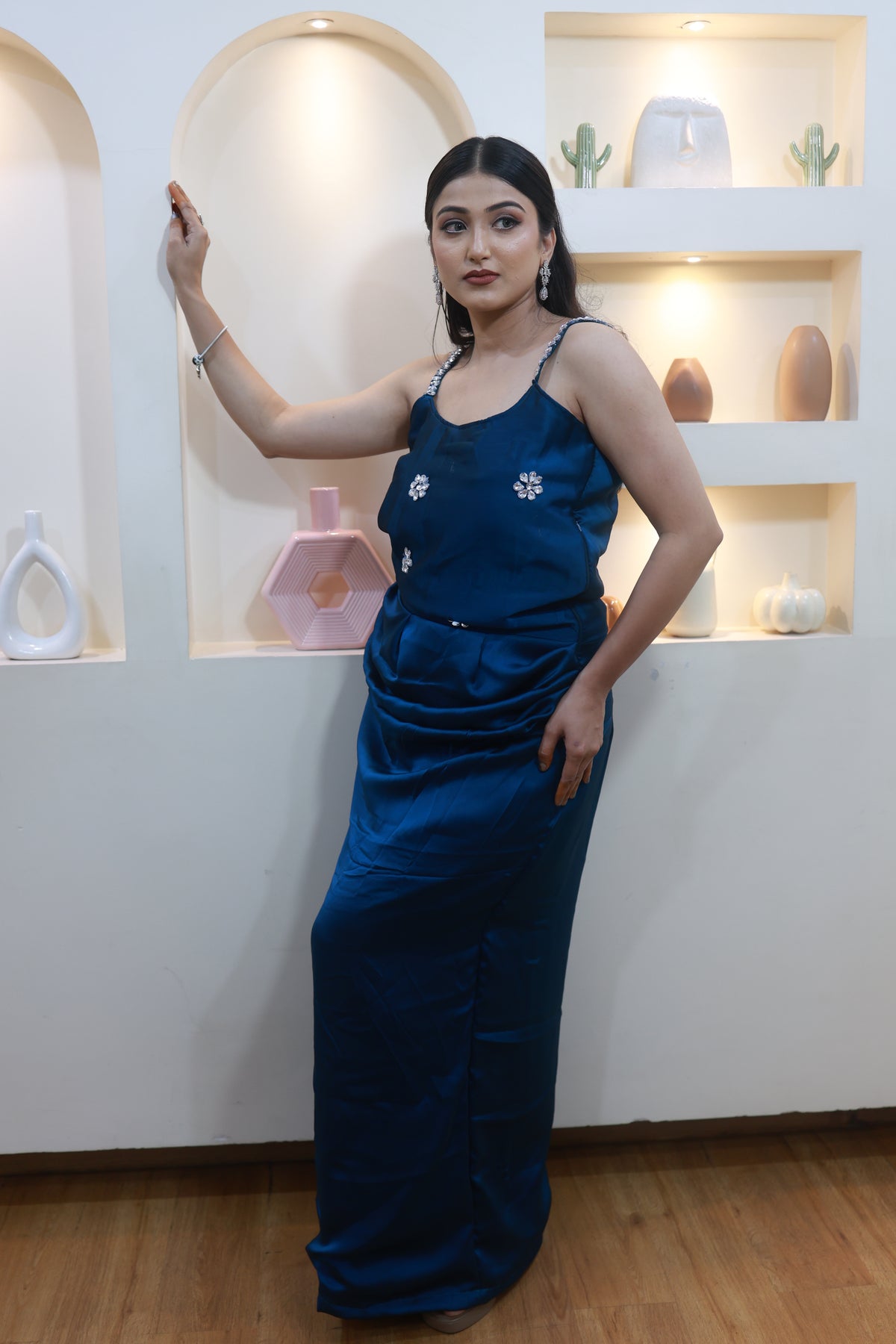 This stunning blue satin ensemble drapes beautifully along the body, creating a sleek, elongated silhouette. Delicate hand-embellished floral motifs add just the right touch of sparkle, while the crystal-detailed straps bring a soft, glamorous finish.