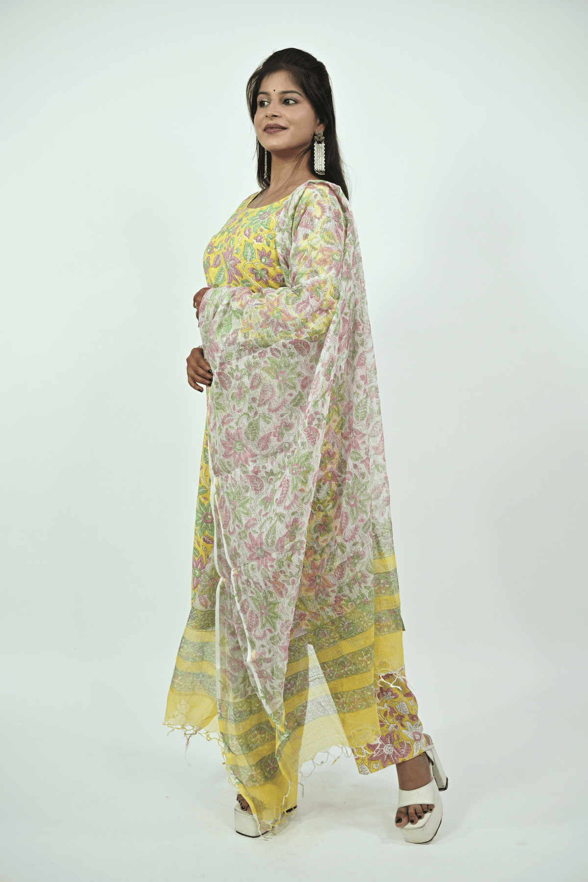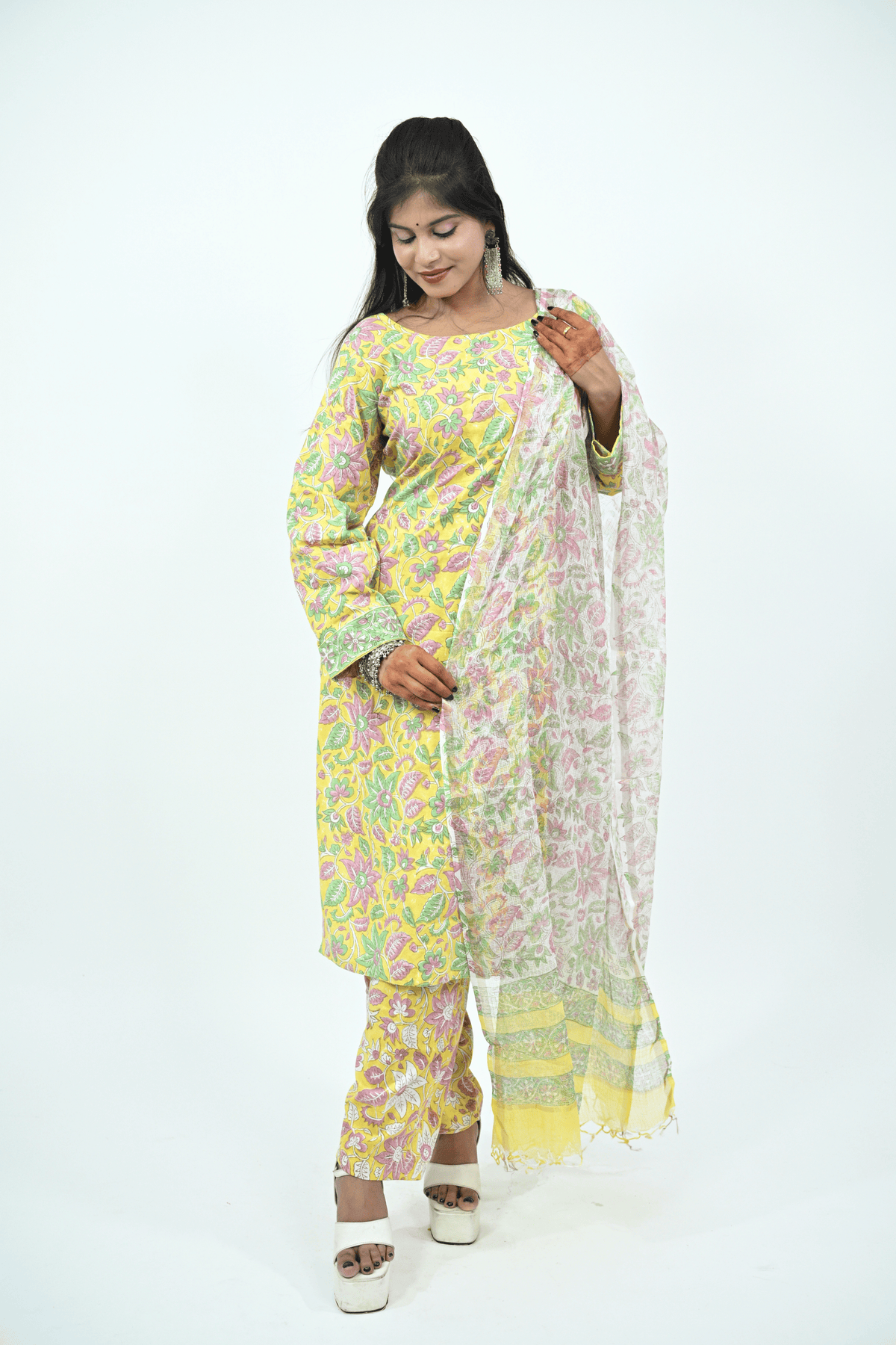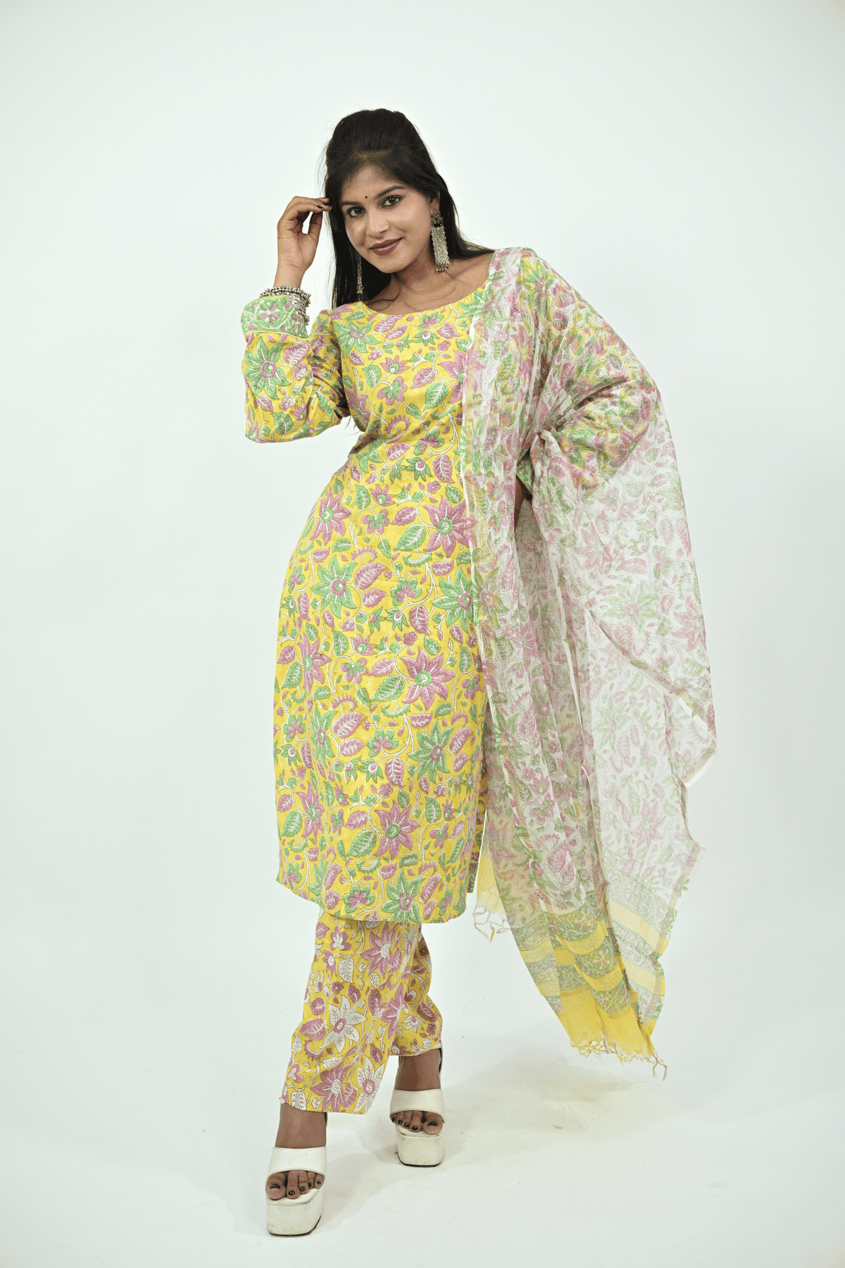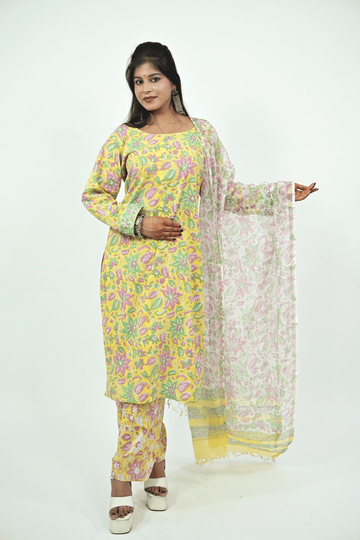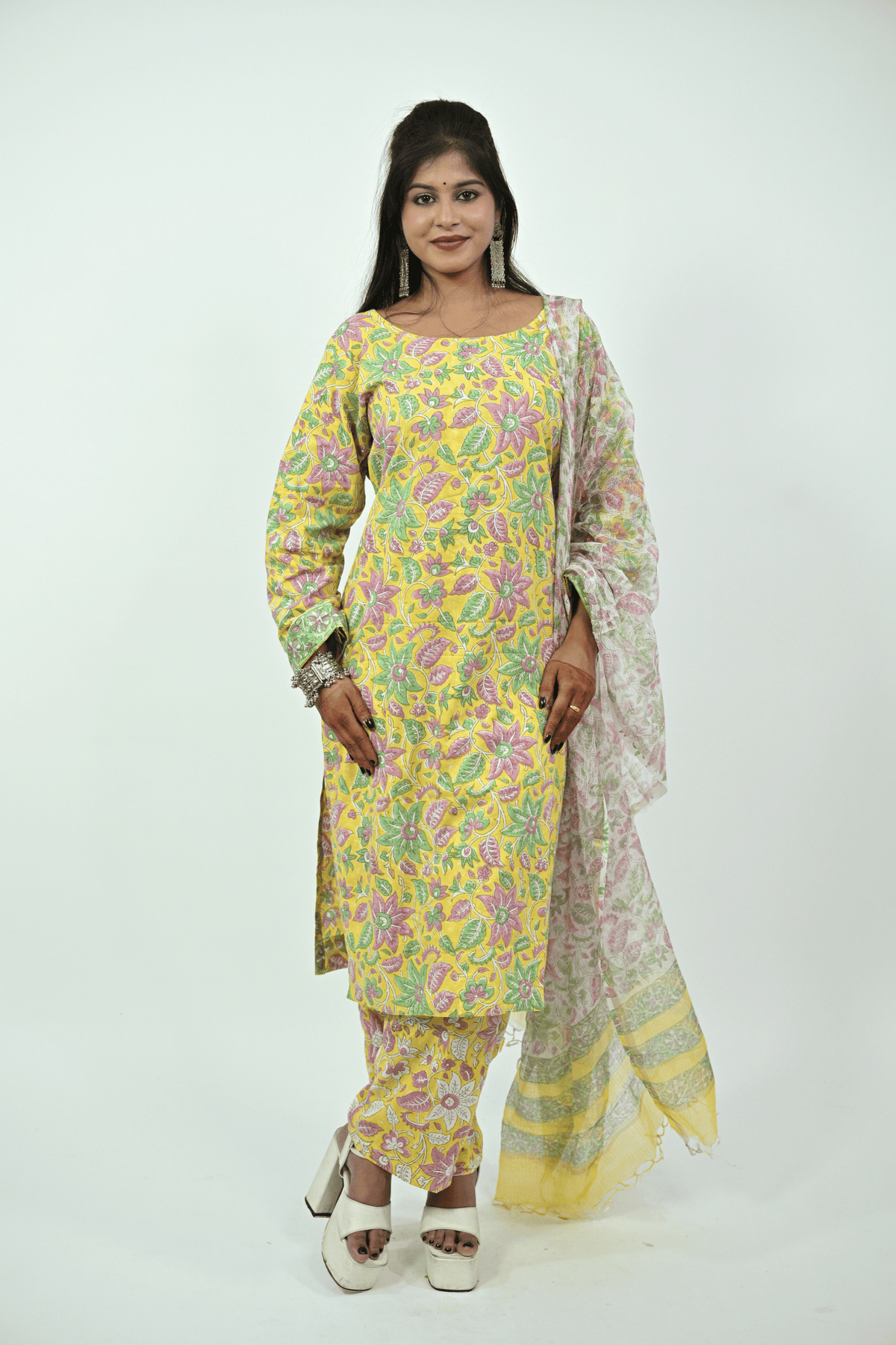 Brighten up your ethnic collection with this yellow multicolor batik printed cotton suit set. The kurti features full sleeves and a round neckline, beautifully decorated with floral batik patterns in pink and green shades. It is paired with matching printed cotton pants and a lightweight dupatta with soft floral prints and a pastel border. Crafted from breathable cotton, this suit set offers comfort with a vibrant touch, making it perfect for festive occasions, casual outings, or daily office wear.
