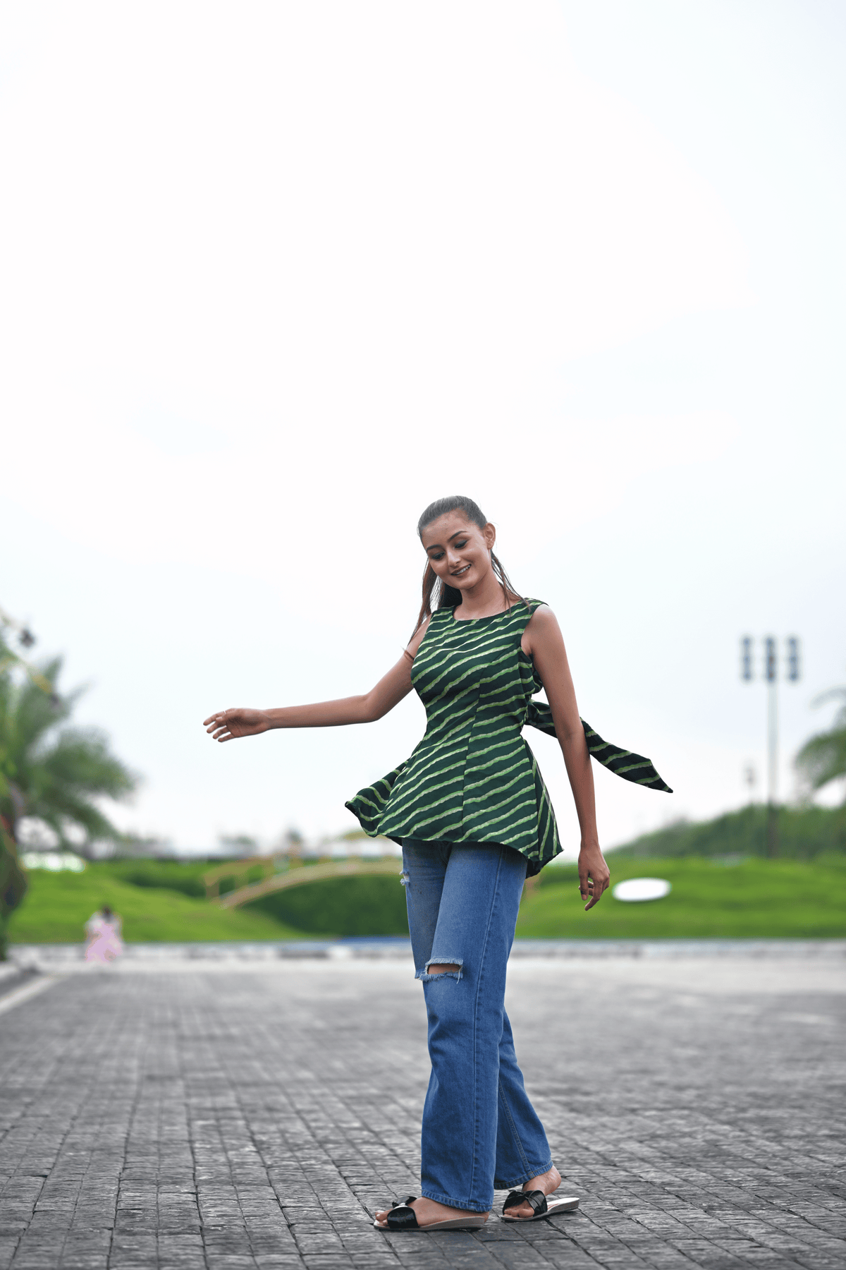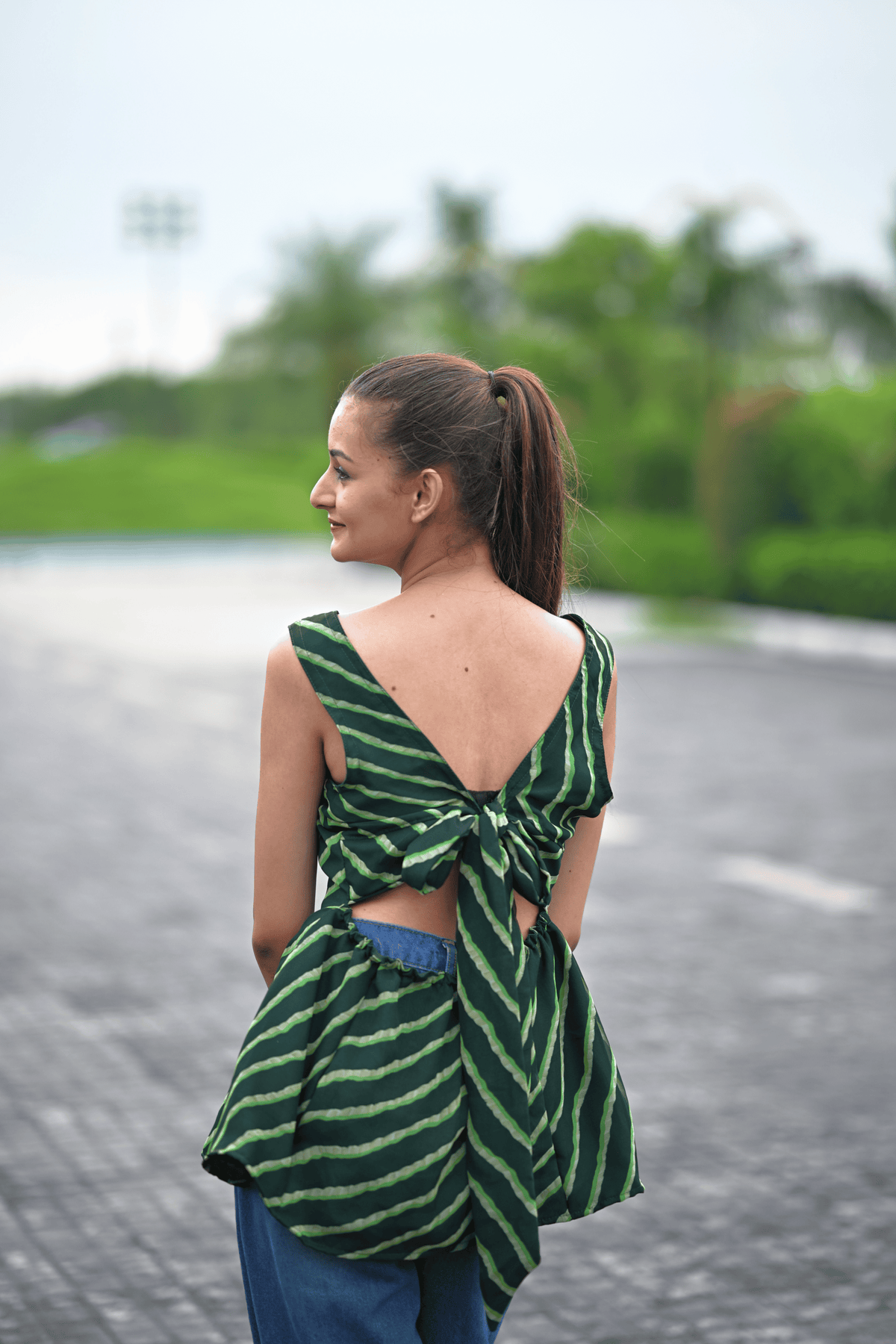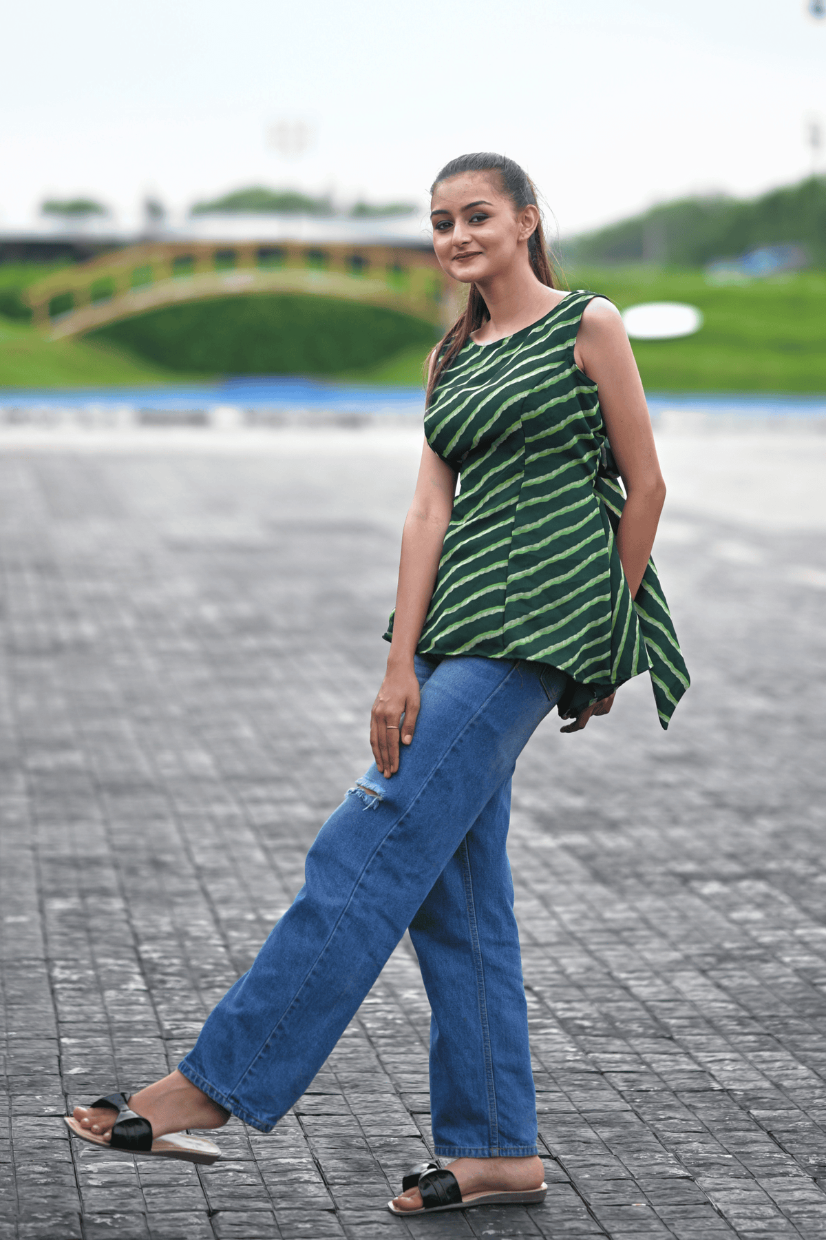 Celebrate the poetry of handcrafted tradition with the Harita Leheriya Tunic Top — where heritage meets effortless grace. Inspired by the fluidity of Rajasthan’s leheriya craft, this asymmetrical top in deep green is cut to flatter and flow.