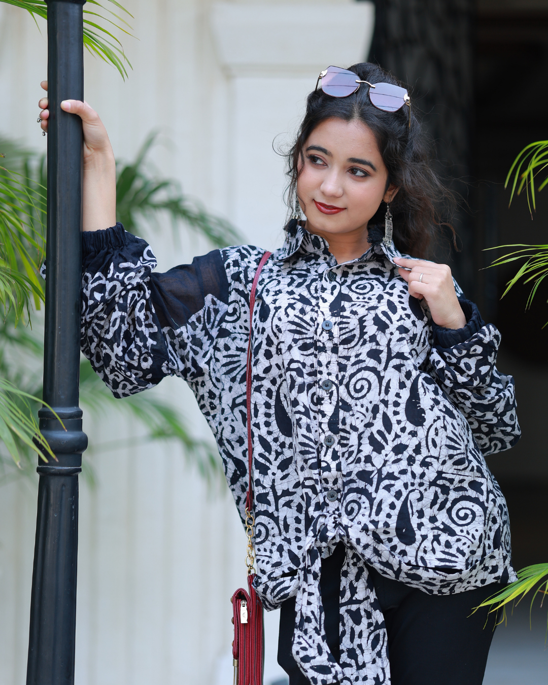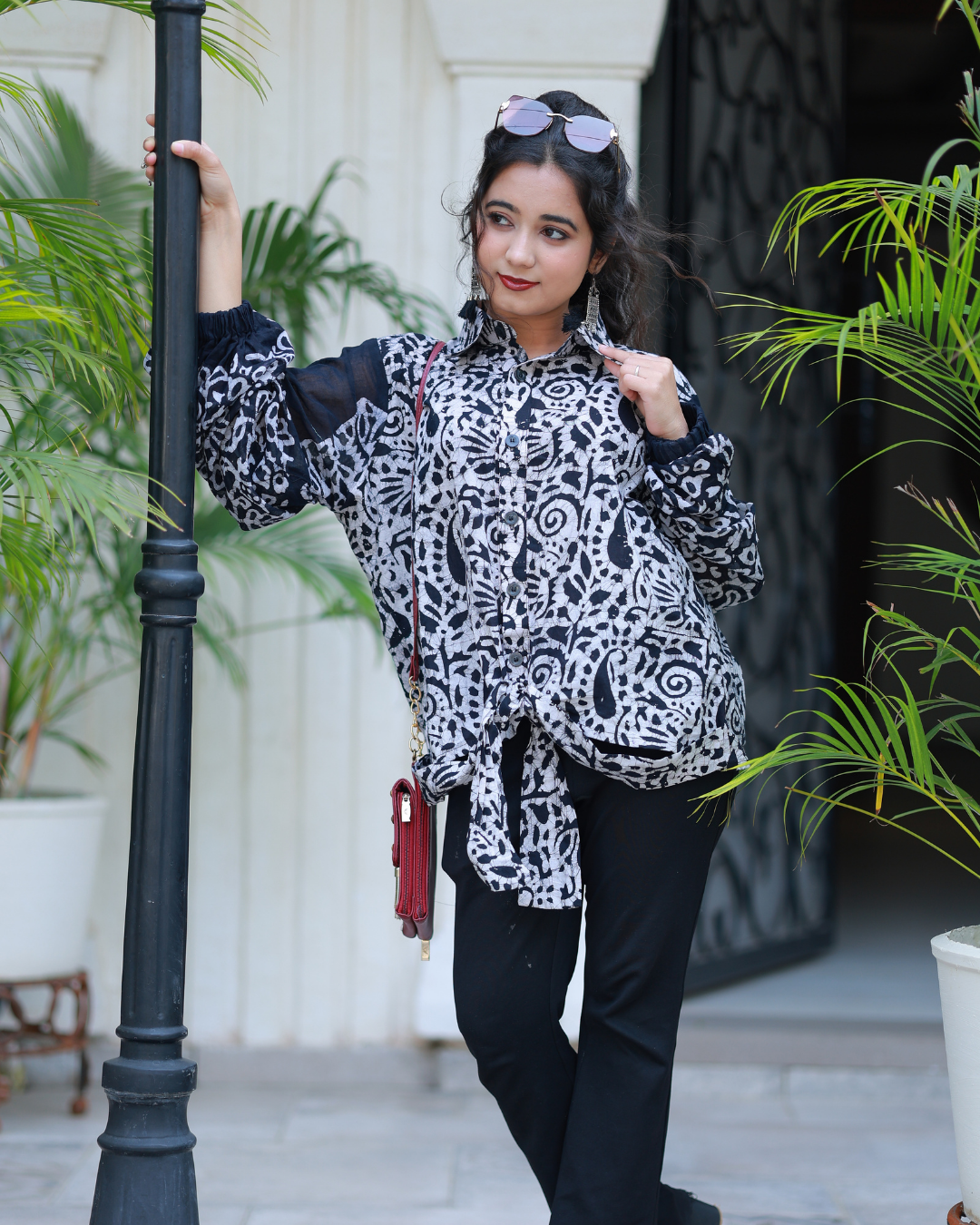 Bold, timeless, and effortlessly versatile, the Nisha Black Shirt brings together classic monochrome tones with heritage-inspired artistry. Designed in a striking black and ivory palette, the intricate motifs create a captivating visual contrast that adds character and sophistication to the piece.