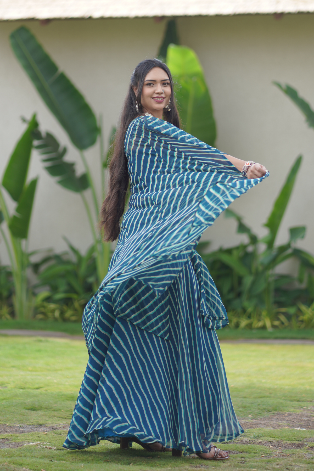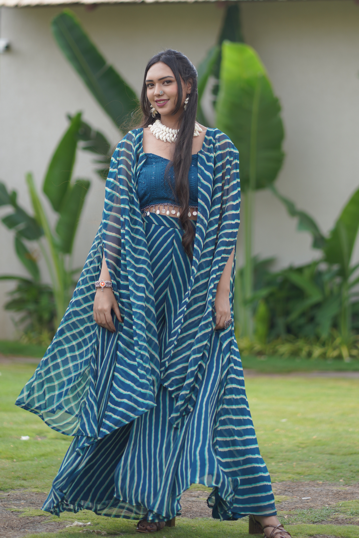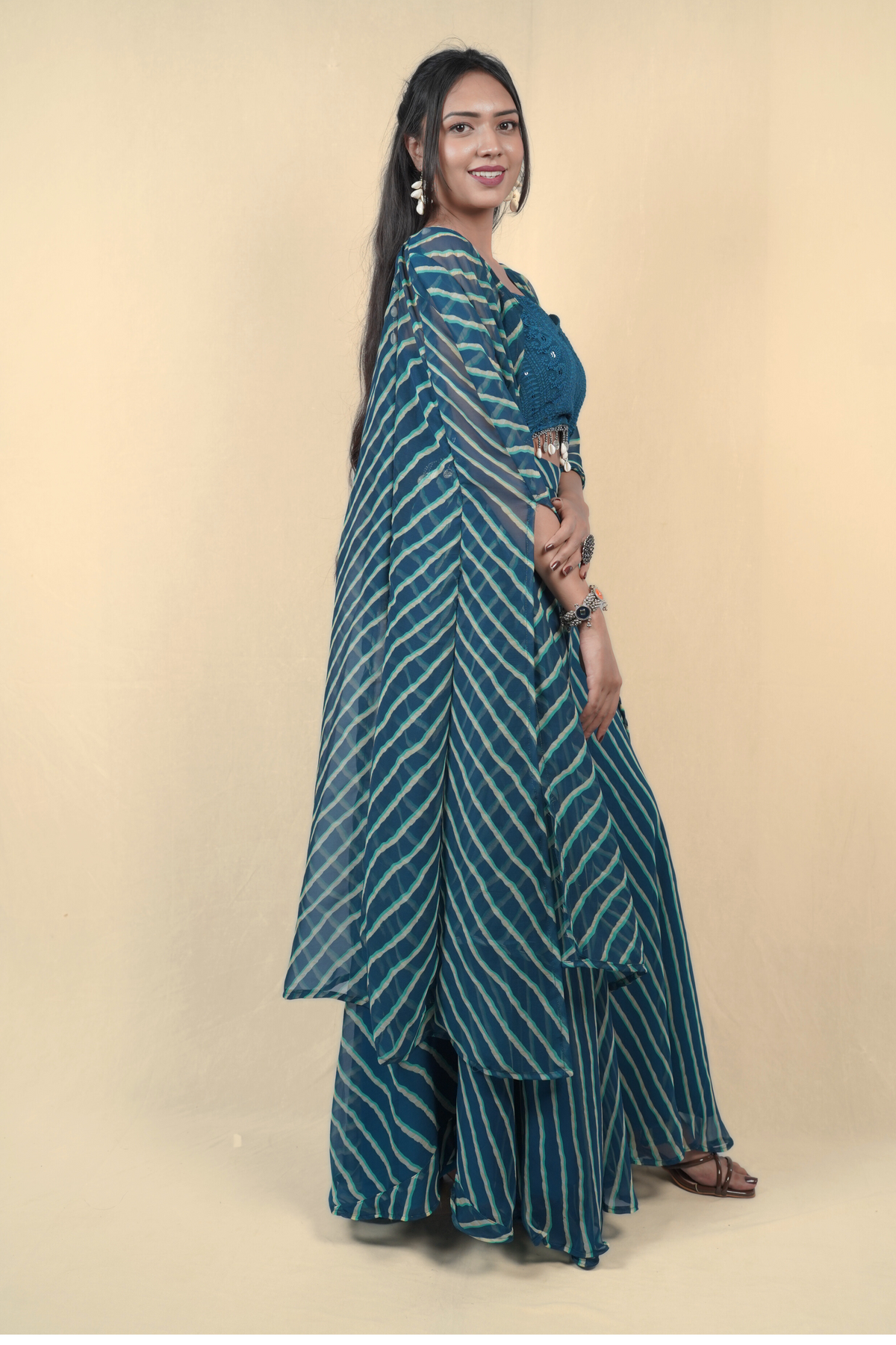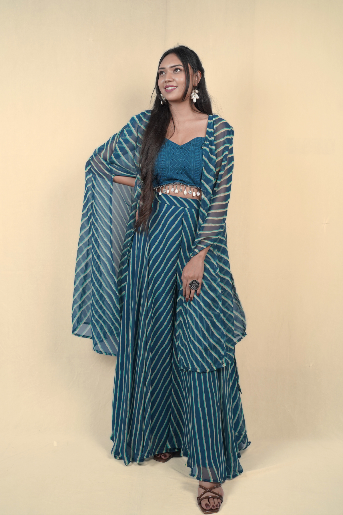 A 3-piece ensemble with mirror work over bright lehriya dye. Ideal for garba nights, Diwali parties, or pre-wedding functions.