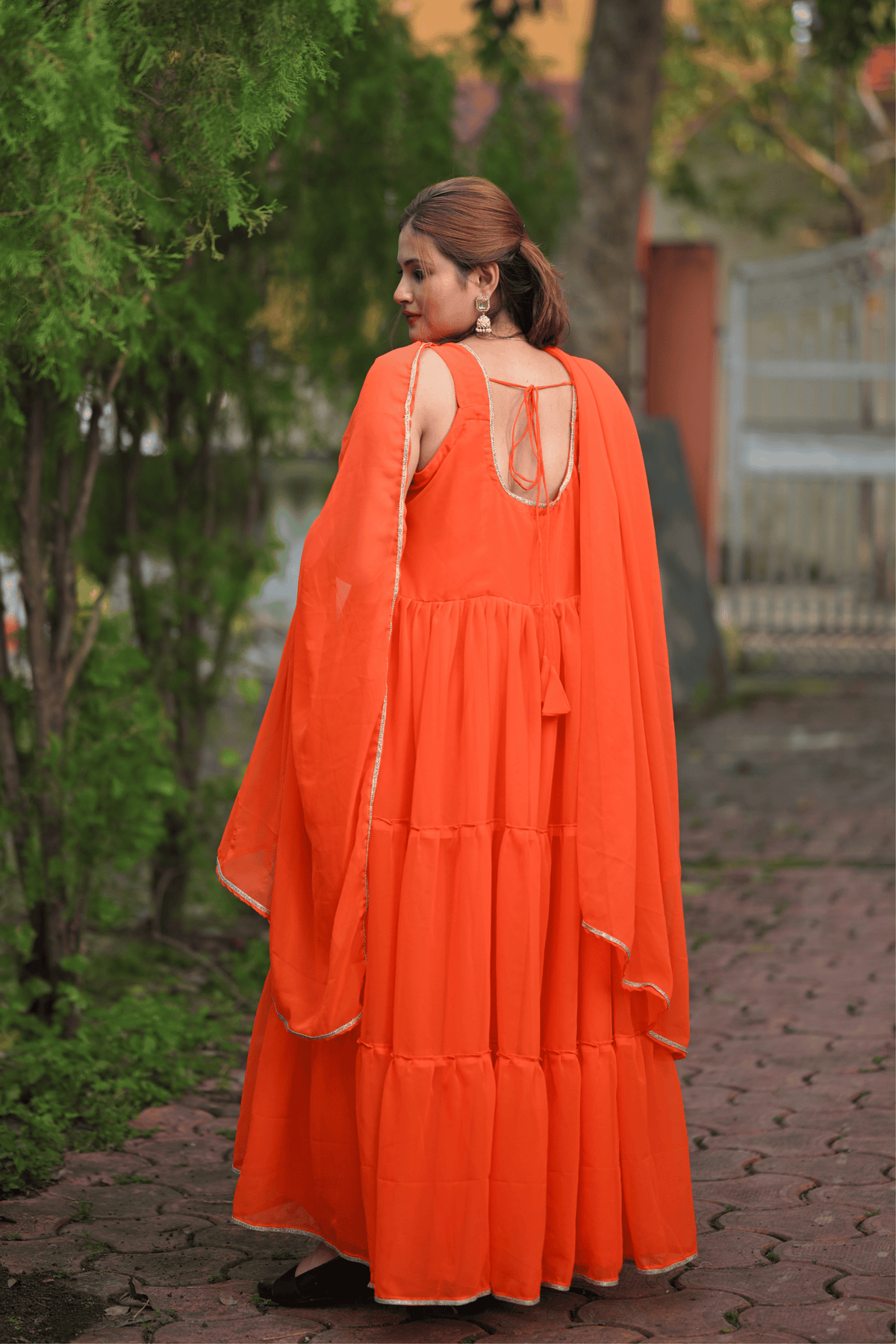 Step into festive elegance with our Aarvika Tiered Anarkali Suit, a vibrant celebration of tradition and style. This striking orange ensemble features a beautifully layered flare that adds graceful movement to every step. Crafted from lightweight georgette, it drapes effortlessly, while the minimal golden lace detailing elevates its charm. Paired with a matching dupatta, this outfit is perfect for festive gatherings, daytime celebrations, or special occasions where you want to stand out with simplicity and sophistication.