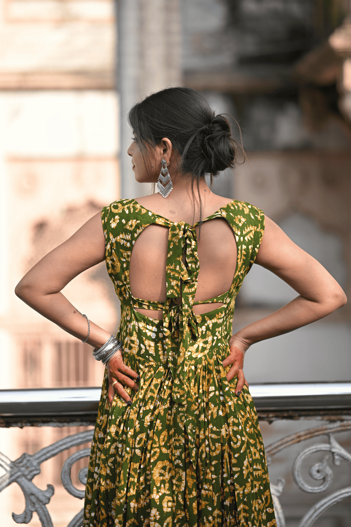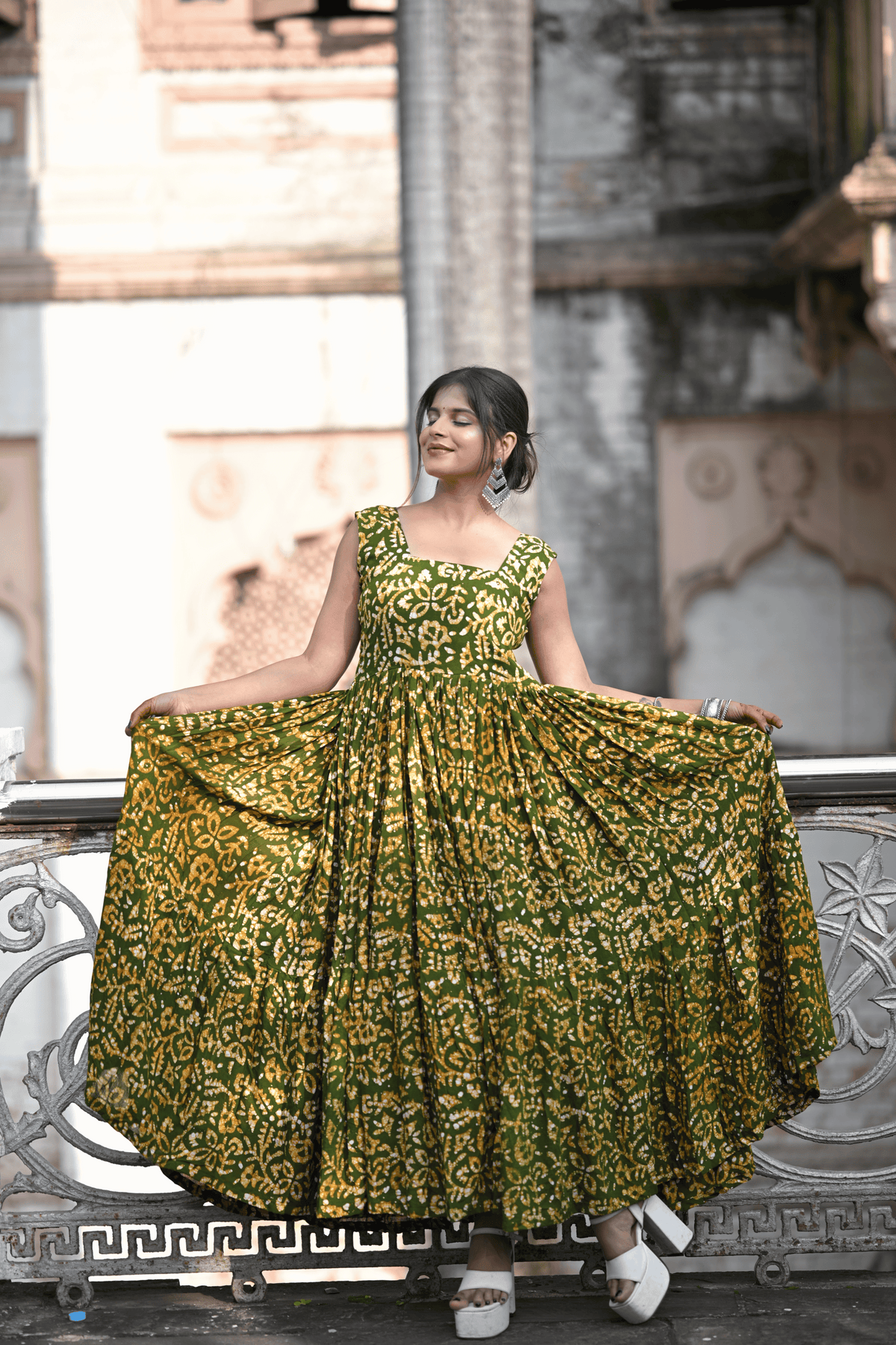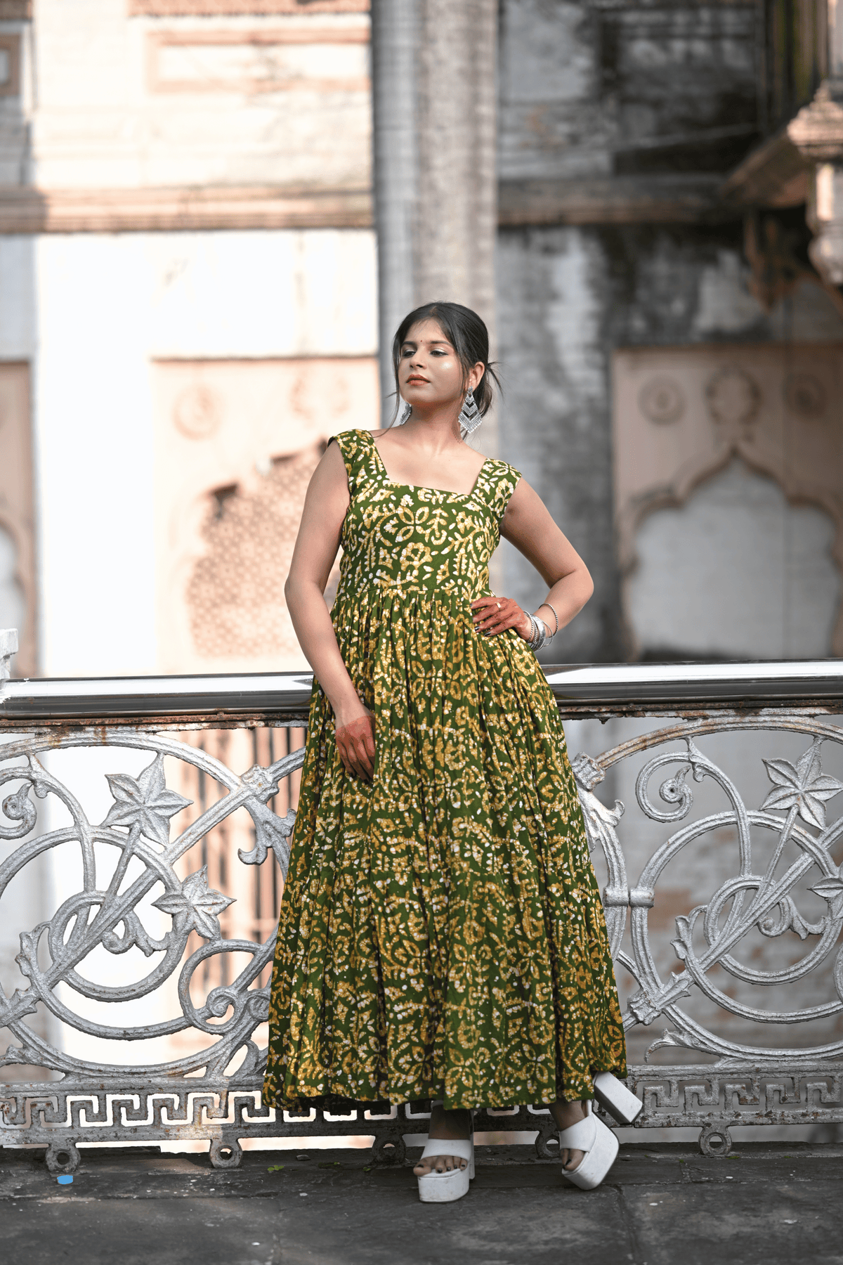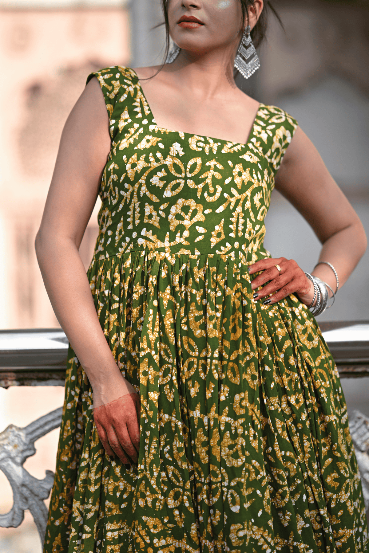 Step into timeless elegance with this enchanting Bherugarh Batik one-piece suit, crafted in a rich green base with mustard-yellow batik motifs. The flared silhouette and sleeveless square-neck design bring out a graceful and contemporary charm while staying rooted in traditional artistry. Light, breezy, and effortlessly stylish, this dress is perfect for festive gatherings, casual outings, or cultural celebrations.