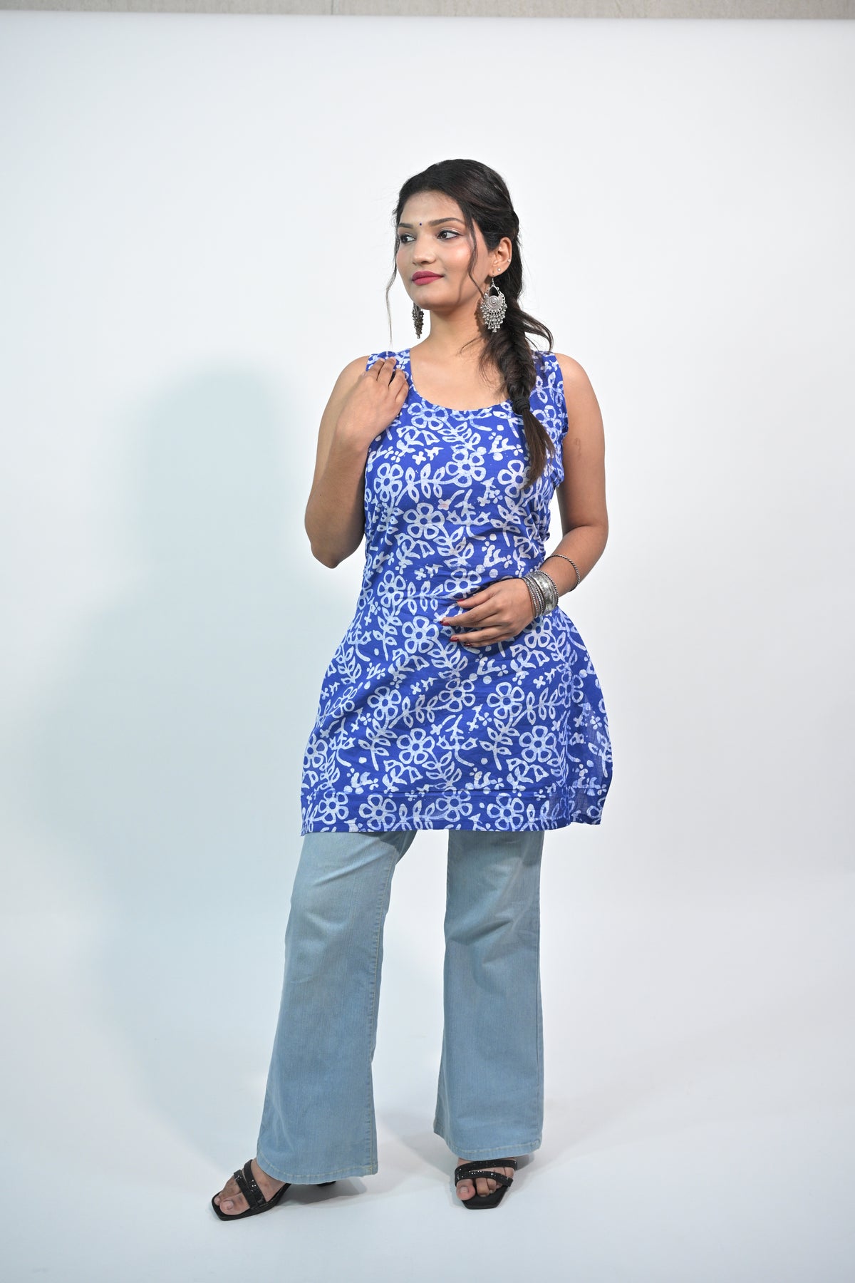 Brighten up your wardrobe with this blue and white batik printed cotton kurti. Featuring a sleeveless design with a straight cut, this kurti combines traditional batik art with a modern casual look. The lightweight cotton fabric ensures comfort and breathability, perfect for daily wear.
