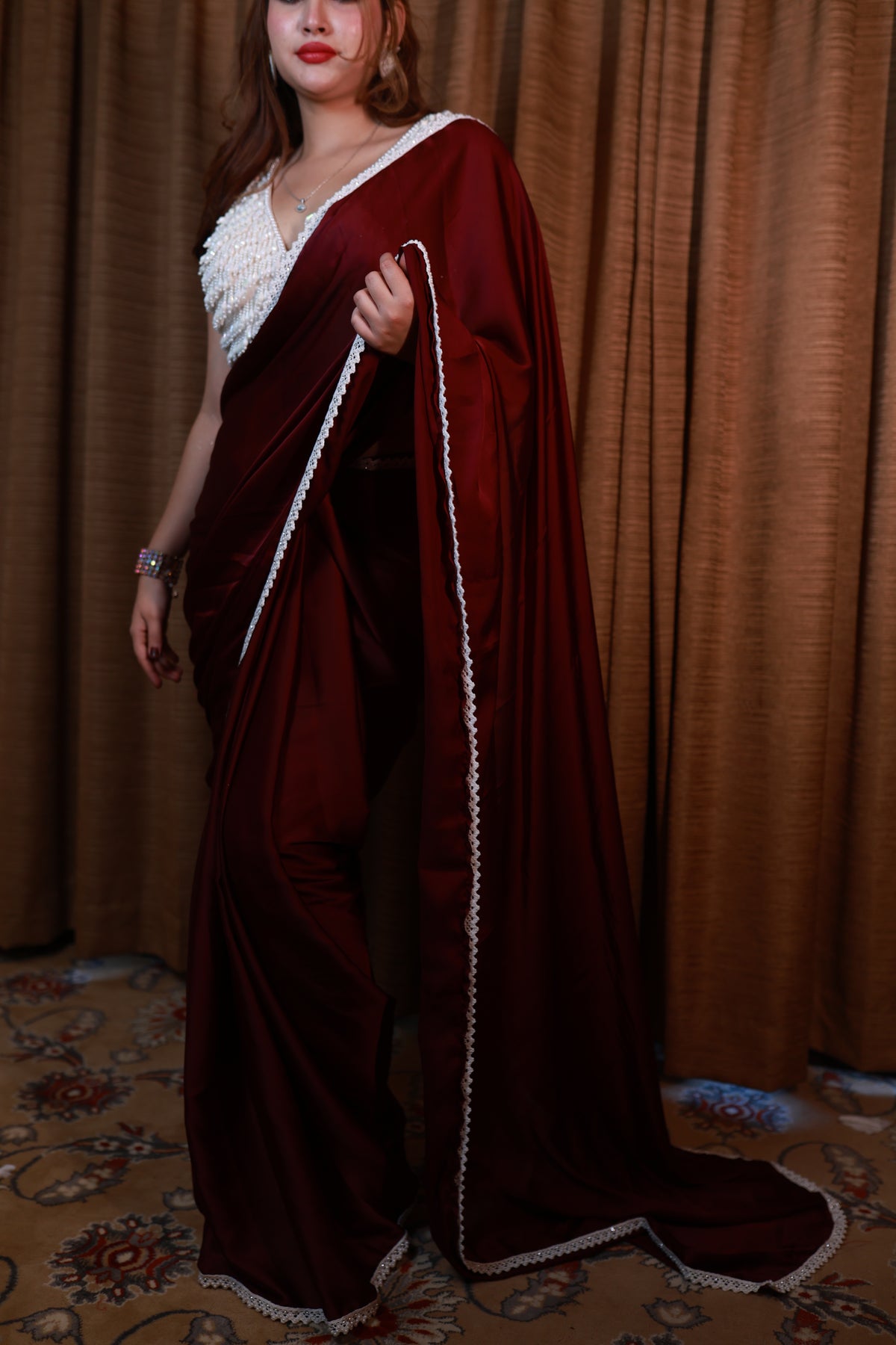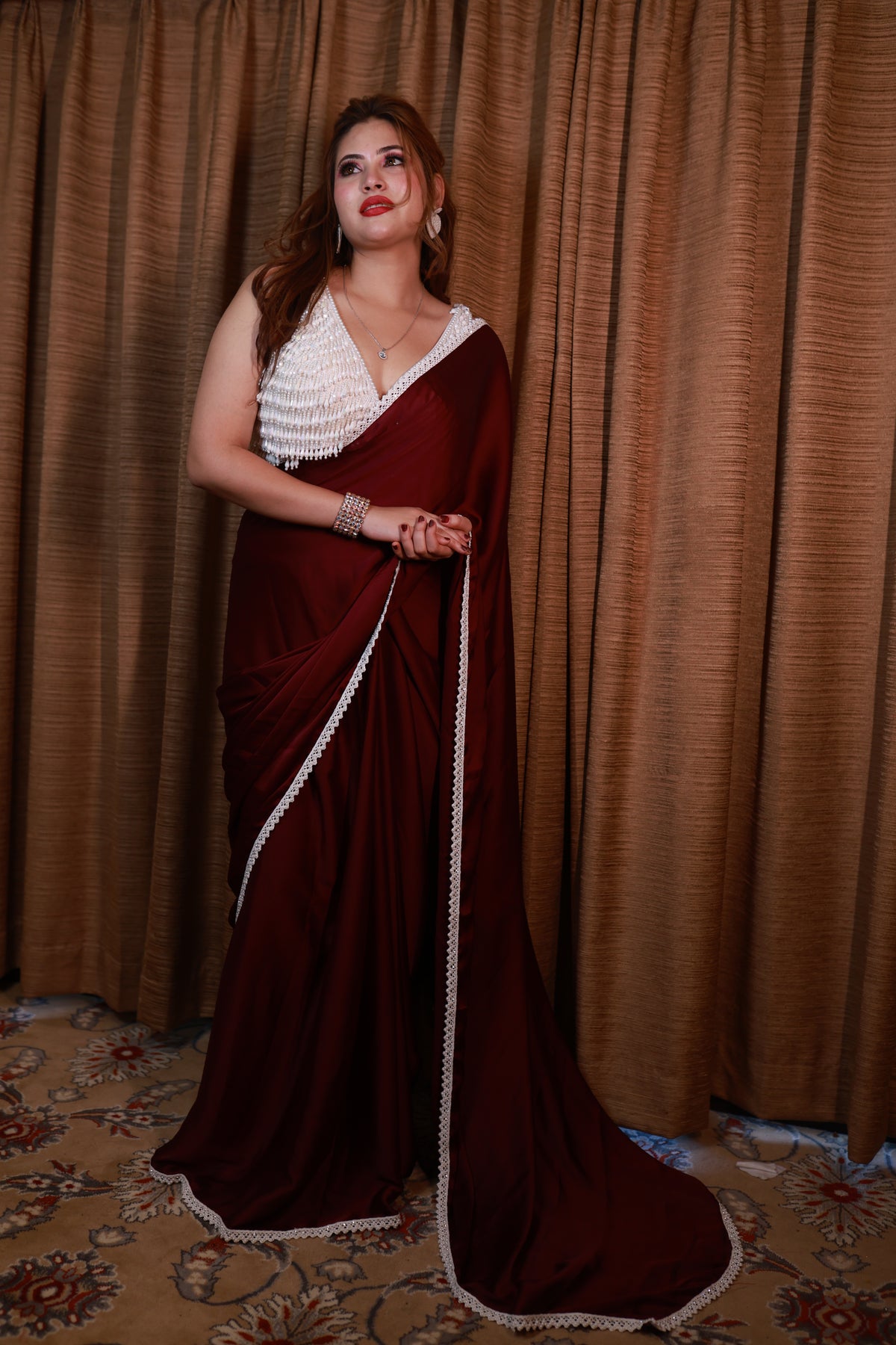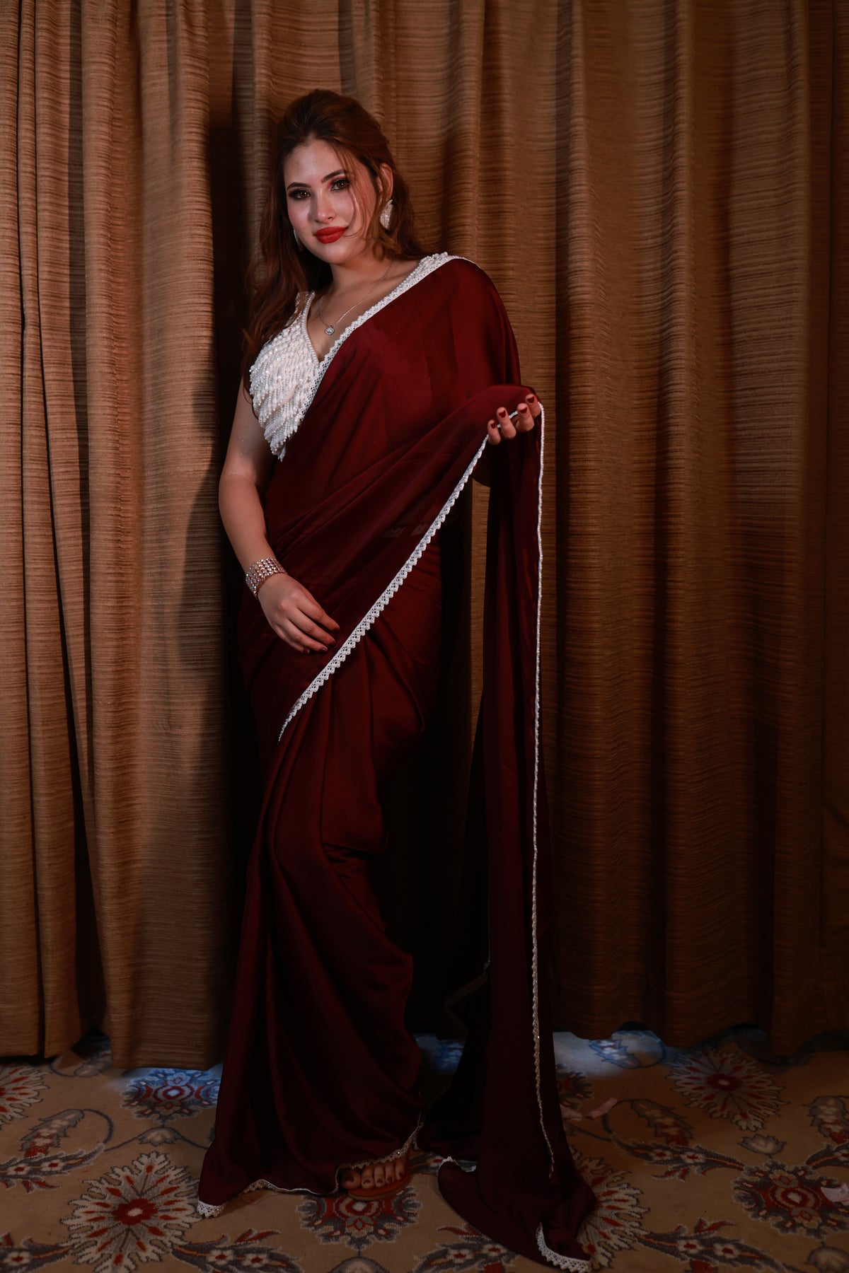 Celestia Crimson Drift is crafted in a deep celestial maroon, a shade that carries warmth, power, and timeless allure. The lightweight drape flows effortlessly with every step, while the delicately hand-embellished blouse adds a soft, luminous contrast. Completed with a refined pearl-inspired border, this saree embodies celestial luxury with grounded femininity.