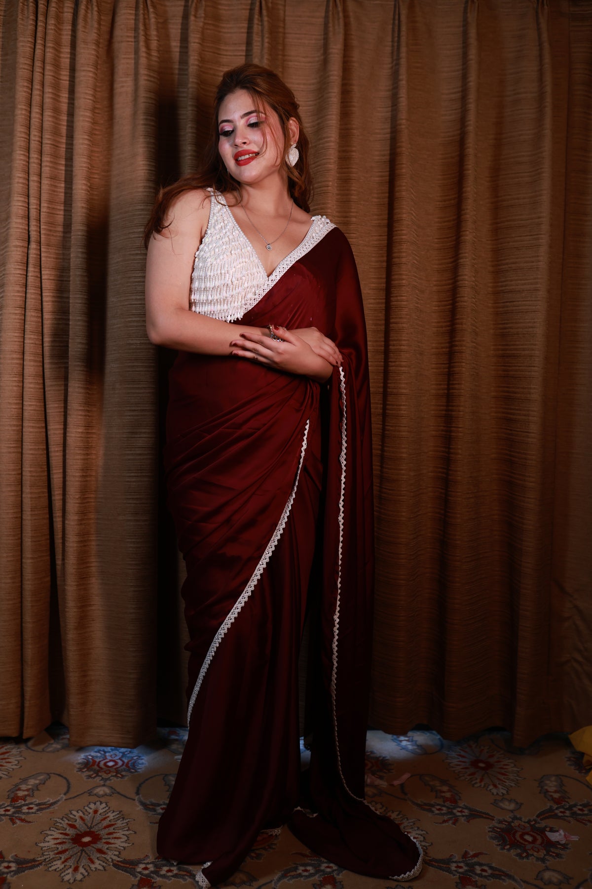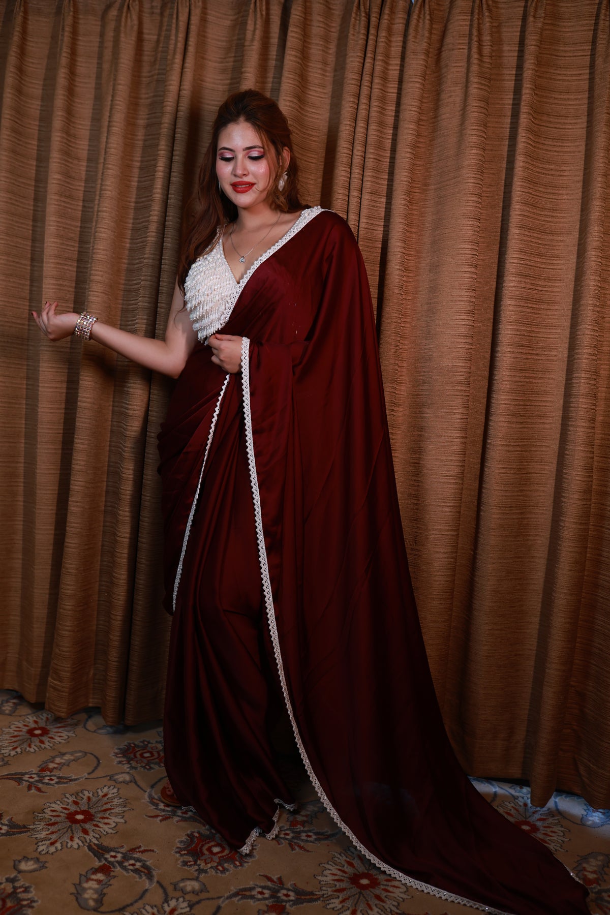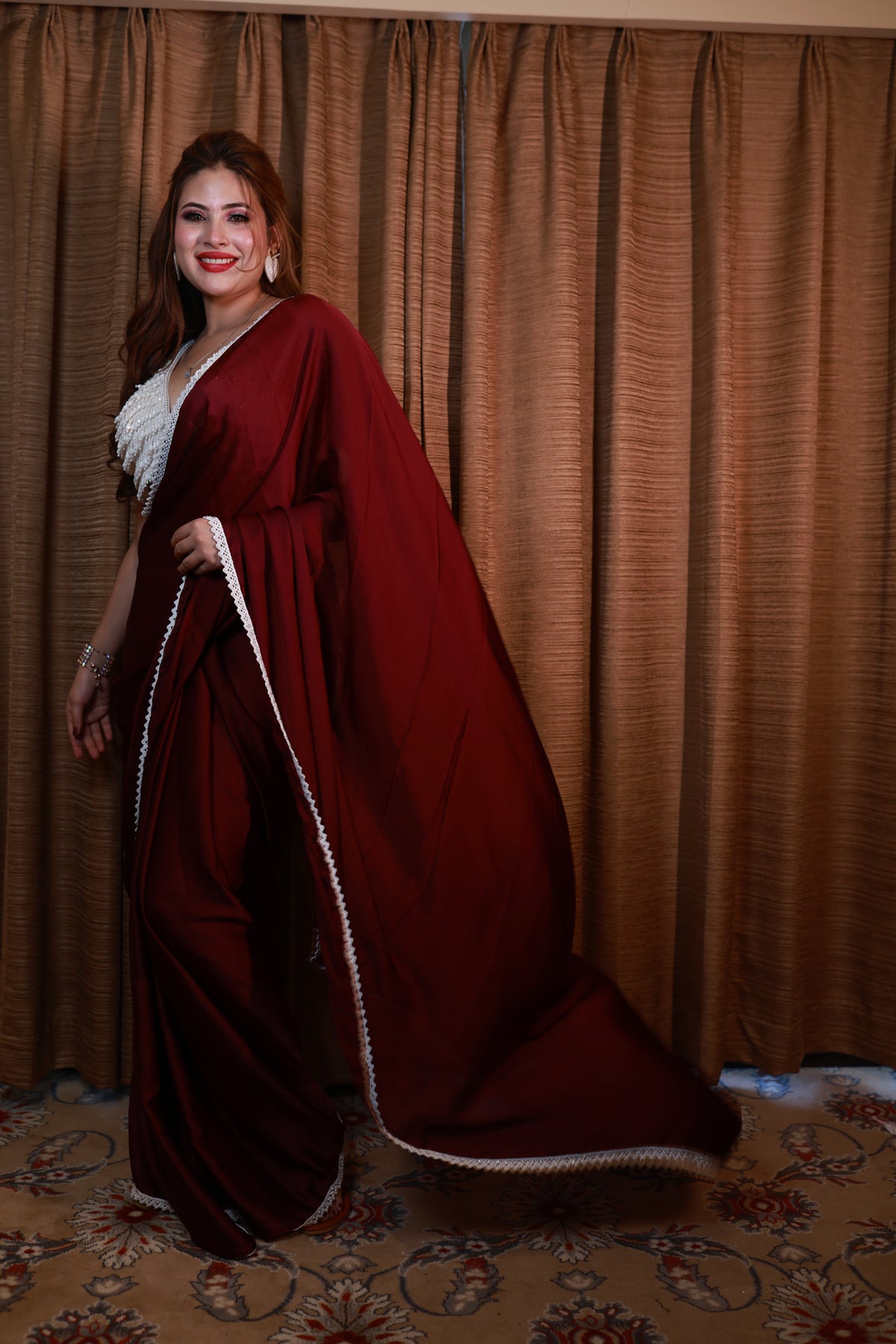 Celestia Crimson Drift is crafted in a deep celestial maroon, a shade that carries warmth, power, and timeless allure. The lightweight drape flows effortlessly with every step, while the delicately hand-embellished blouse adds a soft, luminous contrast. Completed with a refined pearl-inspired border, this saree embodies celestial luxury with grounded femininity.