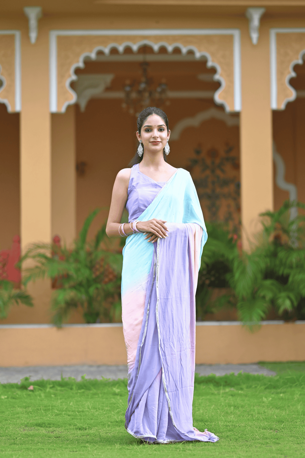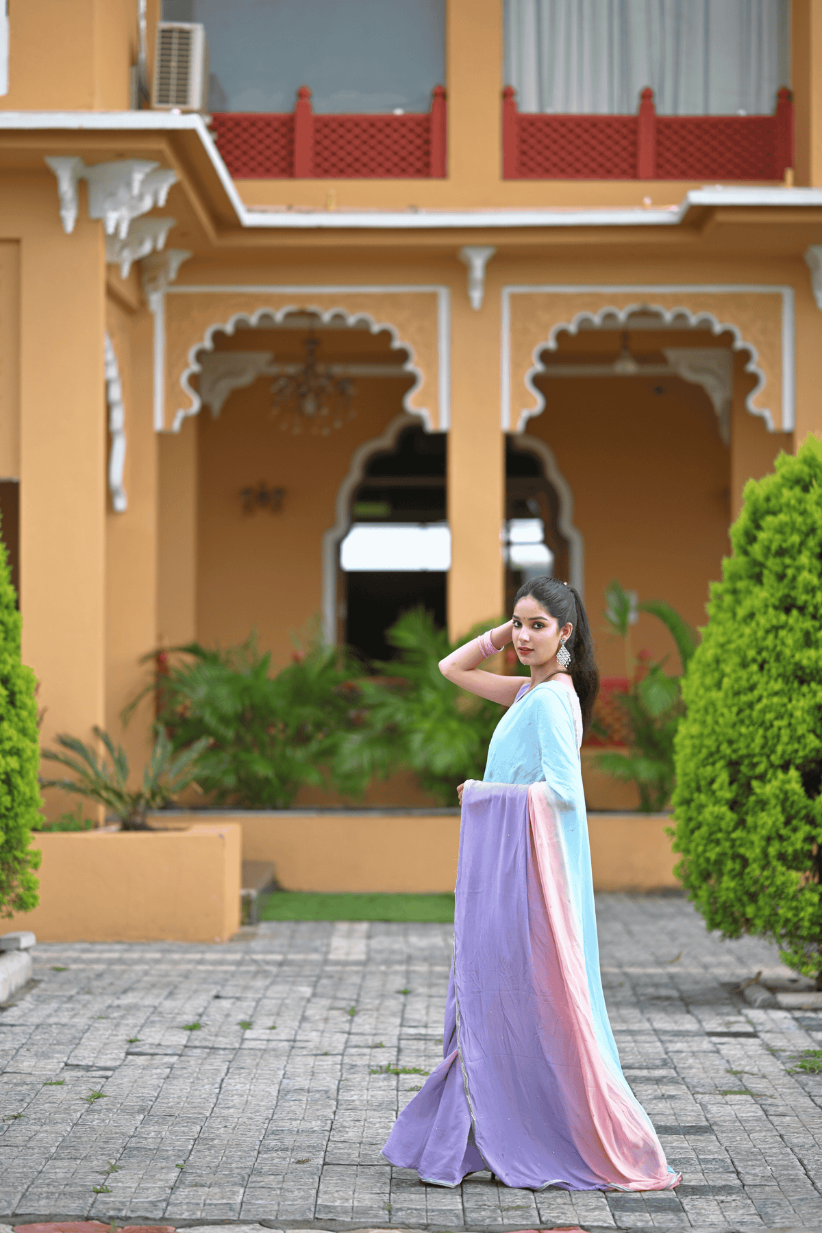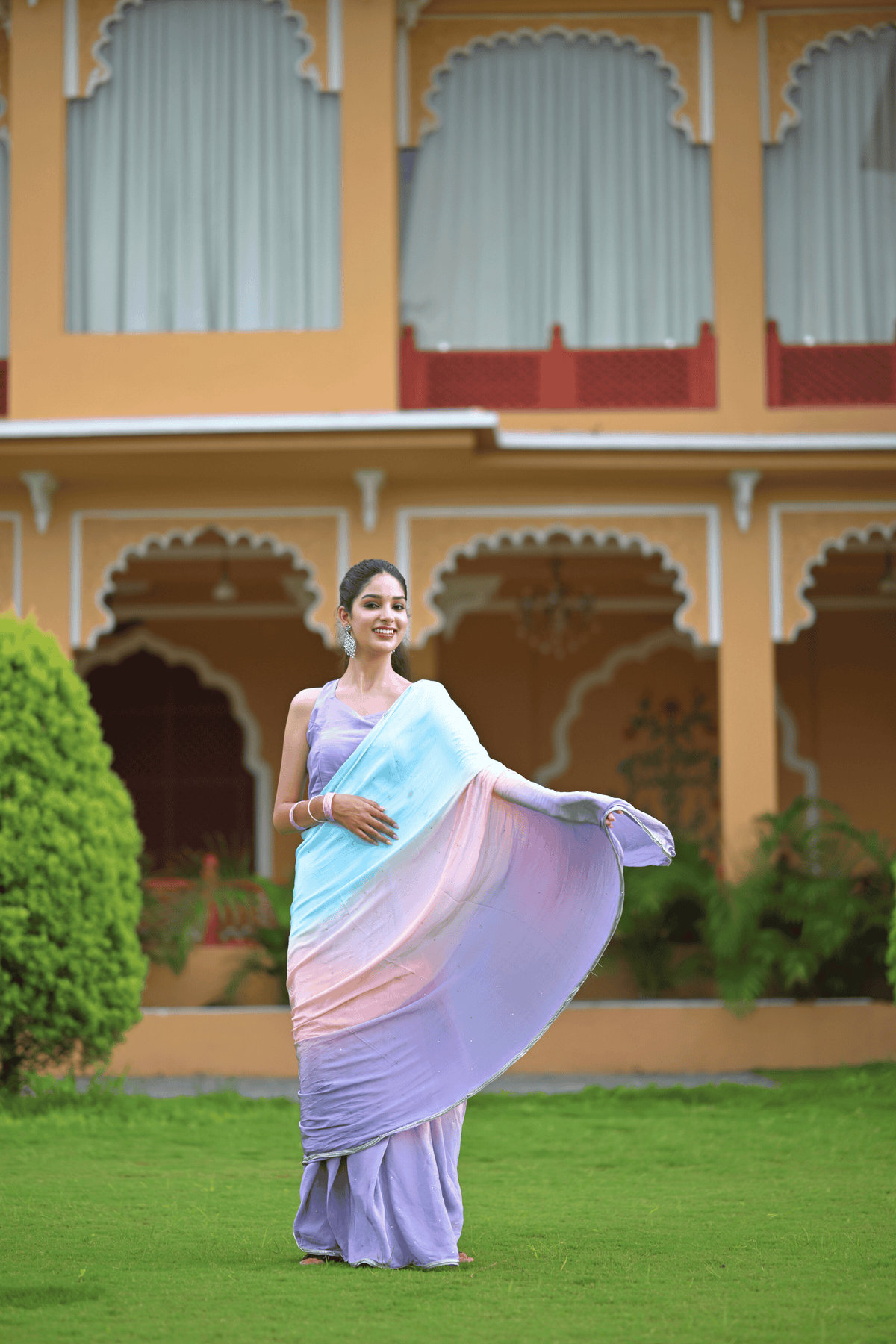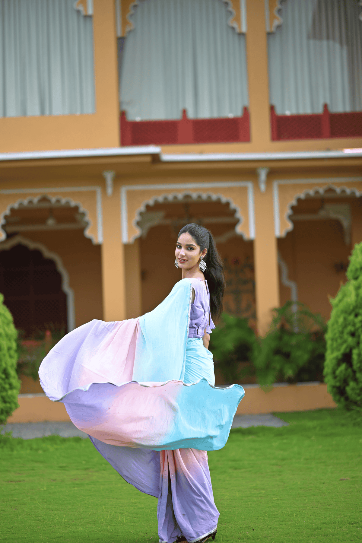 Graceful, ethereal, and effortlessly elegant this pastel multicolor saree is a vision of soft femininity and calm sophistication. Draped in hues of lavender, baby blue, and blush pink, the saree captures the gentle transitions of a springtime sky at dusk. Crafted from a flowing, lightweight fabric, it falls delicately around the body, creating a flattering silhouette that feels as heavenly as it looks.