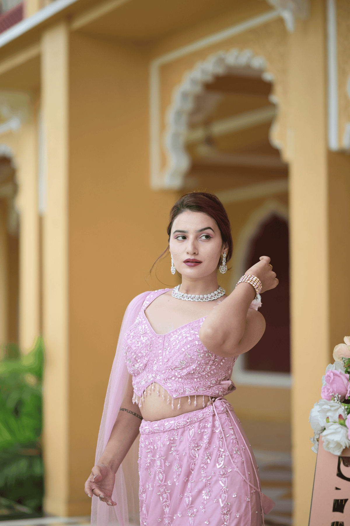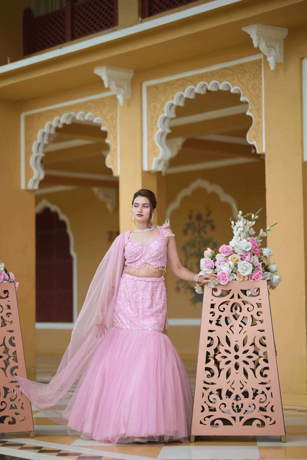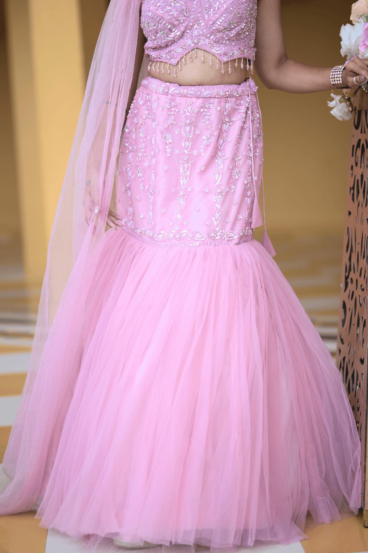 Soft as a dream and bold in spirit, Gulaabi Baadal is a whimsical mermaid-style lehenga that blends fairytale elegance with contemporary charm. Designed in a delicate blush pink hue, this outfit feels like a walk through clouds light, romantic, and gracefully feminine. The fitted silhouette hugs the body and flares into a dramatic tulle base, adding an enchanting volume that’s perfect for twirls, entrances, and picture-perfect moments.