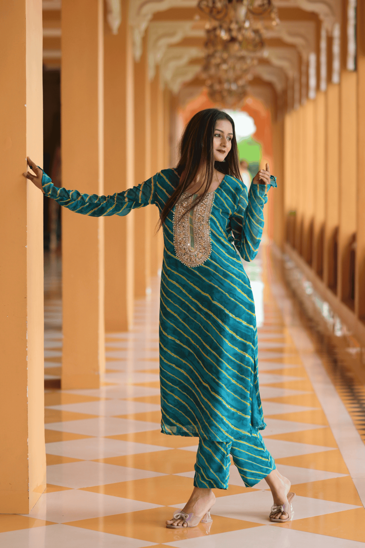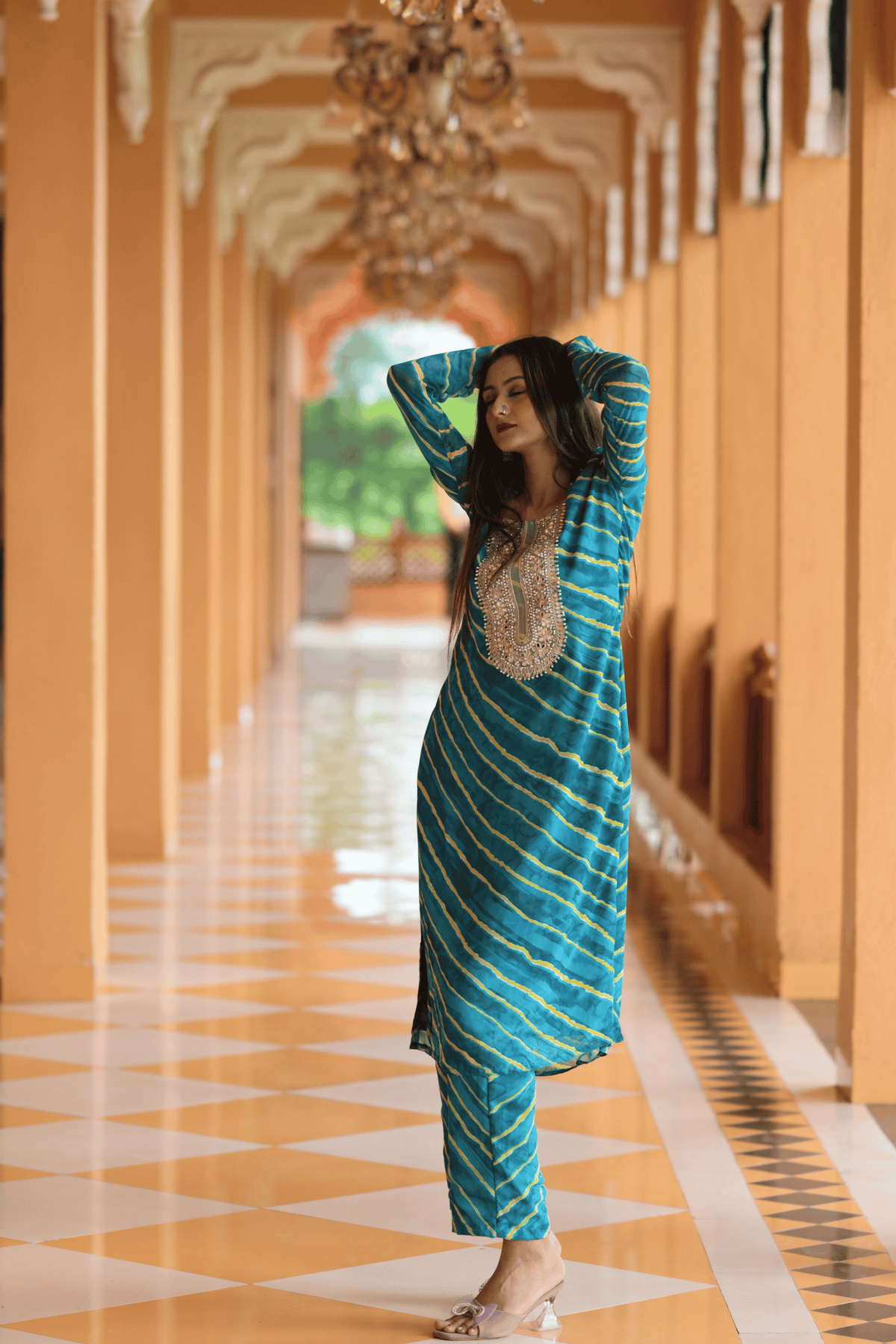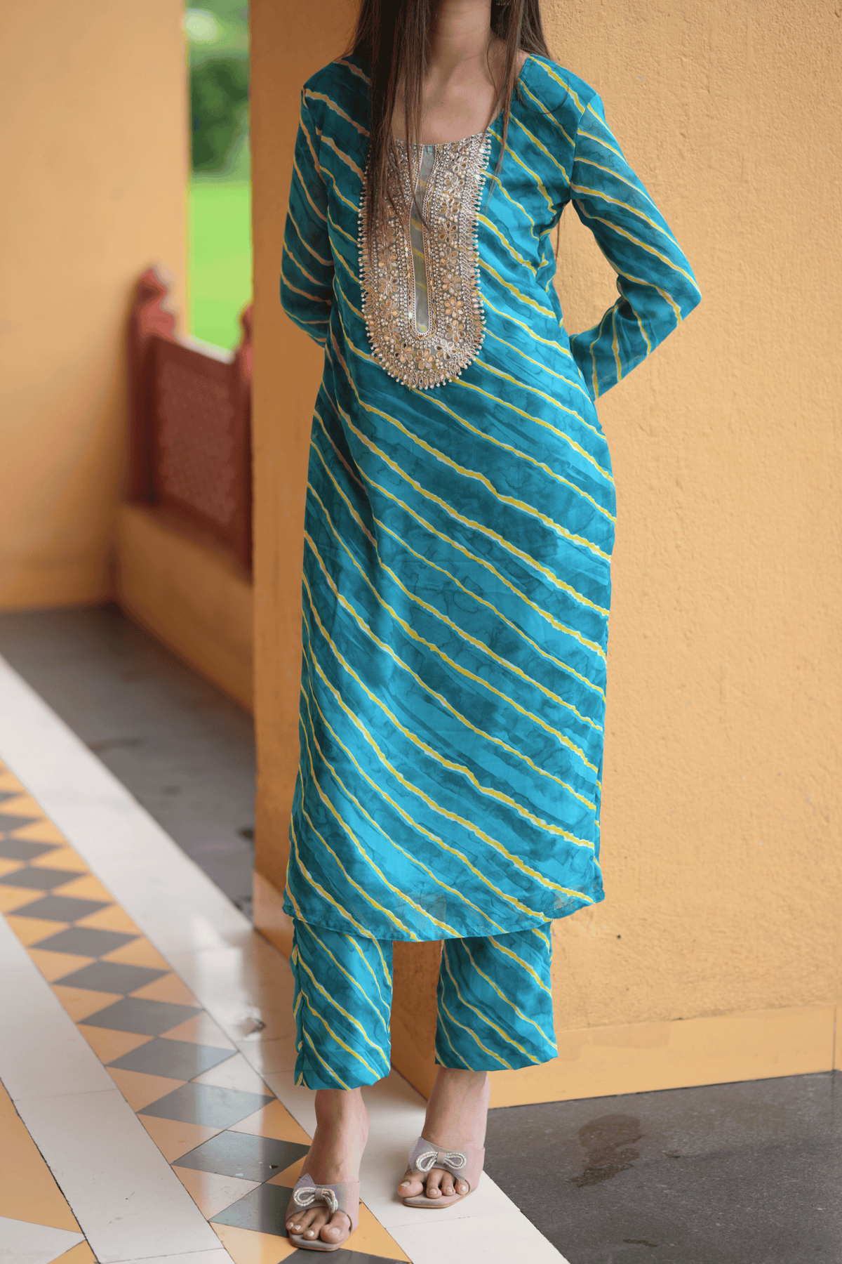 Embrace serene elegance with Sukkoon’s Neelkanth Lehariya Kurta Set. Inspired by the calm hues of peacock feathers, this outfit features a striking teal-blue base adorned with golden lehariya stripes. The intricately embroidered yoke adds a touch of regal charm, making it perfect for festive occasions or elegant evening gatherings.