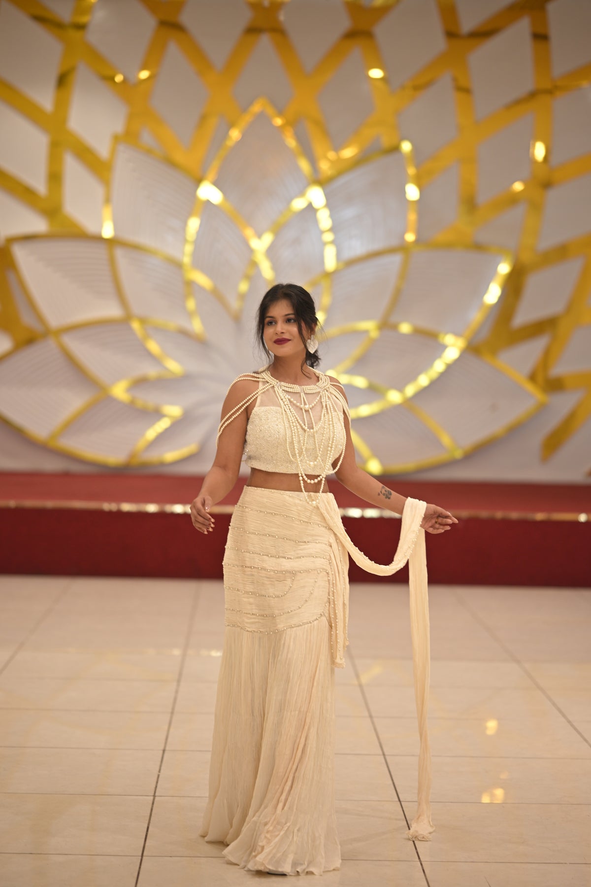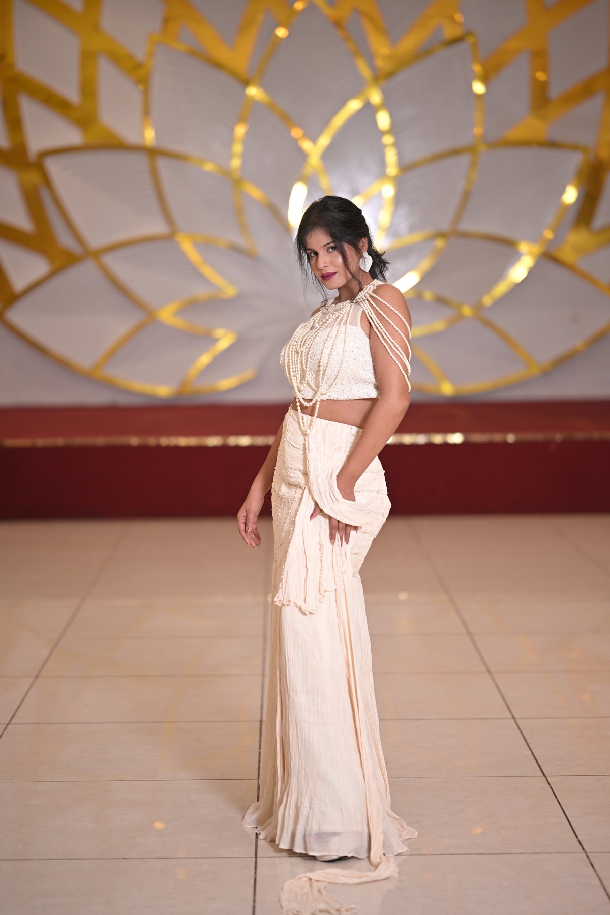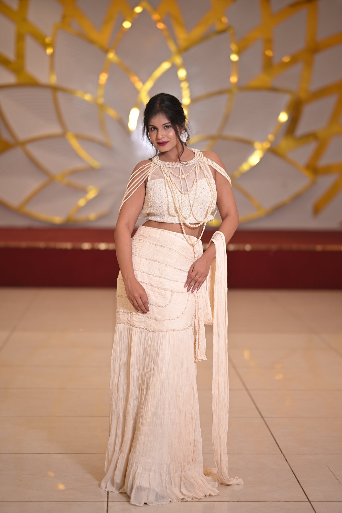 Evoke timeless grace with the Motiya Nazakat Saree, a soft ivory-beige creation adorned with delicate pearl embellishments that exude sophistication. The intricately beaded blouse paired with cascading pearl strands adds a touch of vintage glamour, making this ensemble perfect for receptions, cocktail evenings, and grand festive occasions. With its understated luxury and ethereal charm, this saree is a statement of refined femininity.