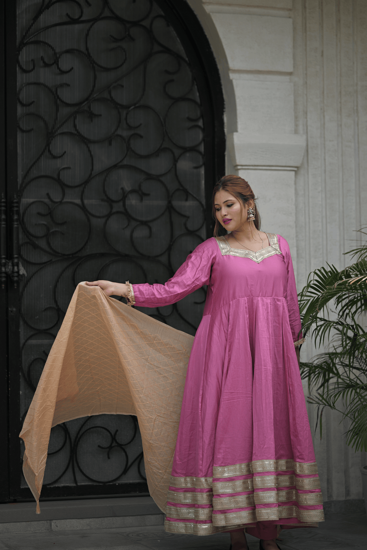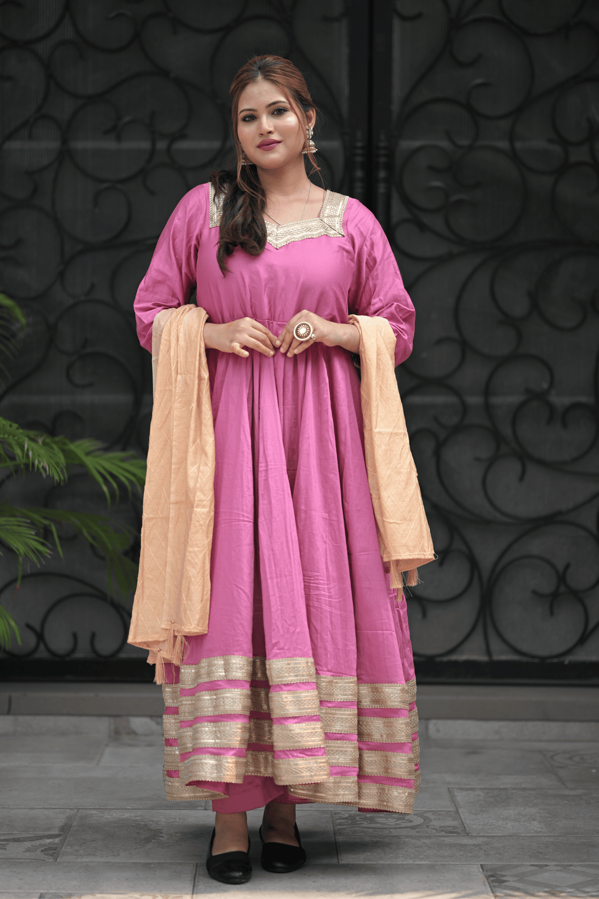 Step into timeless charm with our Nayra Pink Anarkali Suit, a perfect blend of classic elegance and festive grace. This beautiful outfit features a flattering flare with intricate golden borders that add a regal touch to your look. Crafted from soft and flowy fabric, it ensures both comfort and sophistication, while the subtle pink tone makes it ideal for both day and evening occasions. Paired with a contrasting beige dupatta, this suit is perfect for festive celebrations, traditional gatherings, or special family events.