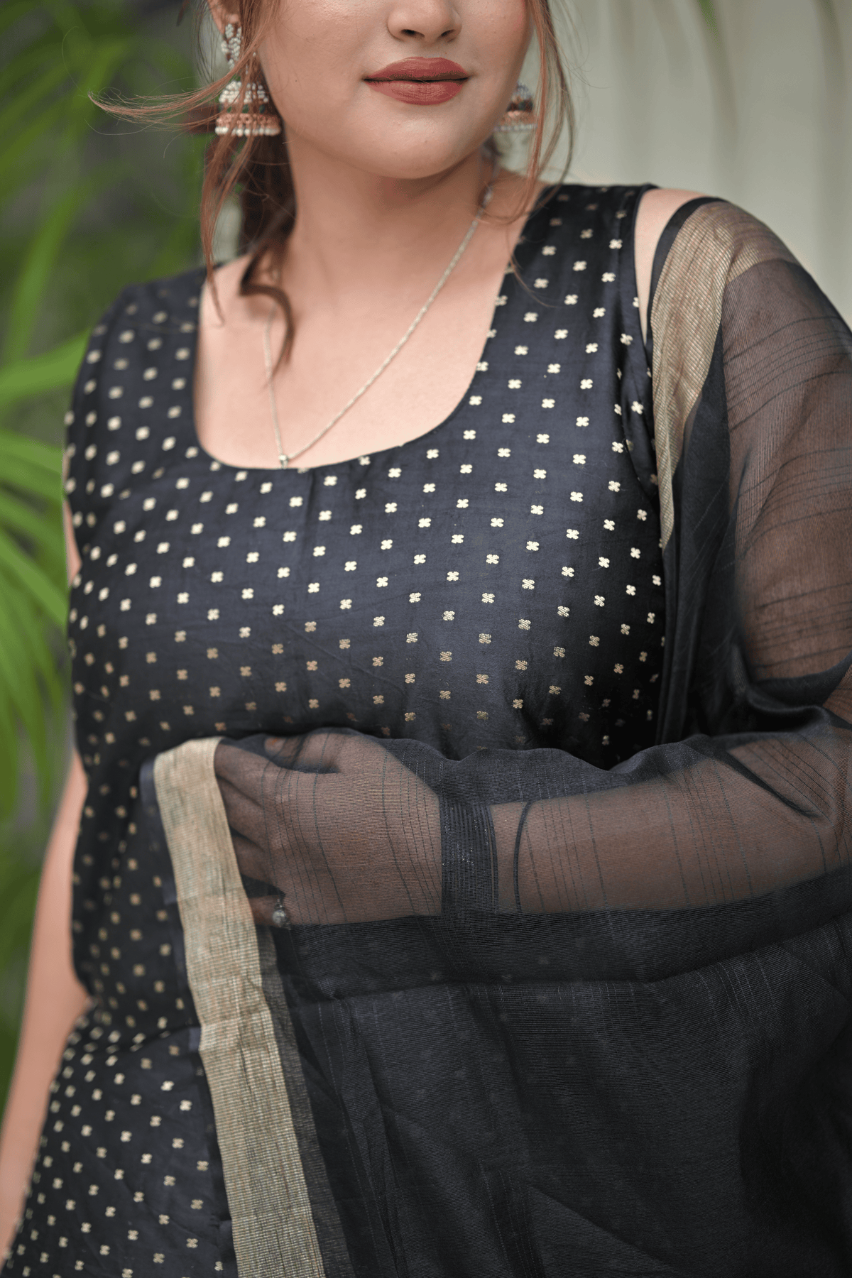 Step into festive season glam with our Noir Elegance Festive Sharara Set, a timeless blend of tradition and sophistication. Crafted in luxurious black with golden zari detailing, this outfit is designed to make you stand out at Karwa Chauth, Diwali parties, or family celebrations. The flared sharara pants paired with a classic kurta and sheer dupatta exude elegance and charm. Whether it’s a puja or an evening function, this outfit promises a graceful yet striking festive look.