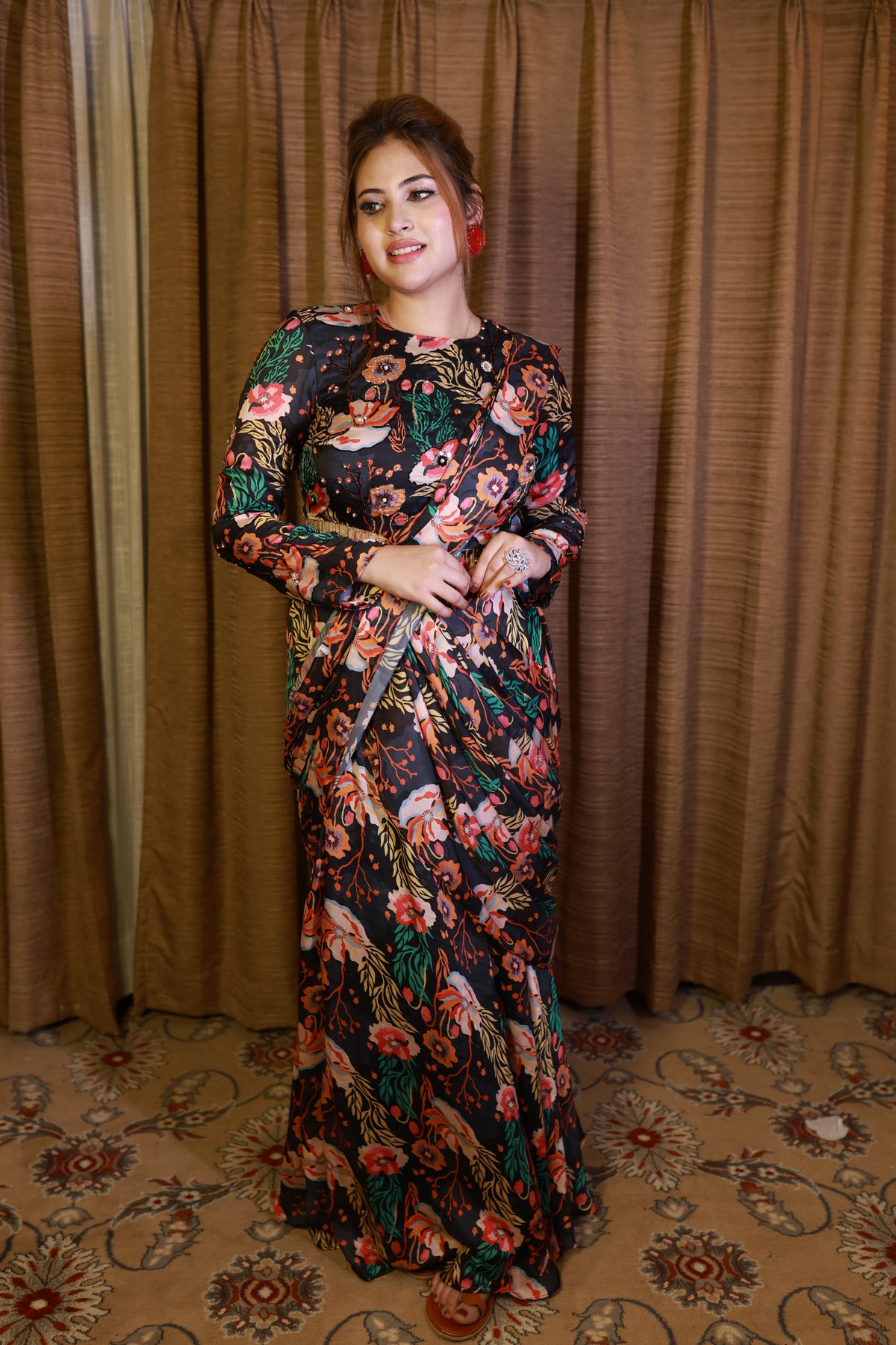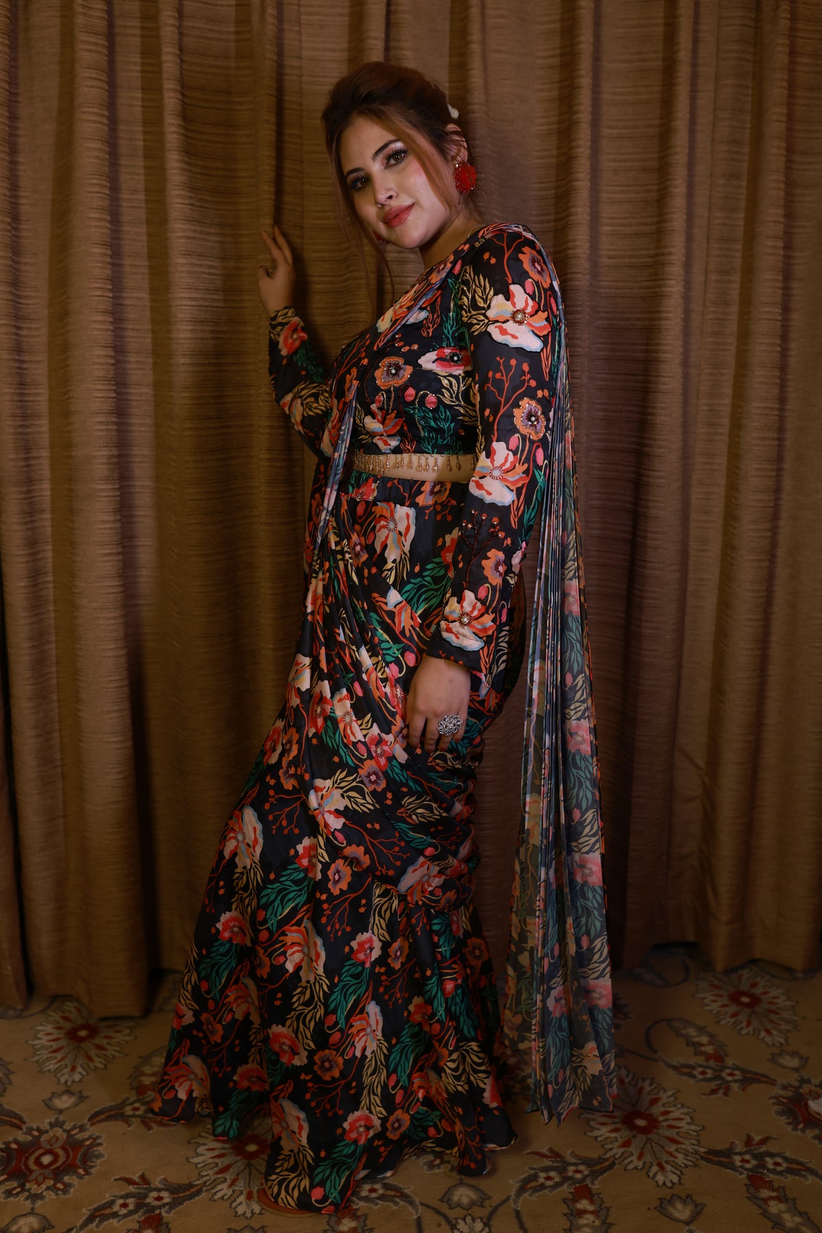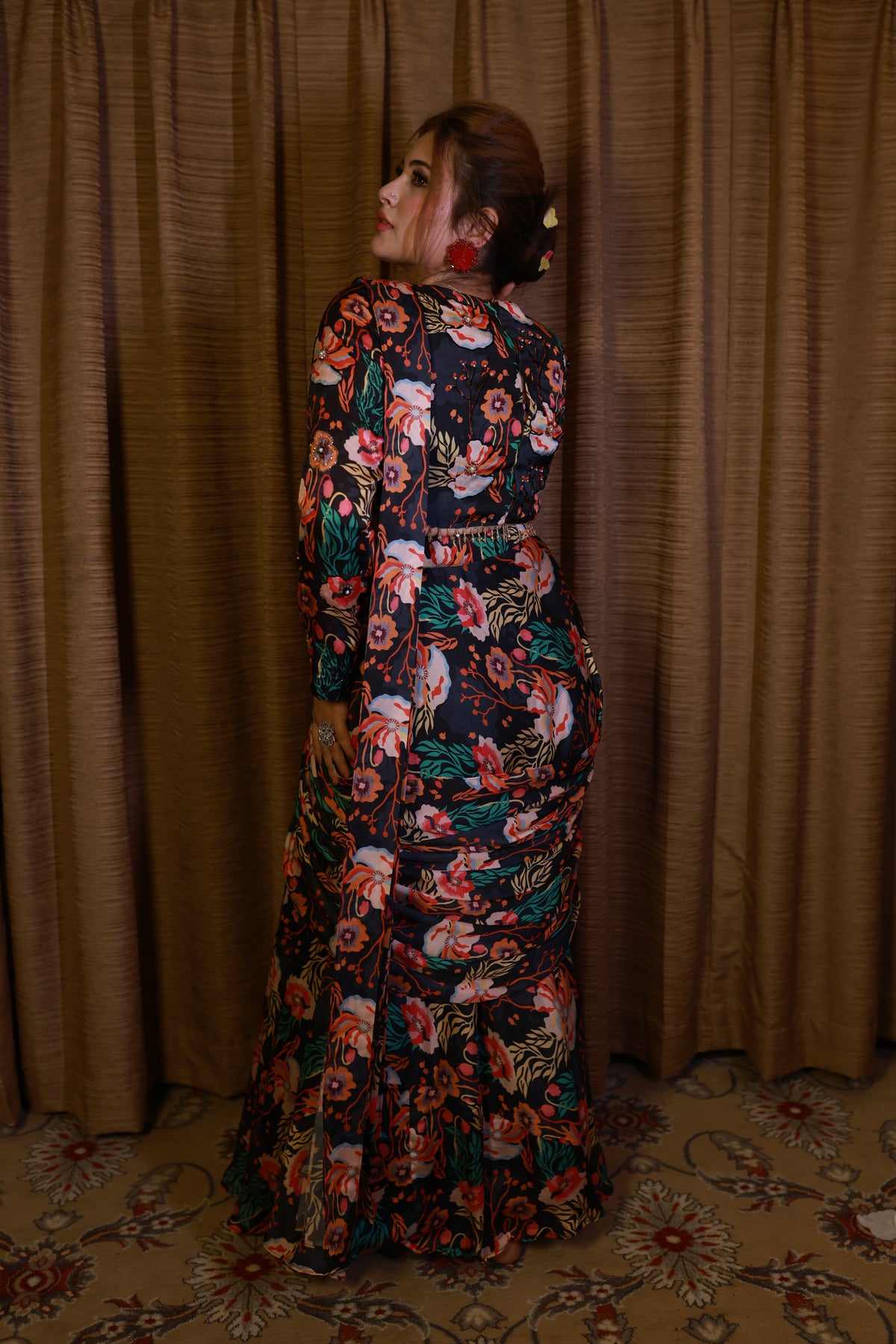 The Noir Garden Pre-Draped Saree from the Bloomora Collection is a bold and elegant statement piece for the modern woman. Designed in a rich black base with vibrant floral prints, this saree beautifully balances drama and sophistication. The pre-draped silhouette offers effortless wear, while the full-sleeve blouse adds a contemporary edge to the classic floral charm. Perfect for evening gatherings, festive dinners, or cocktail events, this saree brings a refined yet striking appeal to your wardrobe.