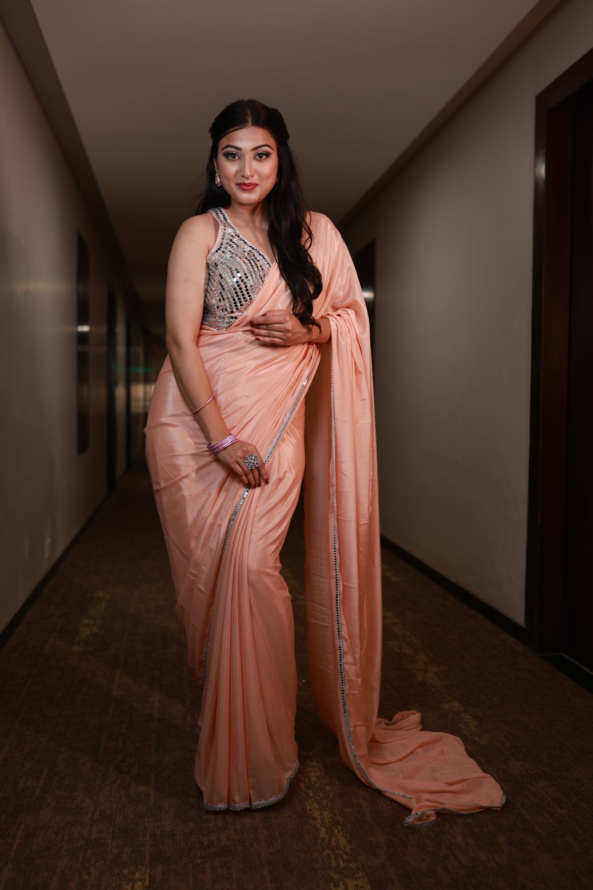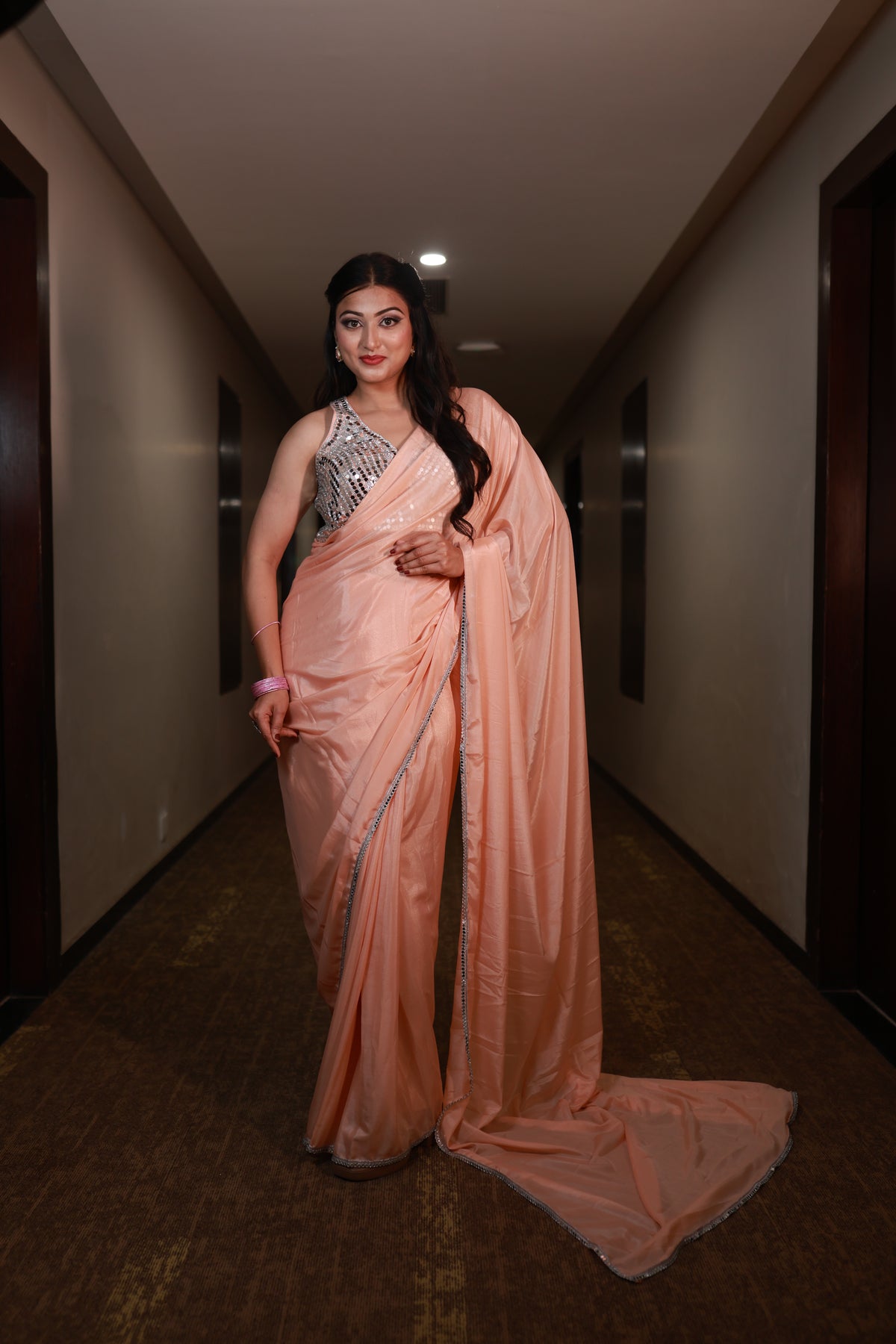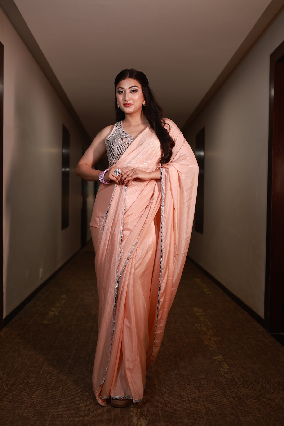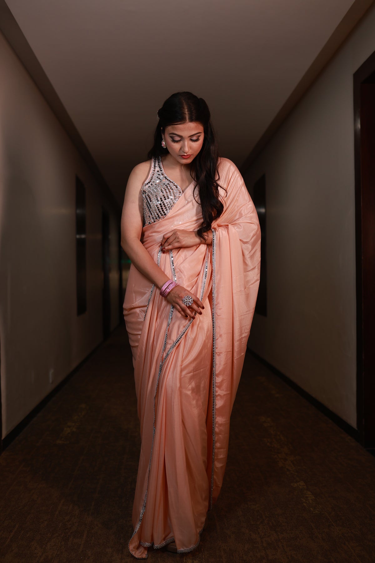 Celestia Peach Moonlight is crafted in a delicate peach hue that glows gently with every movement, creating an aura of calm, feminine radiance. Paired with a shimmering silver-sequin blouse and a finely detailed silver border, this saree blends celestial elegance with soft sophistication.