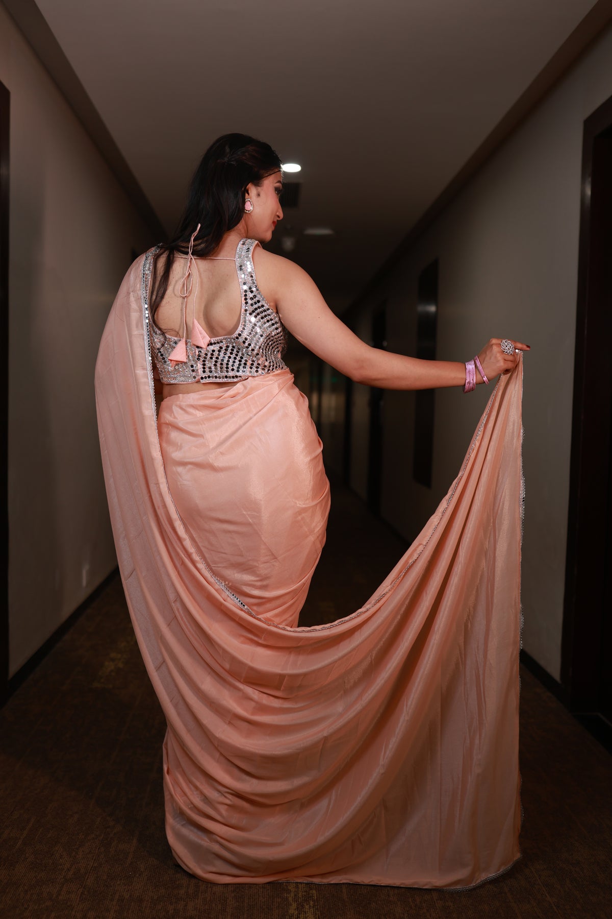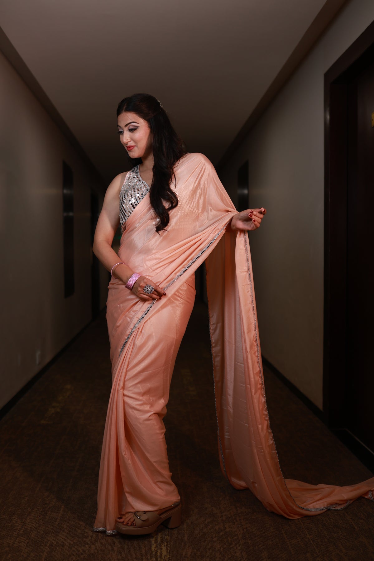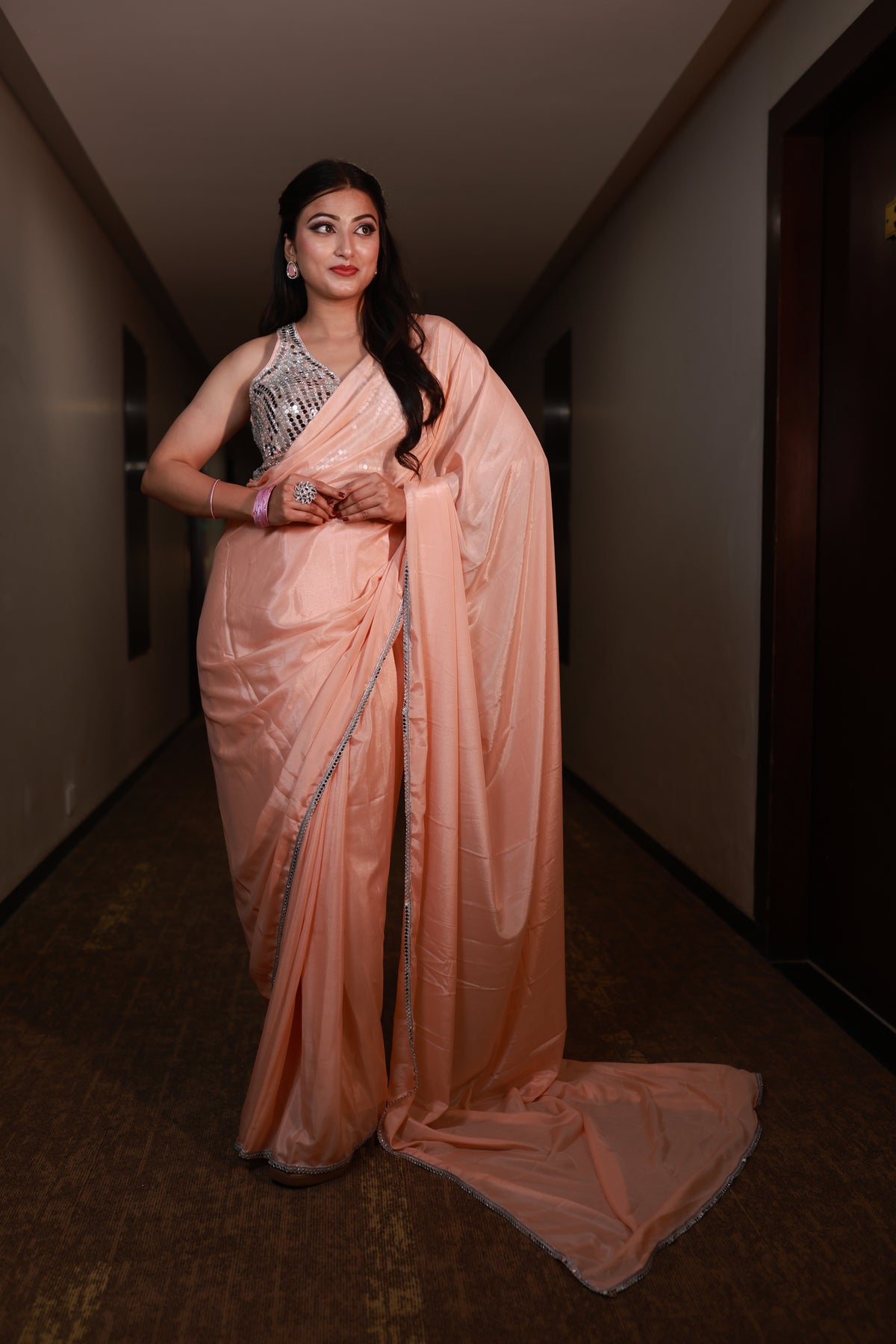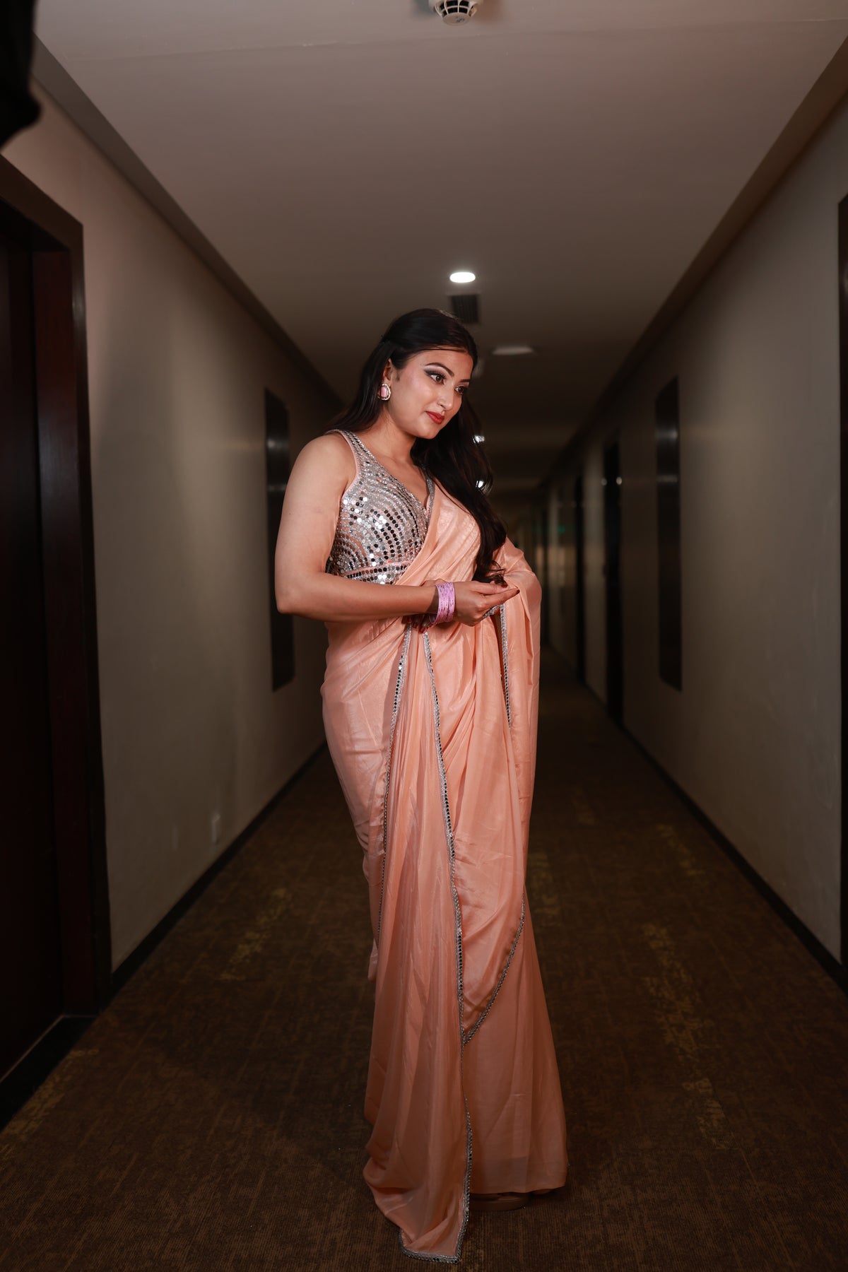 Celestia Peach Moonlight is crafted in a delicate peach hue that glows gently with every movement, creating an aura of calm, feminine radiance. Paired with a shimmering silver-sequin blouse and a finely detailed silver border, this saree blends celestial elegance with soft sophistication.