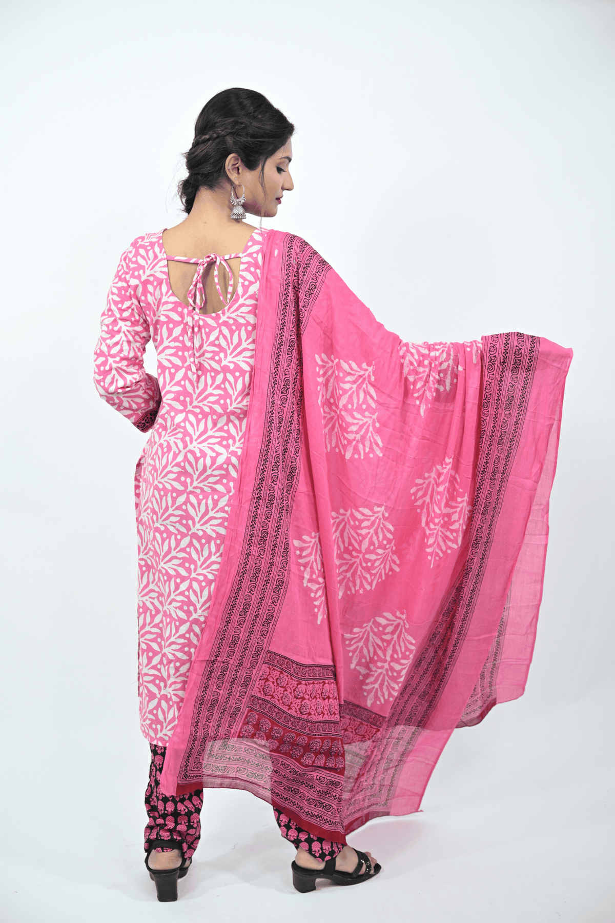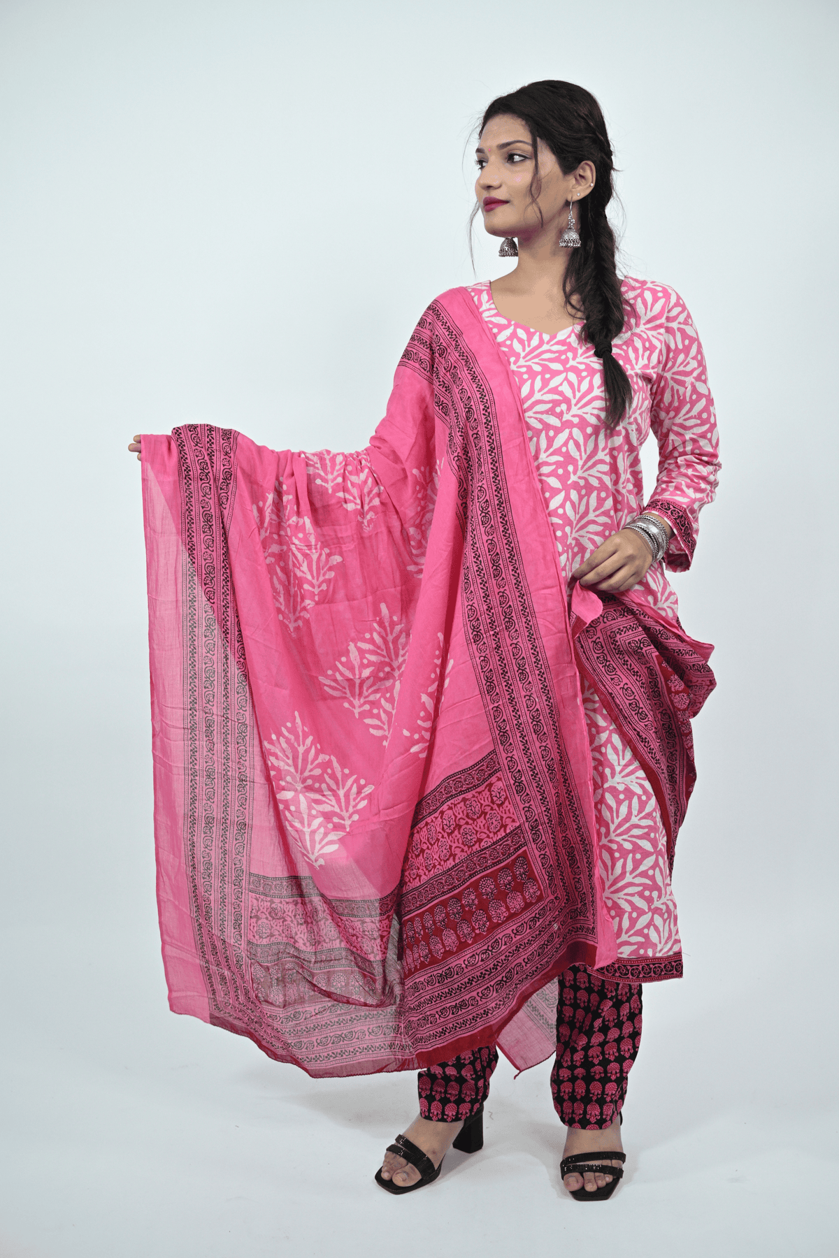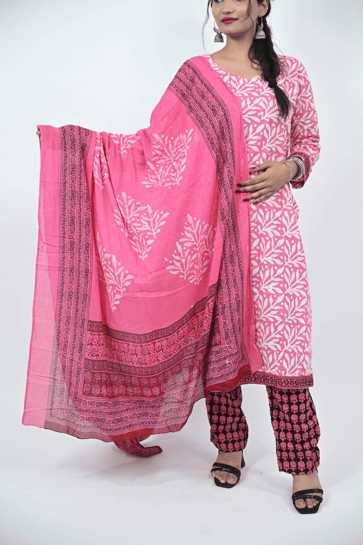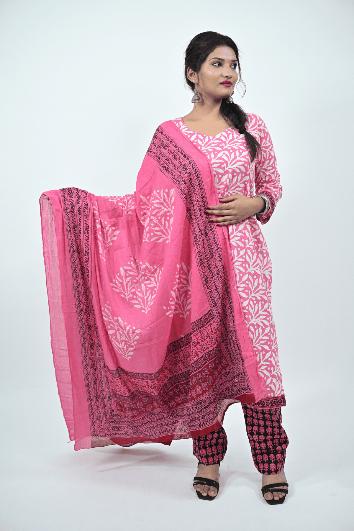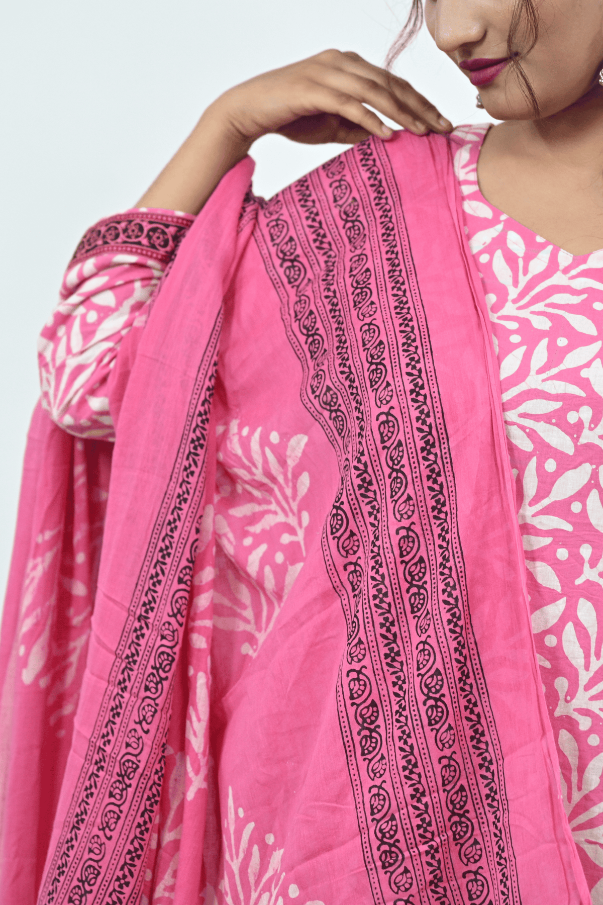 Brighten your ethnic collection with this vibrant pink and white batik printed cotton suit set. The kurti features full sleeves with a round neckline, paired with contrasting printed cotton pants and a beautifully designed dupatta showcasing traditional batik motifs with a detailed border. The soft and breathable cotton fabric makes it a comfortable choice for daily wear, festive gatherings, and office looks.