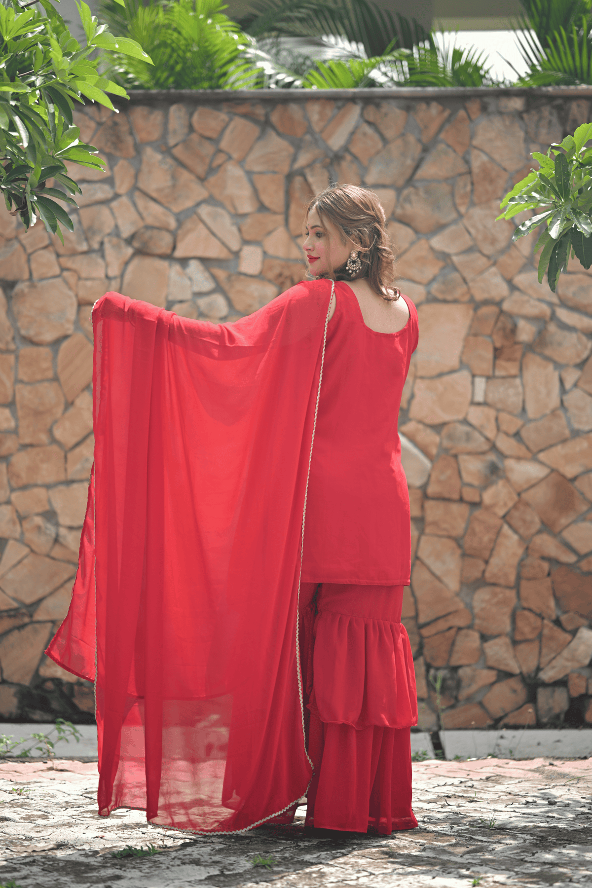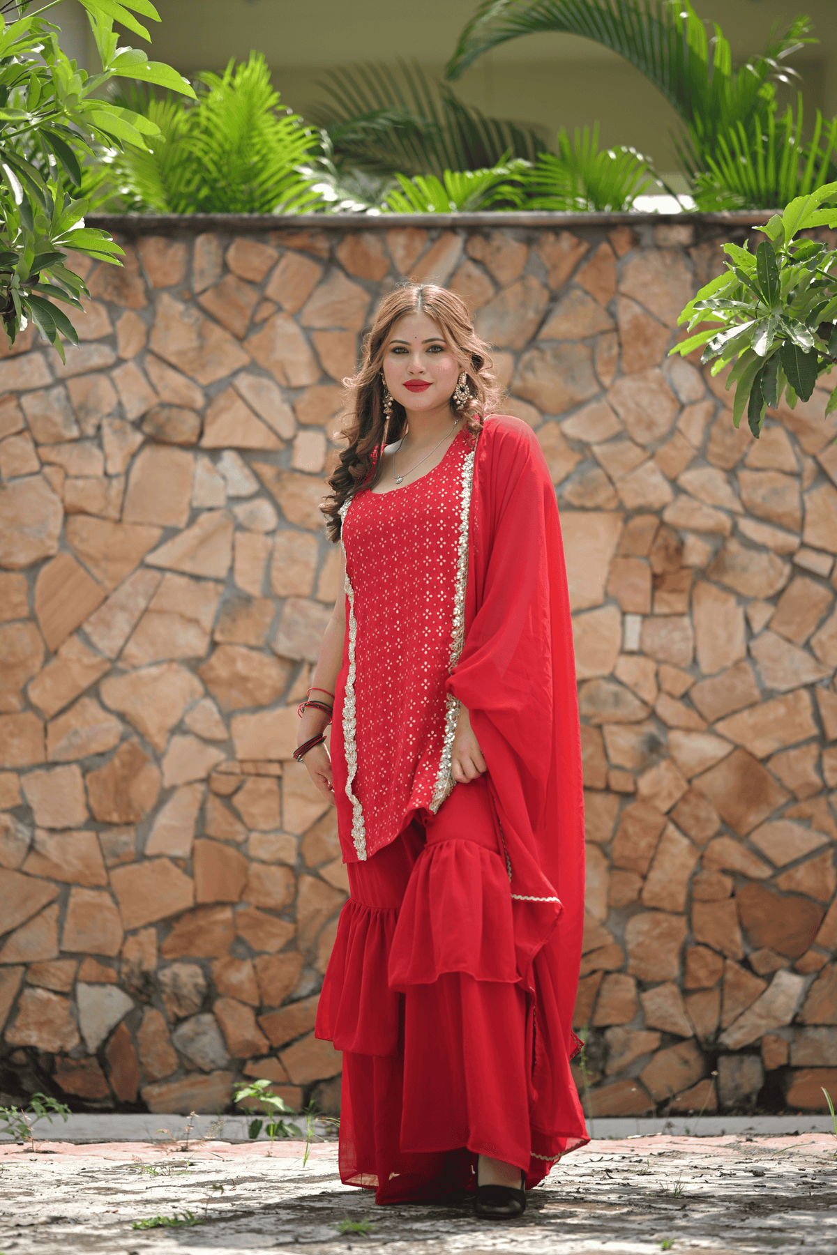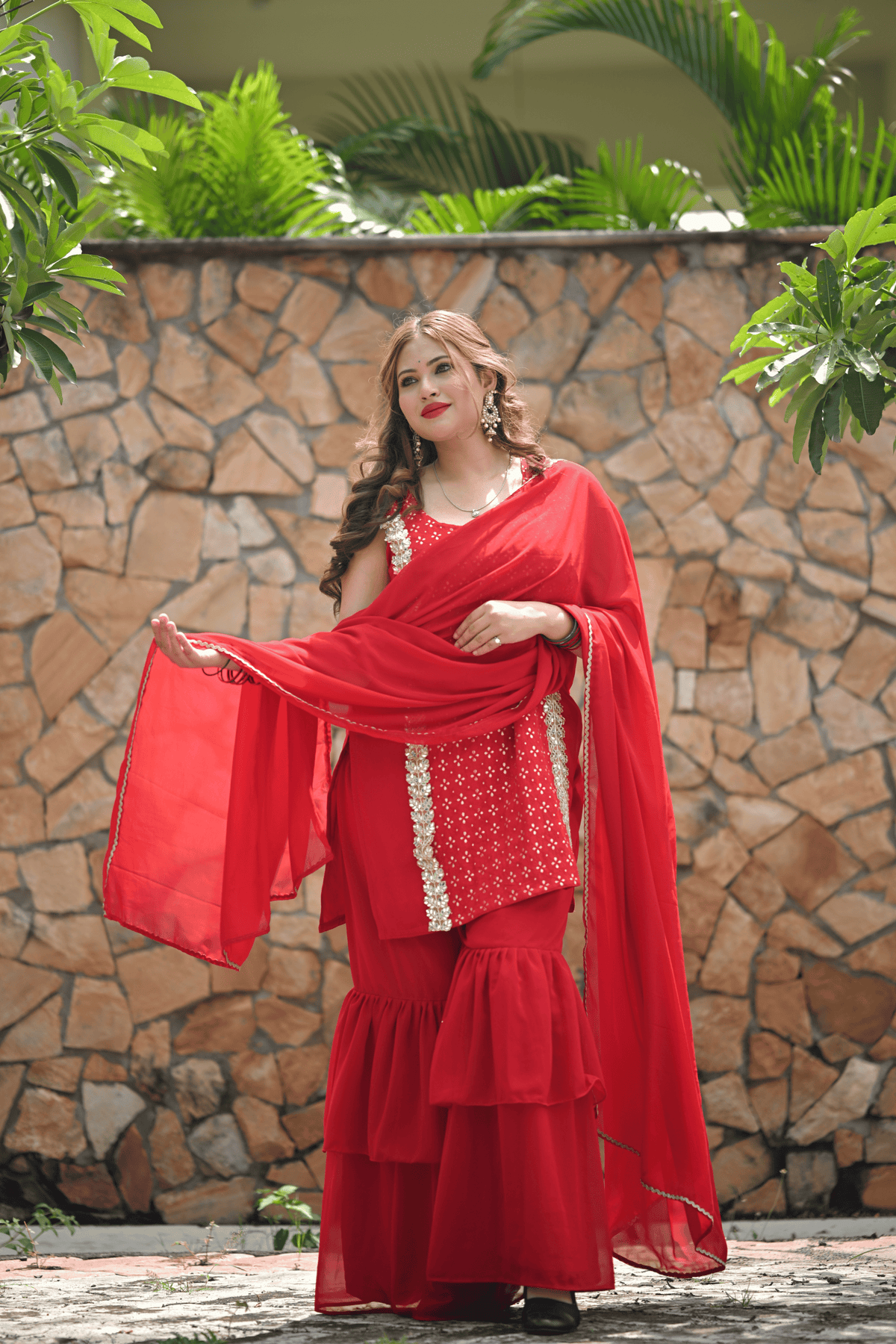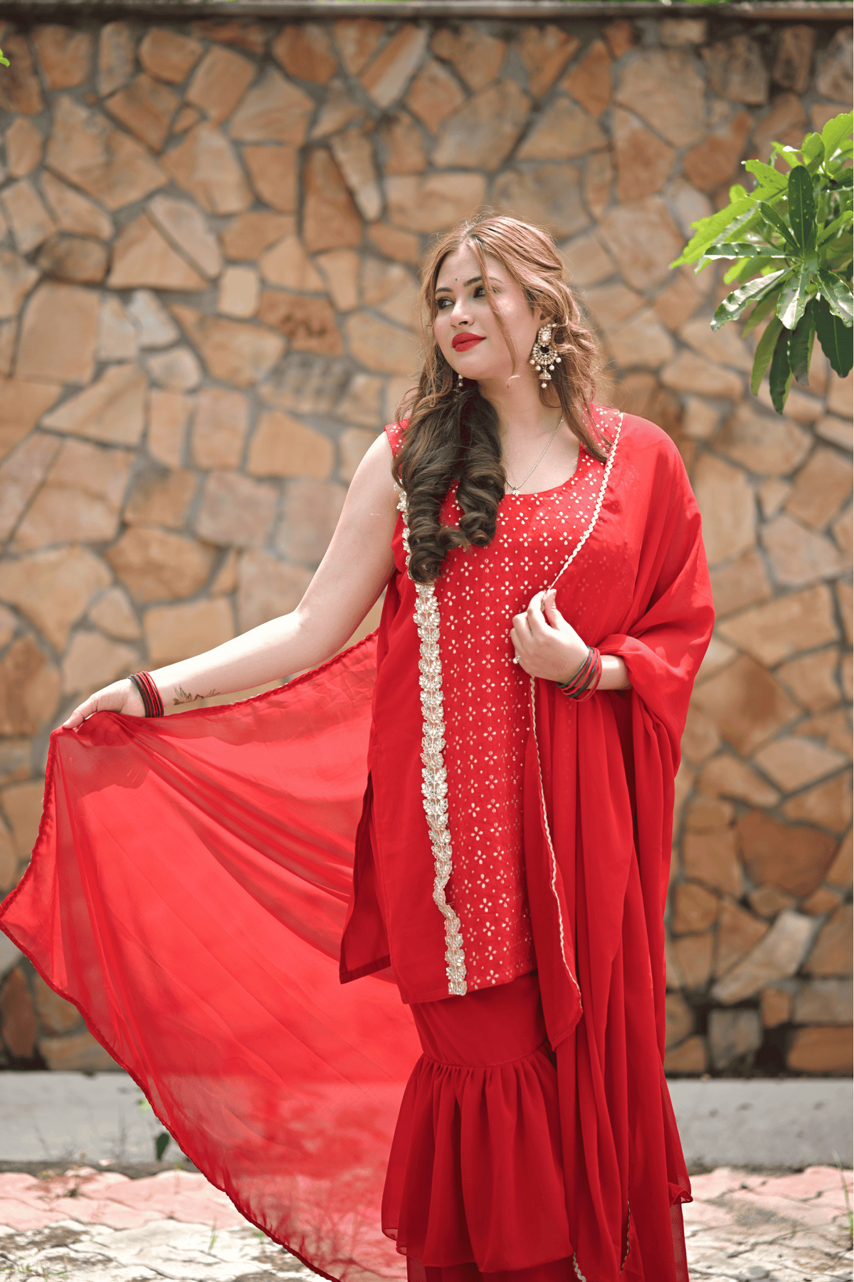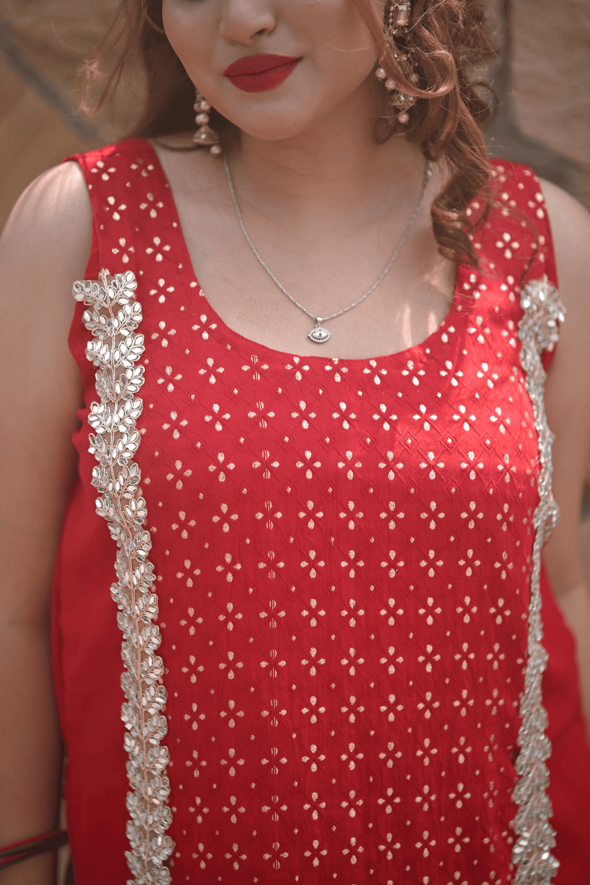 Dive into festive elegance with our RangReet Red Leheriya Sharara Set, a stunning celebration of traditional artistry and timeless charm. Crafted in vibrant red, this outfit embodies the essence of auspicious occasions like Karwa Chauth, Teej, or festive poojas. The kurta is adorned with delicate leheriya-inspired patterns and subtle embellishments, paired with a graceful flared sharara and a lightweight dupatta that adds a dreamy flow to your look. Perfect for the modern woman who loves a classic touch with contemporary style, this outfit ensures you stand out beautifully in every festive moment.