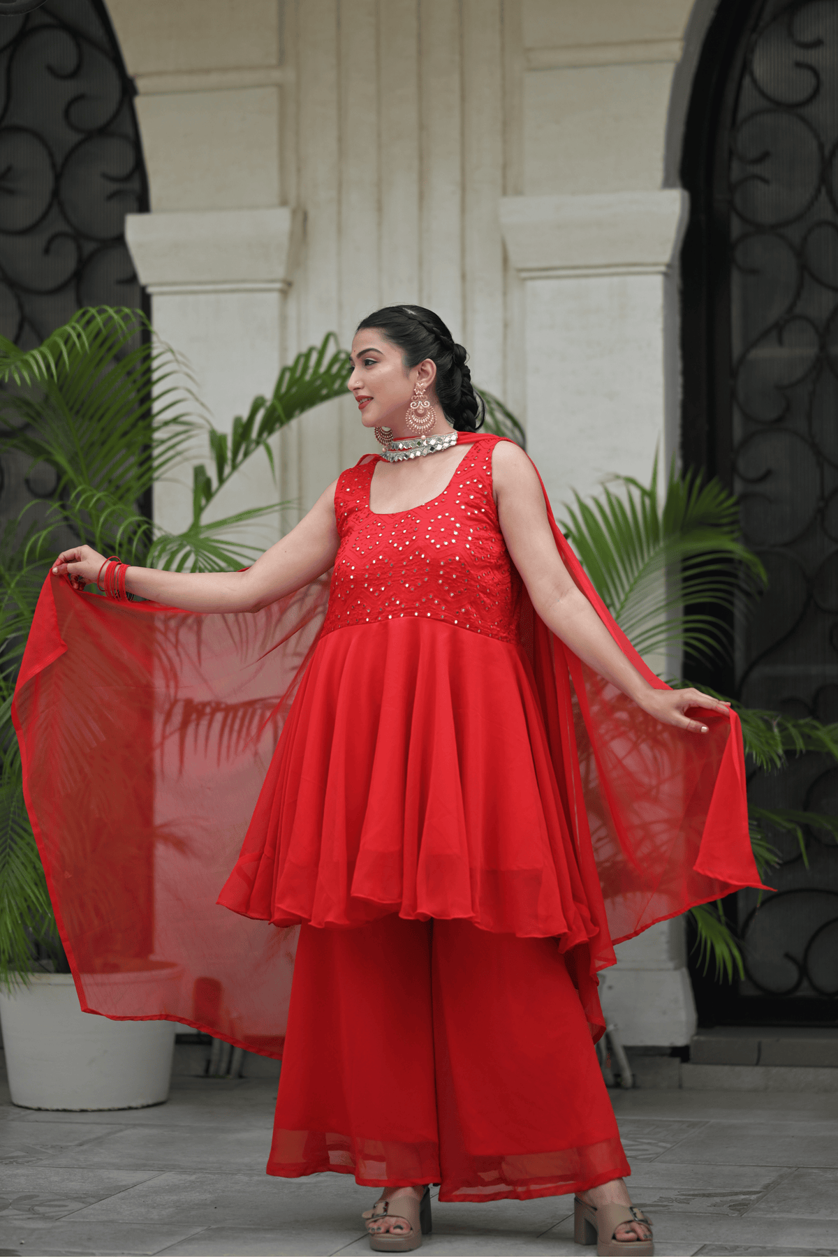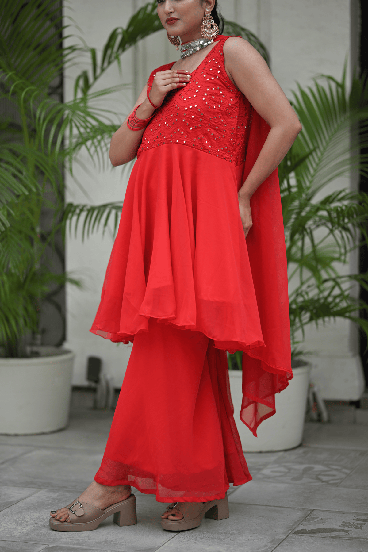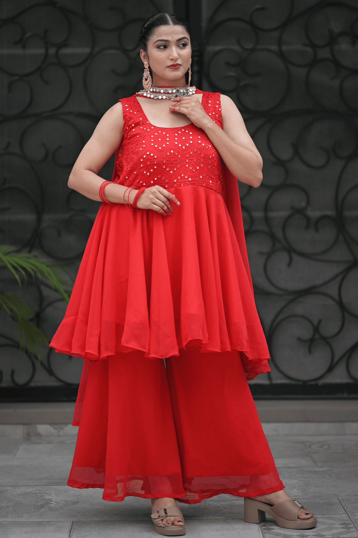 Celebrate the season of joy and tradition with our Rangriti Festive Sharara Set, a vibrant red ensemble designed to make every occasion unforgettable. Featuring a flared kurta adorned with subtle mirror work, paired with flowing palazzo pants and a lightweight dupatta, this outfit is perfect for Karwa Chauth, Diwali celebrations, or wedding festivities. The bright red hue symbolizes love and prosperity, making it an ideal choice for those special festive moments.