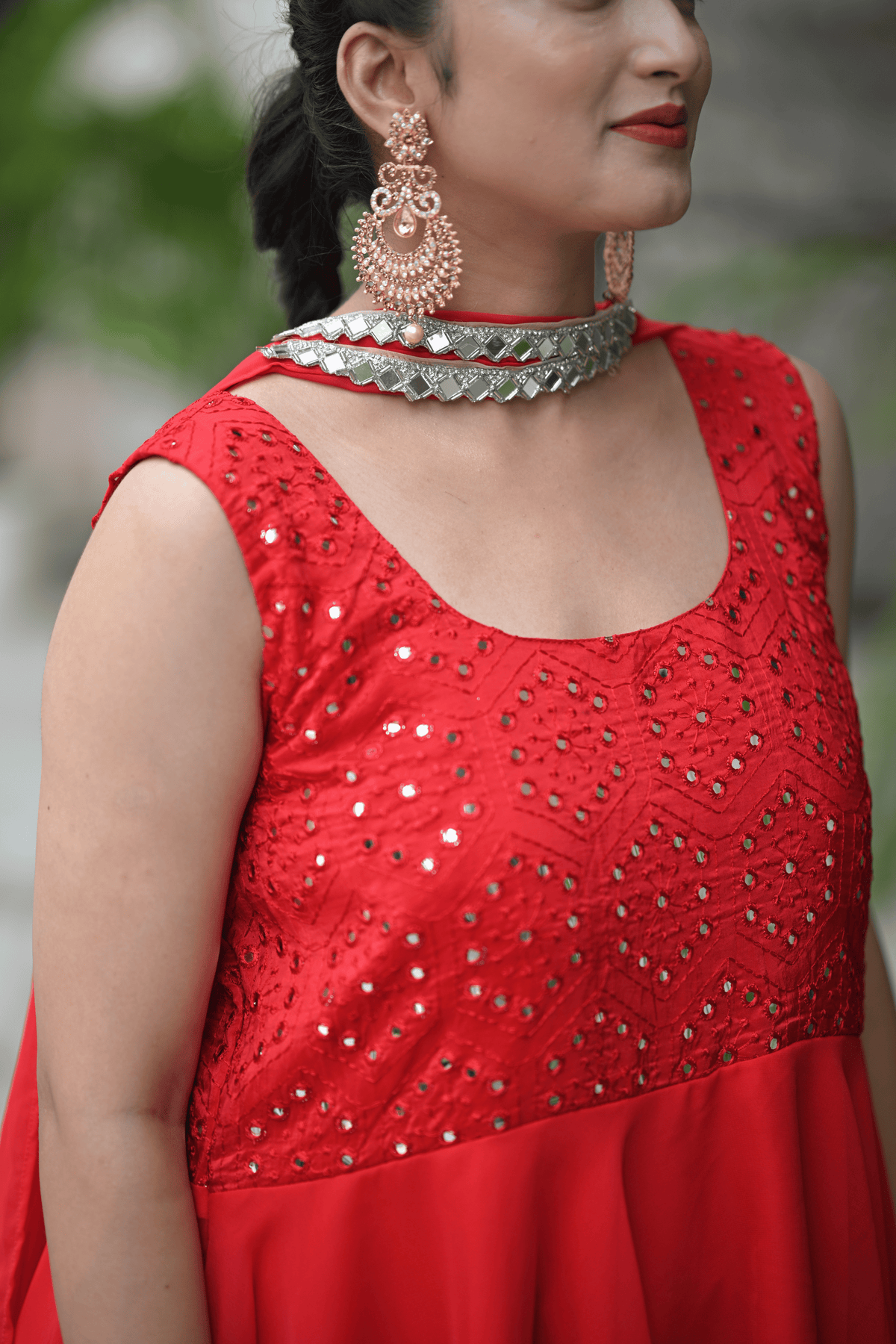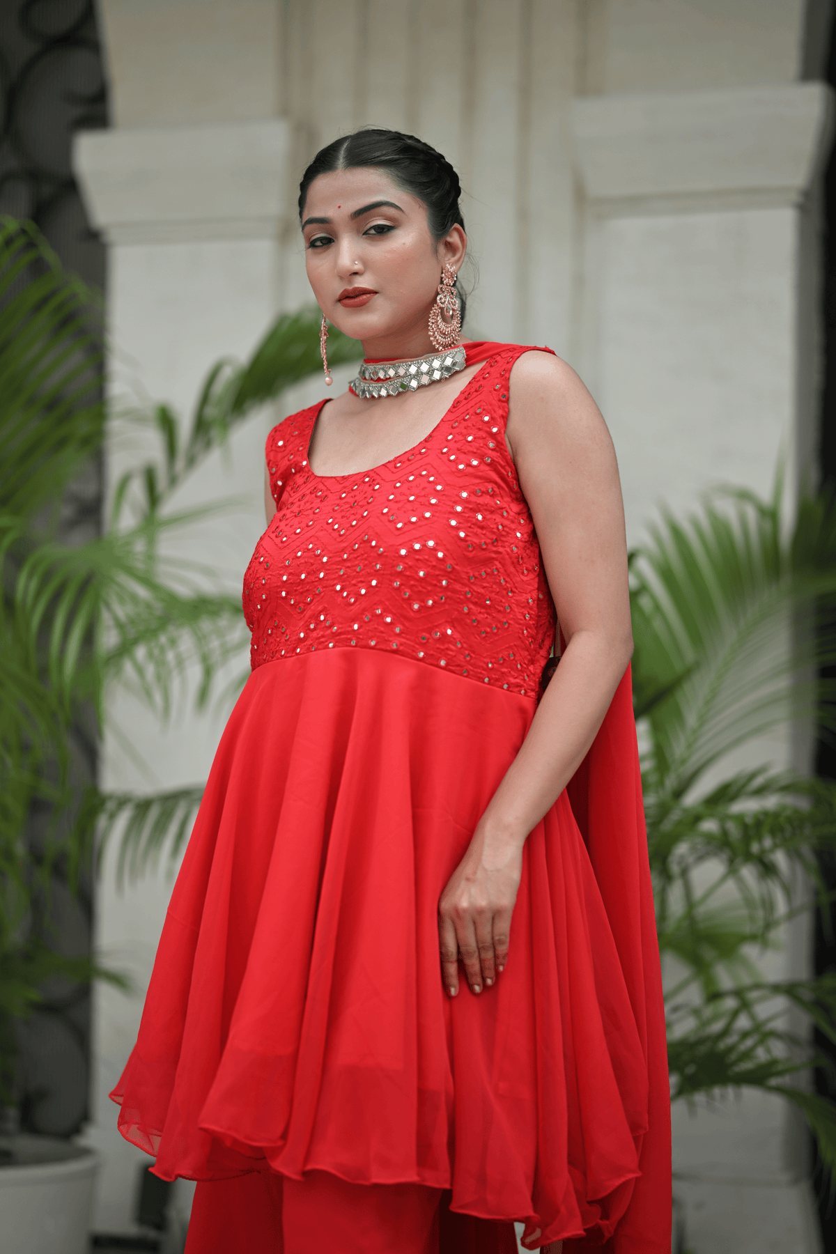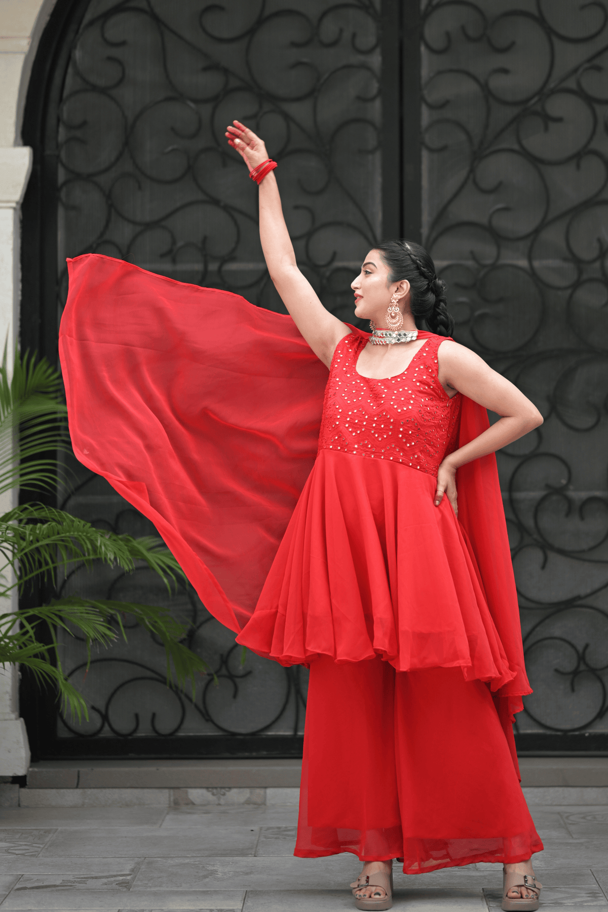 Celebrate the season of joy and tradition with our Rangriti Festive Sharara Set, a vibrant red ensemble designed to make every occasion unforgettable. Featuring a flared kurta adorned with subtle mirror work, paired with flowing palazzo pants and a lightweight dupatta, this outfit is perfect for Karwa Chauth, Diwali celebrations, or wedding festivities. The bright red hue symbolizes love and prosperity, making it an ideal choice for those special festive moments.