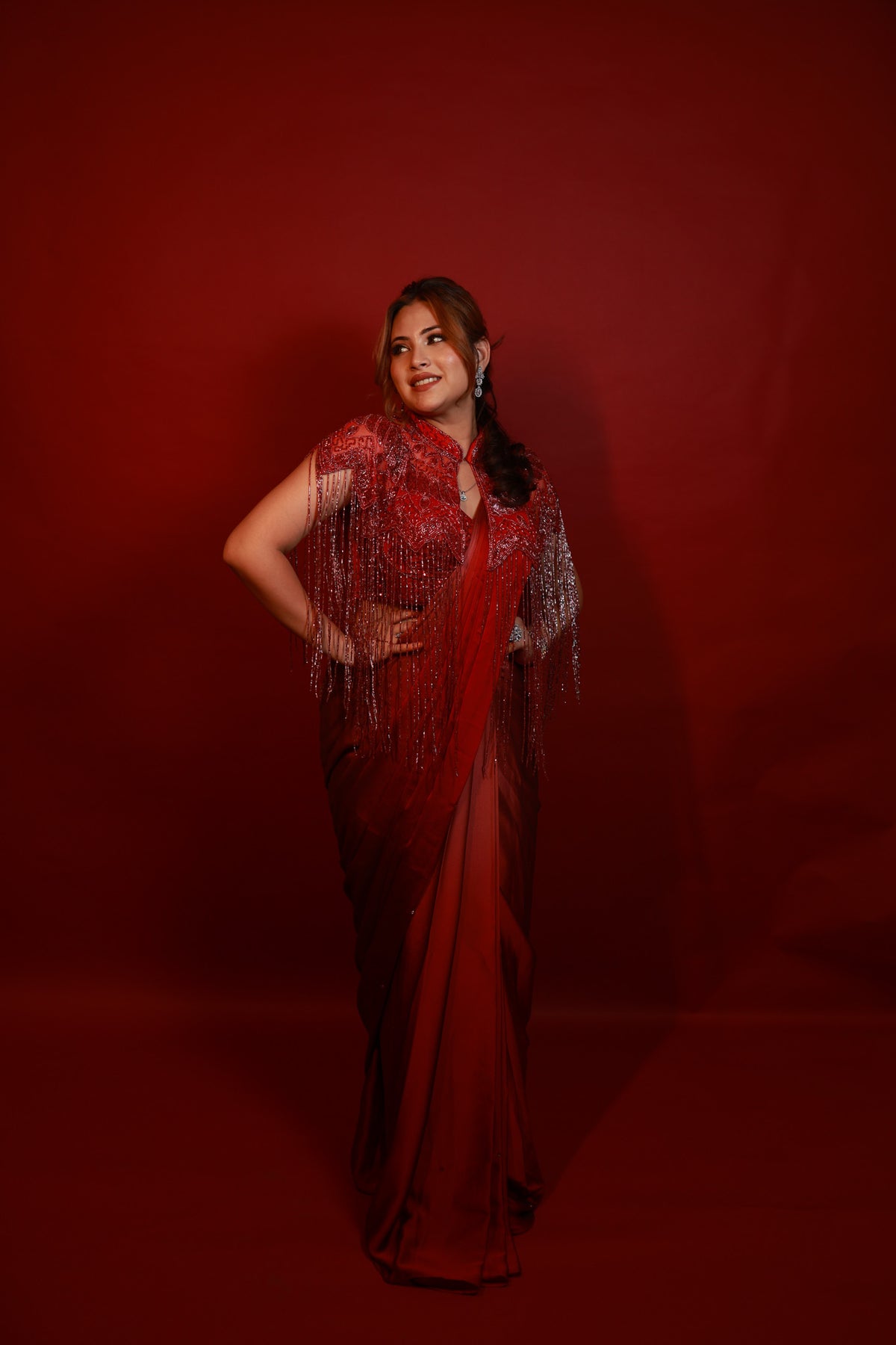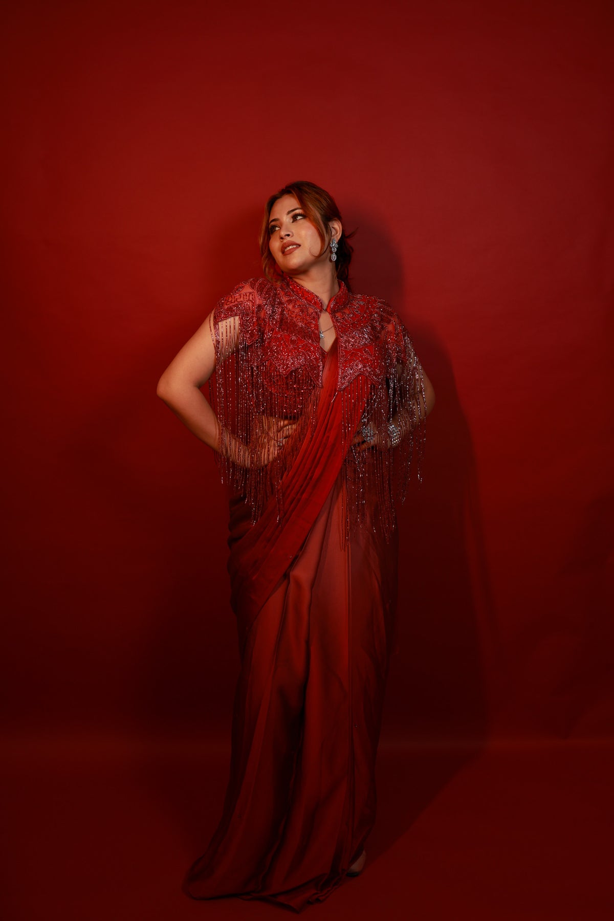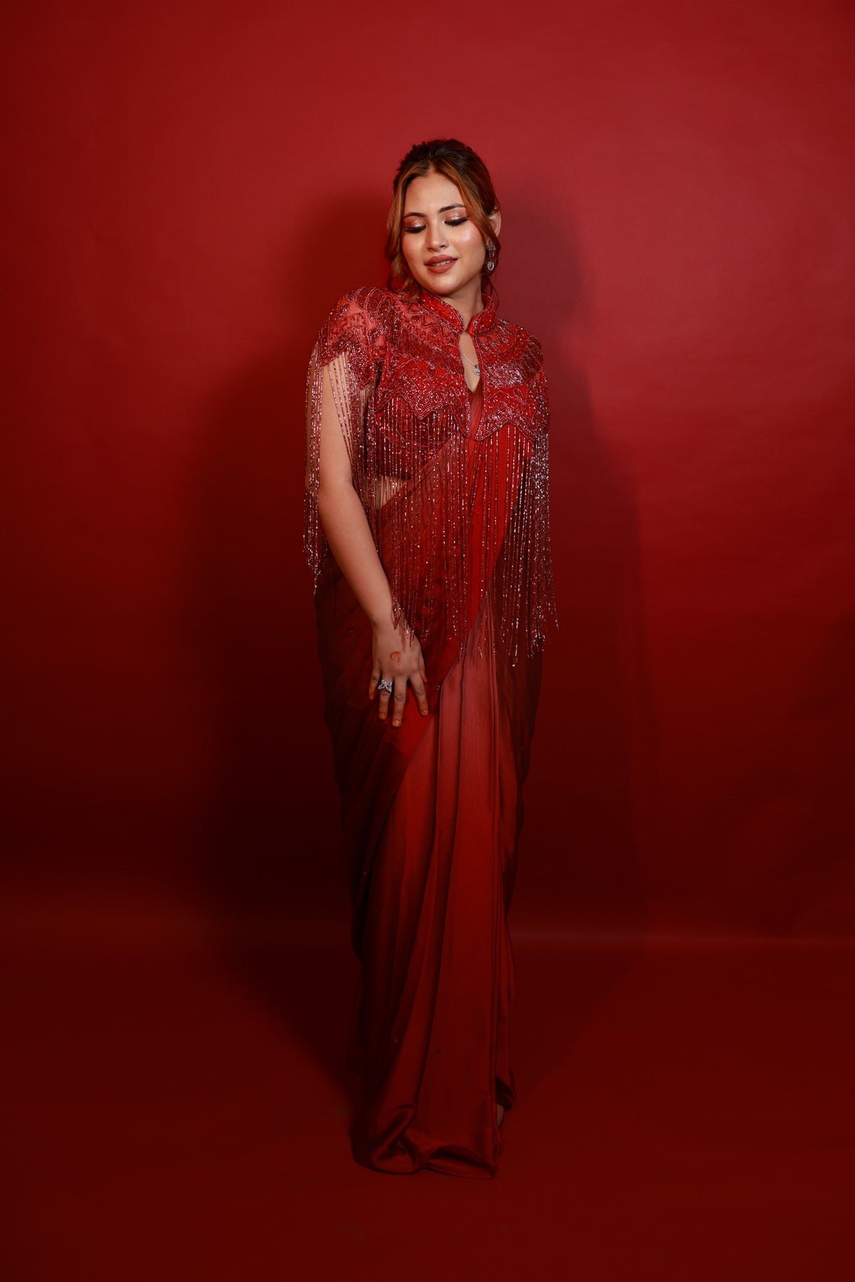 Draped in deep crimson and adorned with intricate hand embroidery, this pre-draped saree celebrates the perfect balance between modern sensuality and timeless grace. The delicately embellished blouse, with its cascading bead details, adds a touch of bold sophistication that makes it ideal for cocktail nights and evening soirees.
