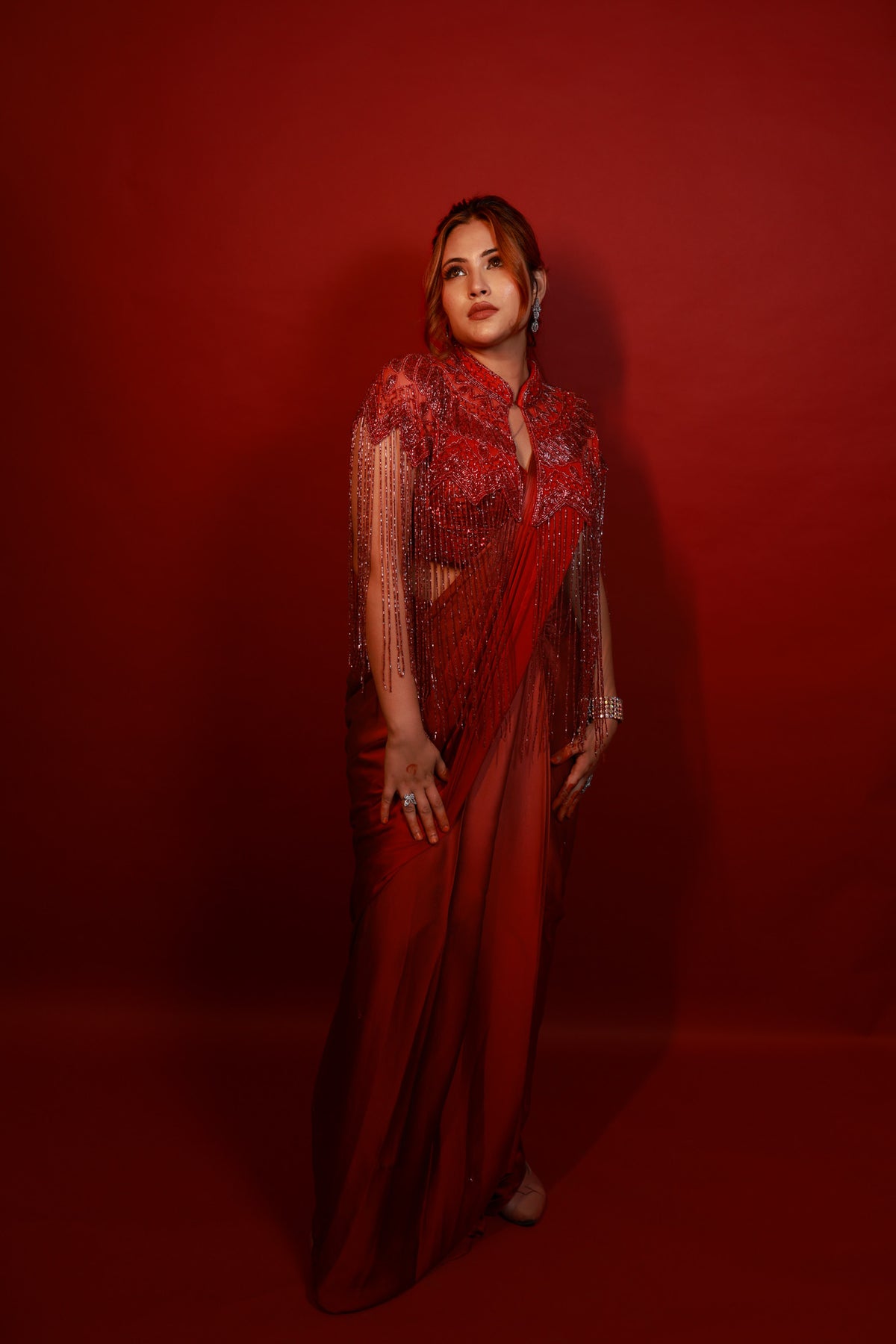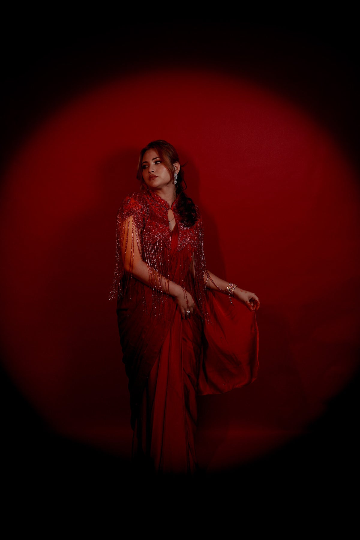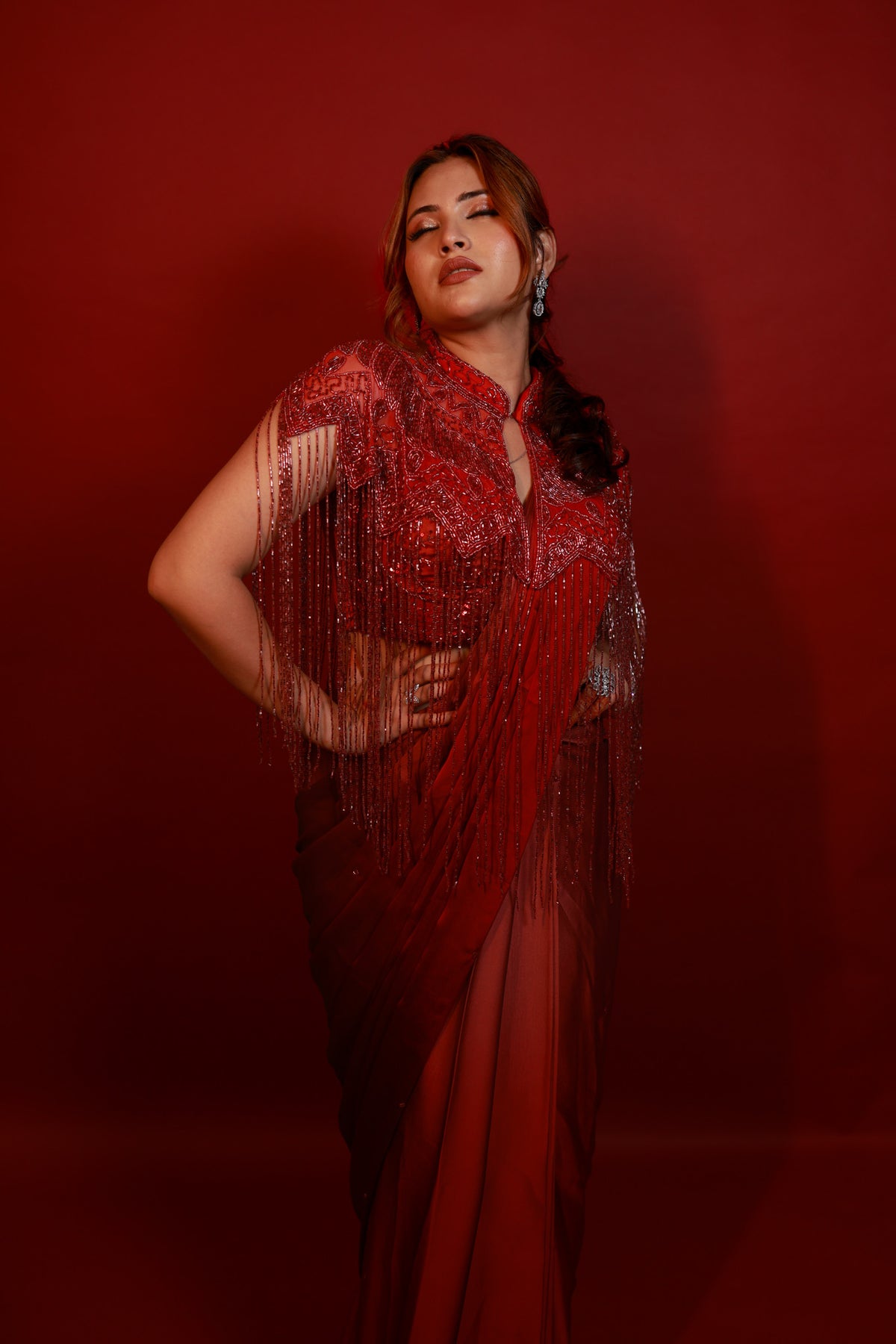 Draped in deep crimson and adorned with intricate hand embroidery, this pre-draped saree celebrates the perfect balance between modern sensuality and timeless grace. The delicately embellished blouse, with its cascading bead details, adds a touch of bold sophistication that makes it ideal for cocktail nights and evening soirees.