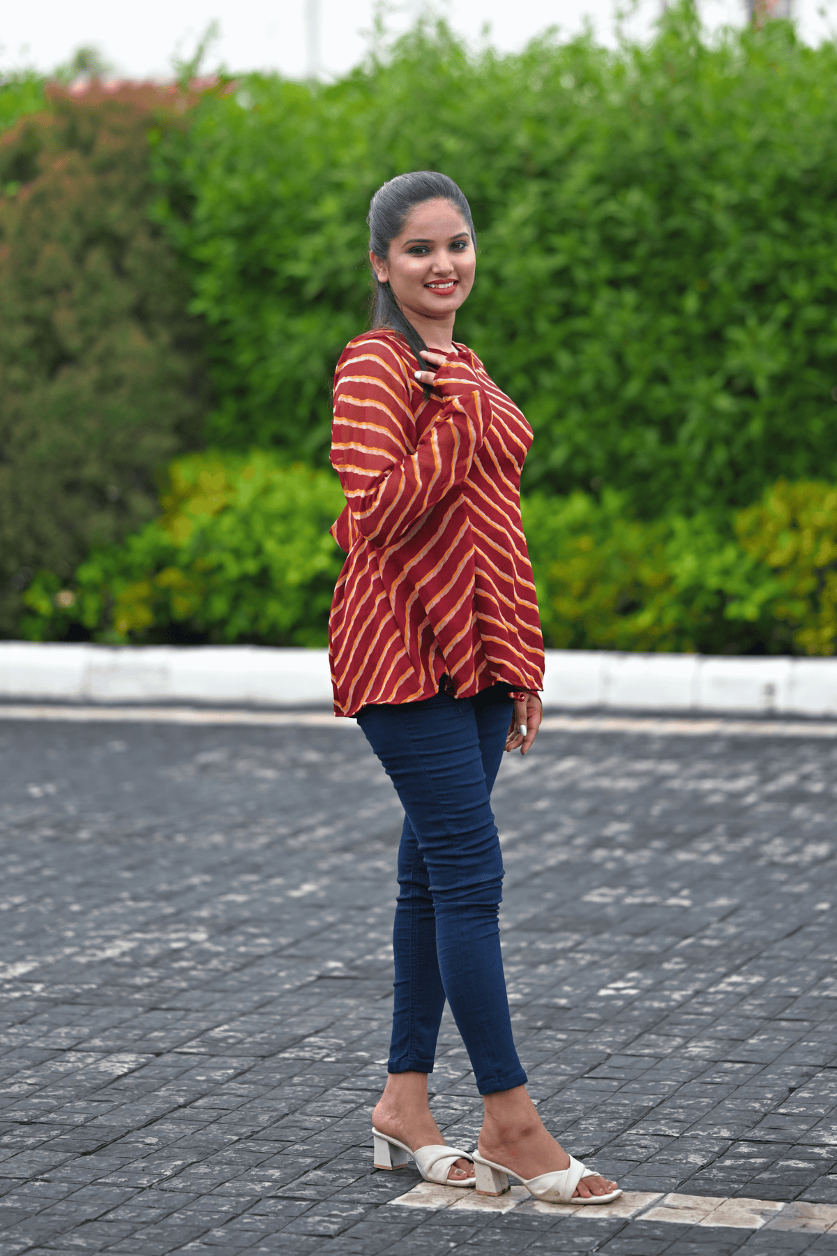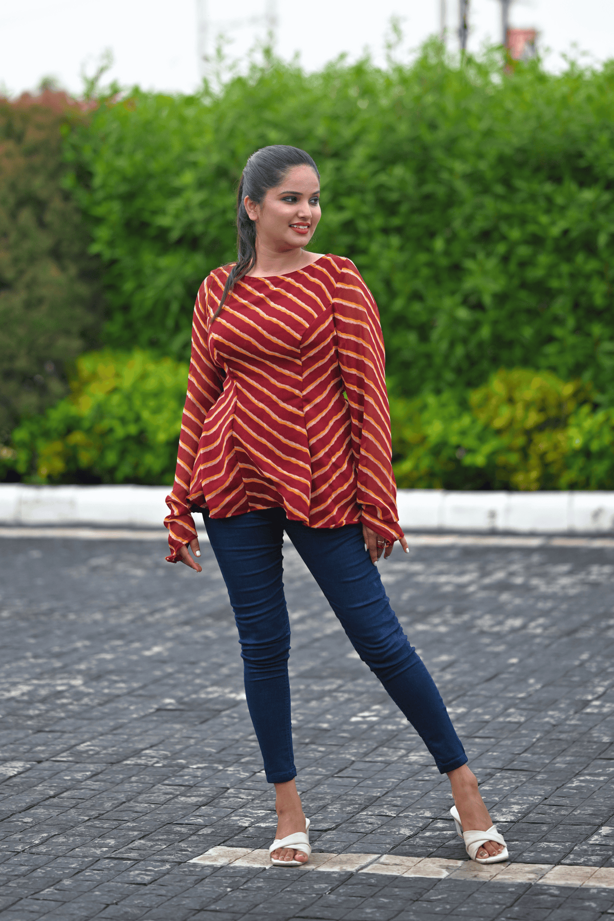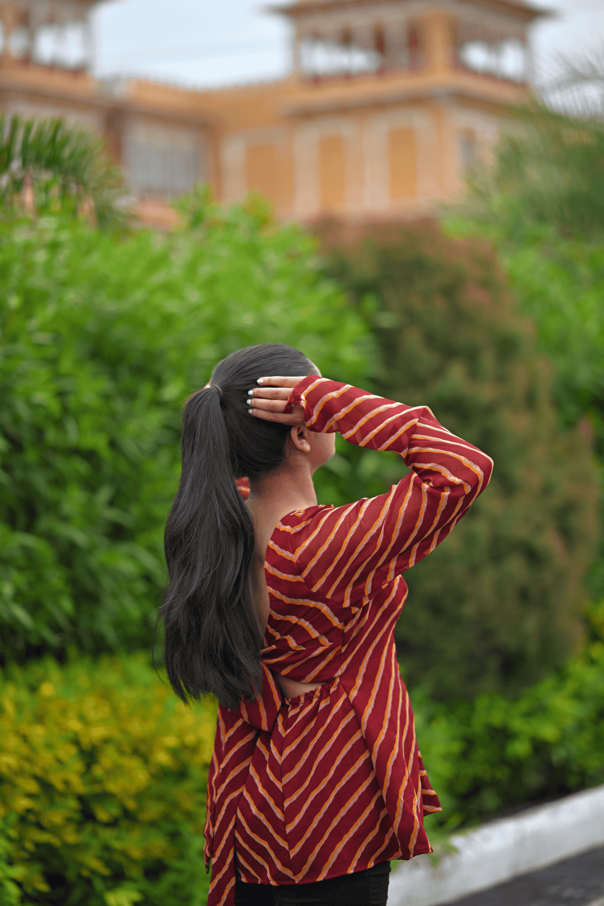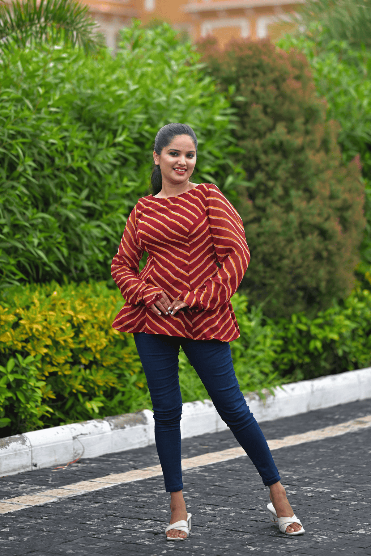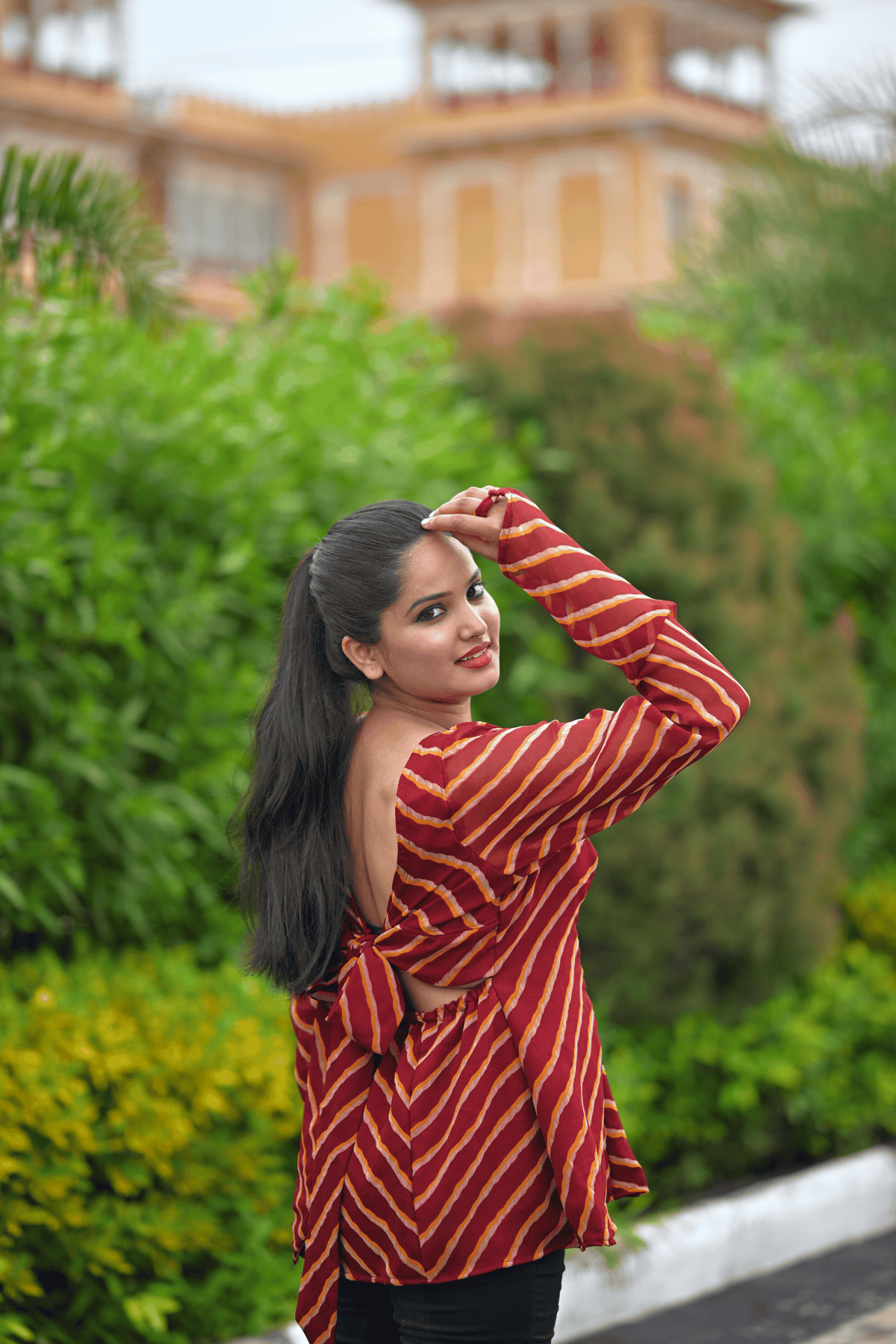 A tribute to the timeless charm of Rajasthan, the Ruhani Rangrez Top blends tradition with sensual modernity. Handcrafted in rich maroon leheriya, this deep backless design features statement puff sleeves and a flattering bow-tie detail — designed to turn every moment into a statement.