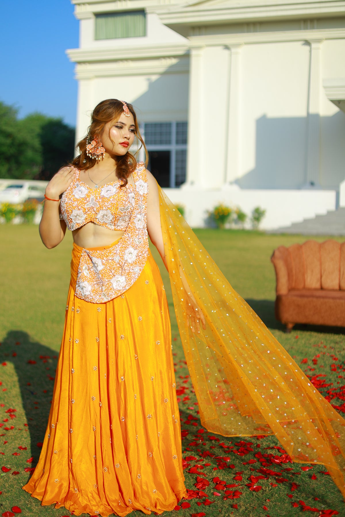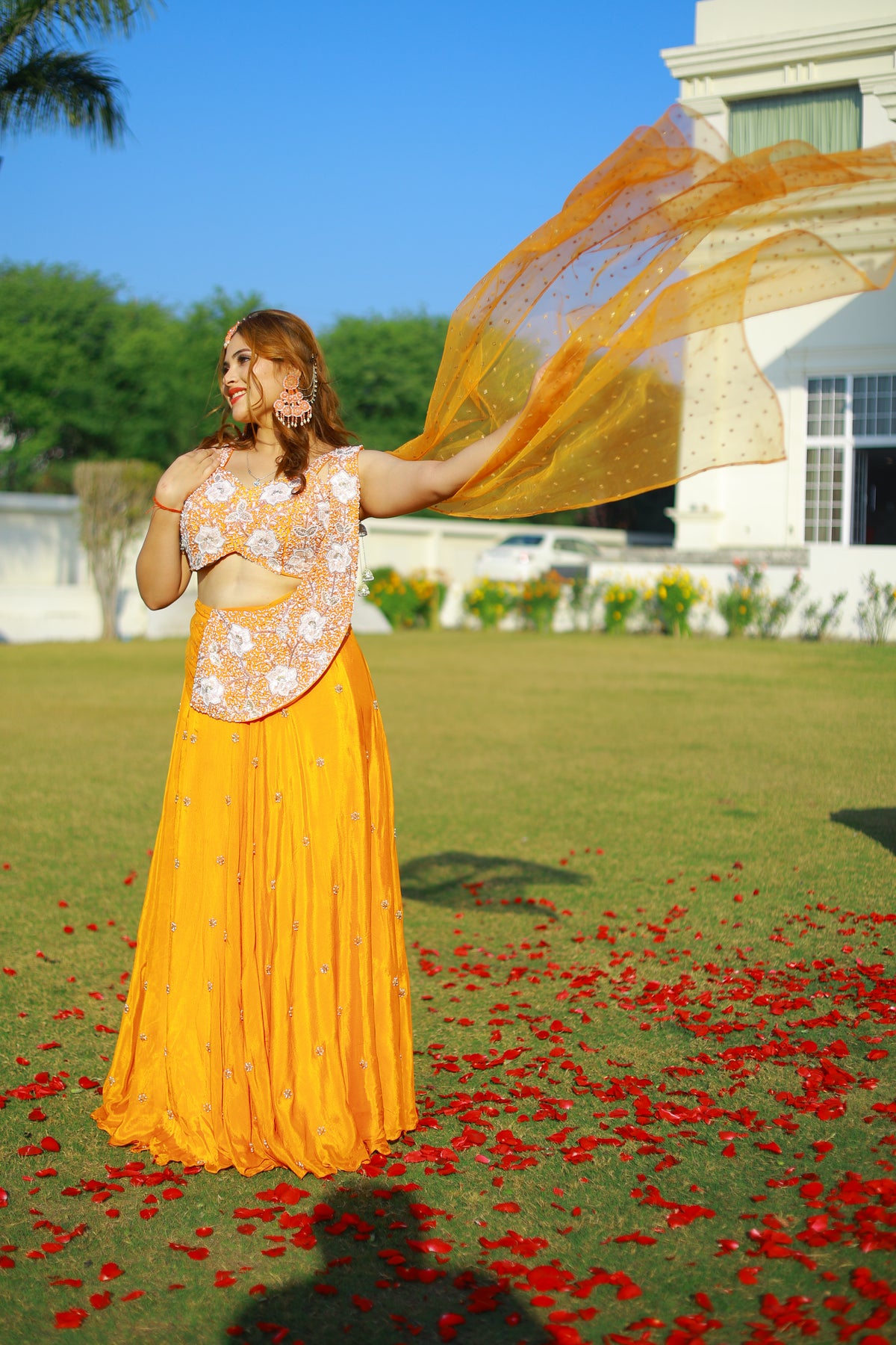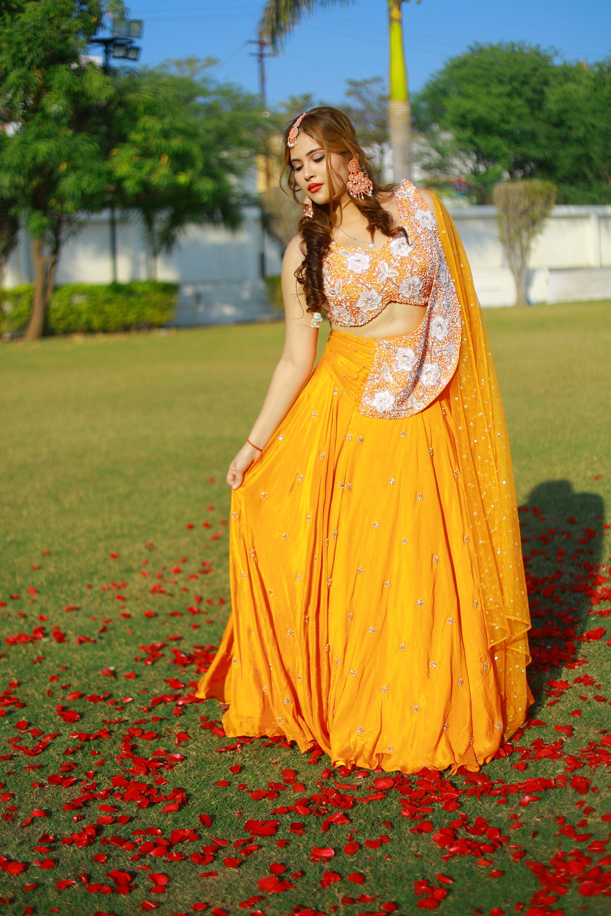 Crafted in a rich saffron hue, this ensemble features a hand-embroidered bodice adorned with delicate floral motifs, paired with a flowing skirt that moves effortlessly with every step. The look is completed with a sheer dupatta scattered with subtle embellishments, adding lightness, texture, and an unmistakable festive charm.