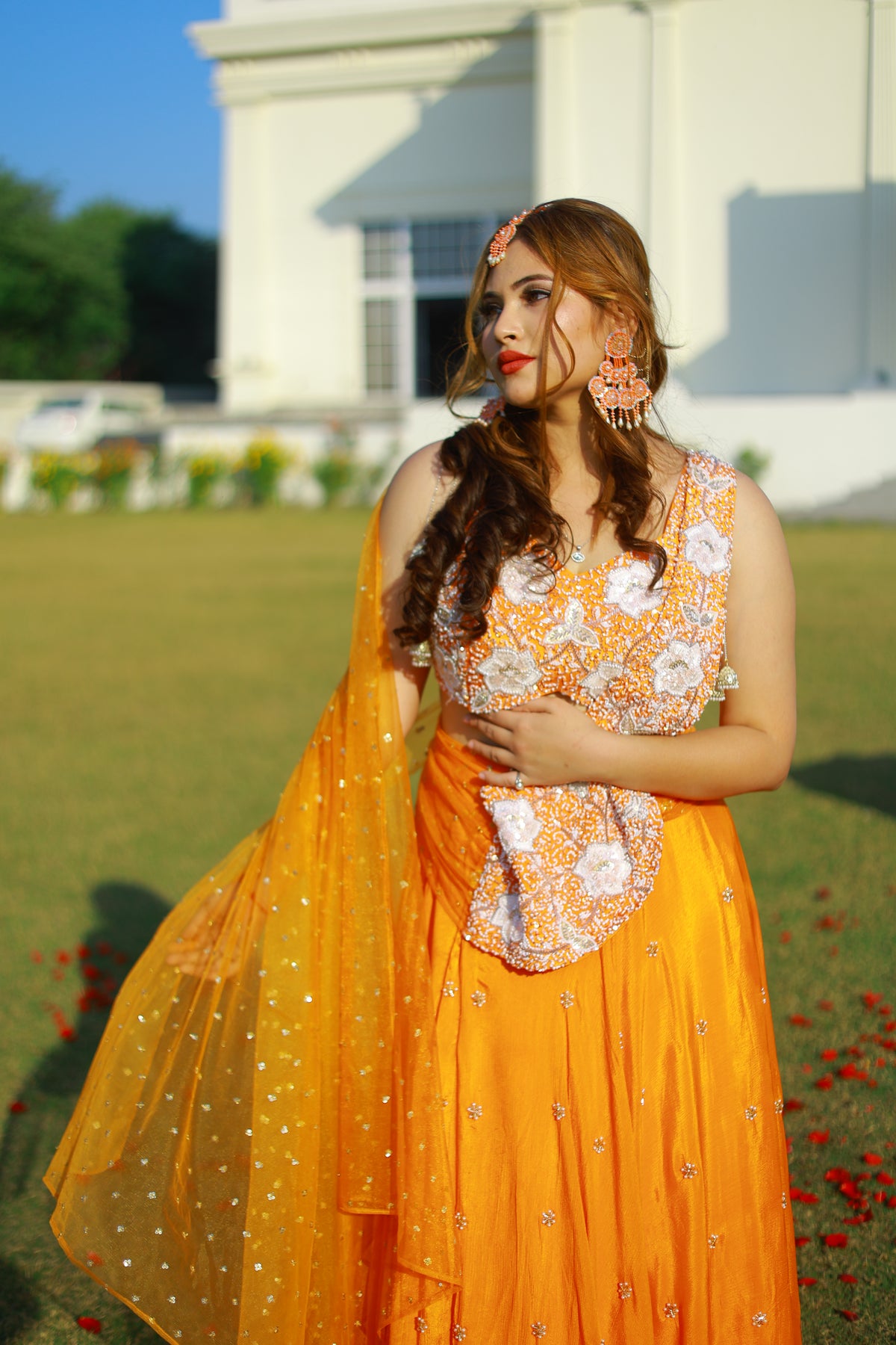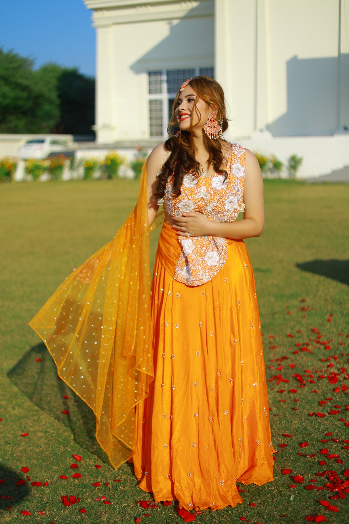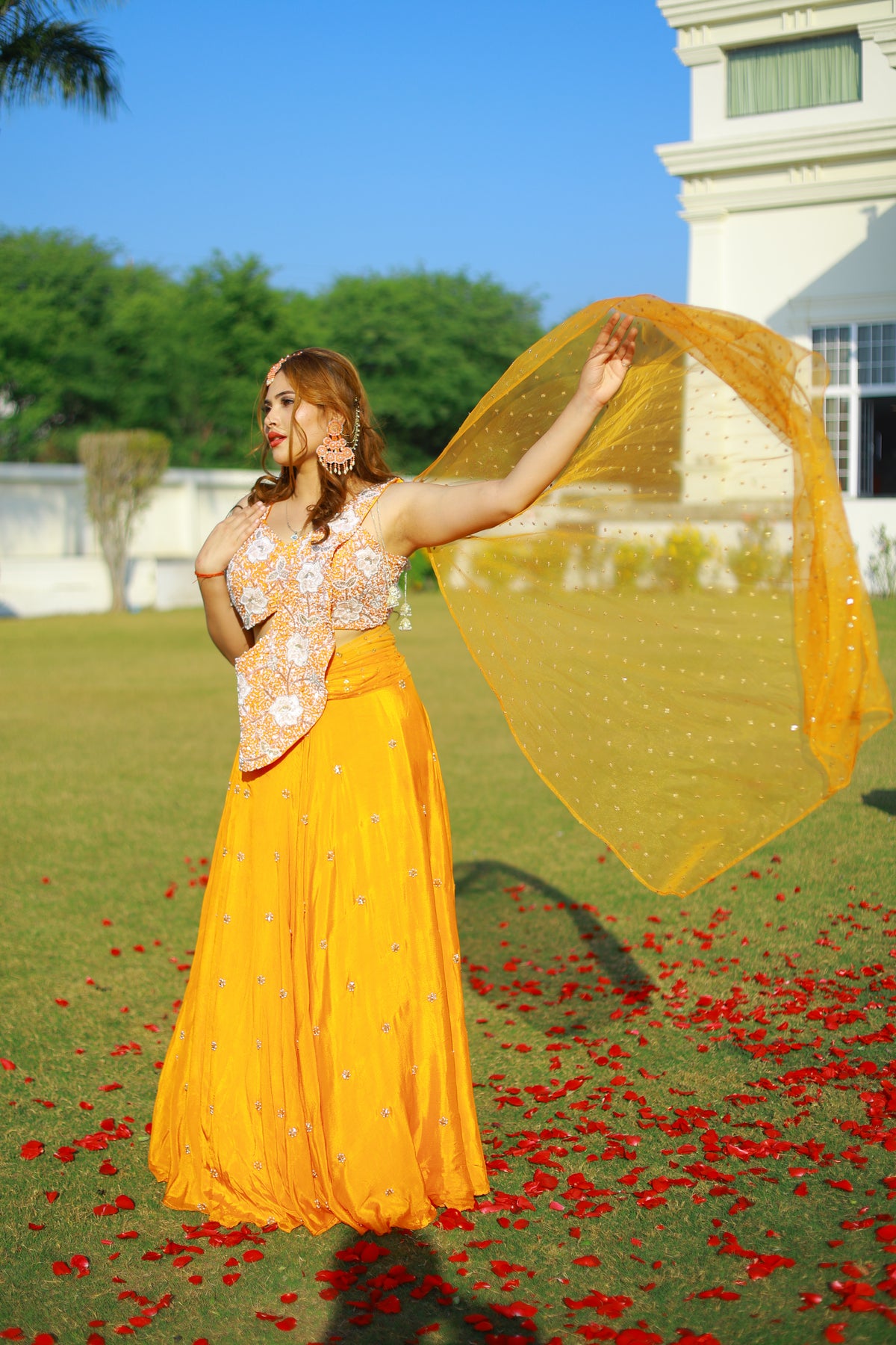 Crafted in a rich saffron hue, this ensemble features a hand-embroidered bodice adorned with delicate floral motifs, paired with a flowing skirt that moves effortlessly with every step. The look is completed with a sheer dupatta scattered with subtle embellishments, adding lightness, texture, and an unmistakable festive charm.