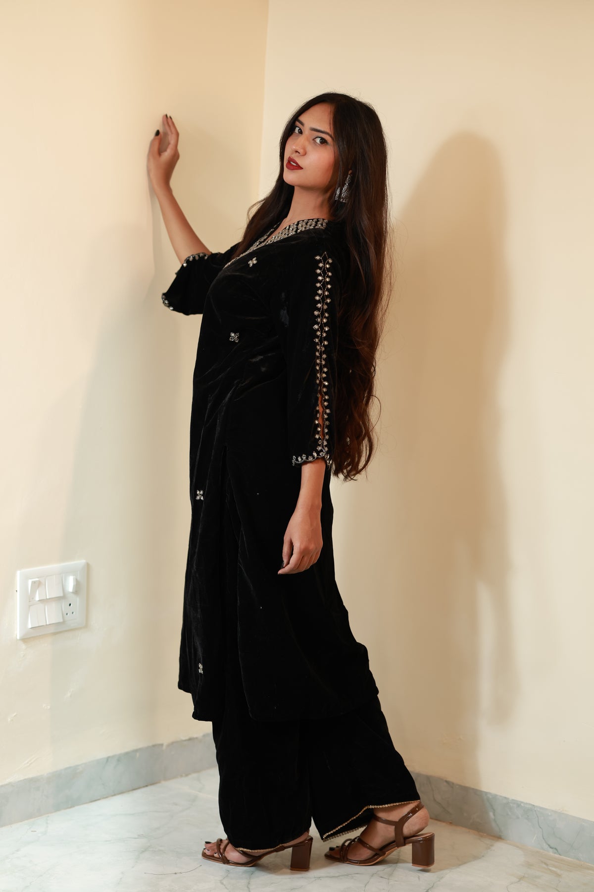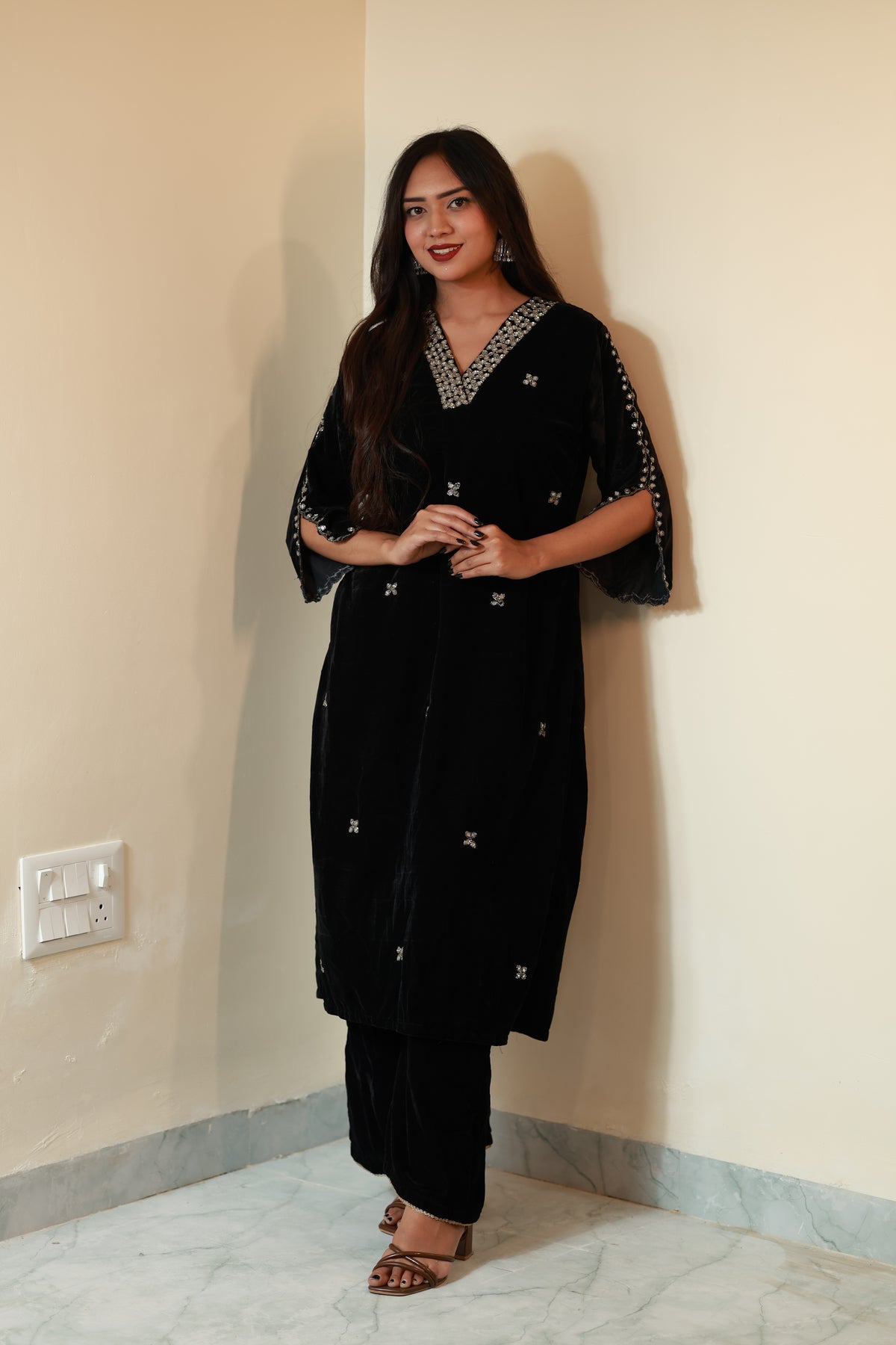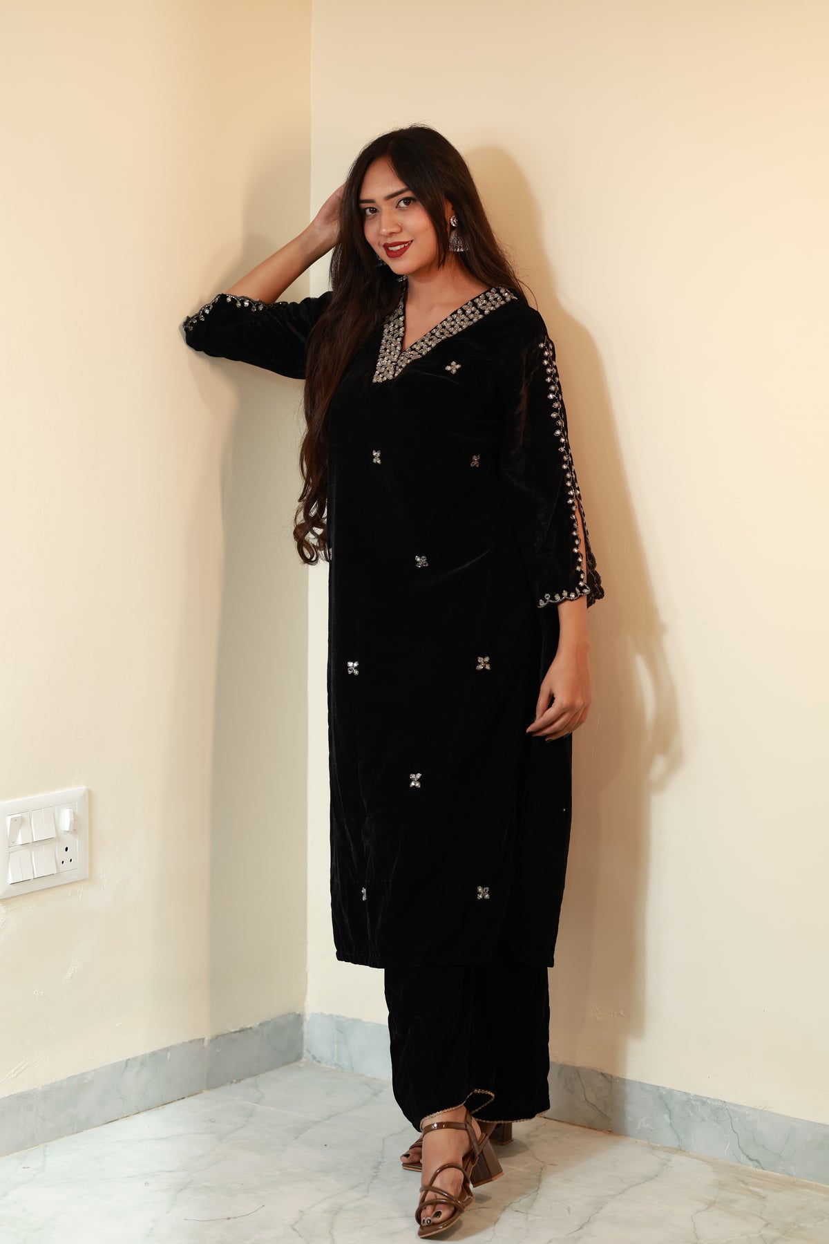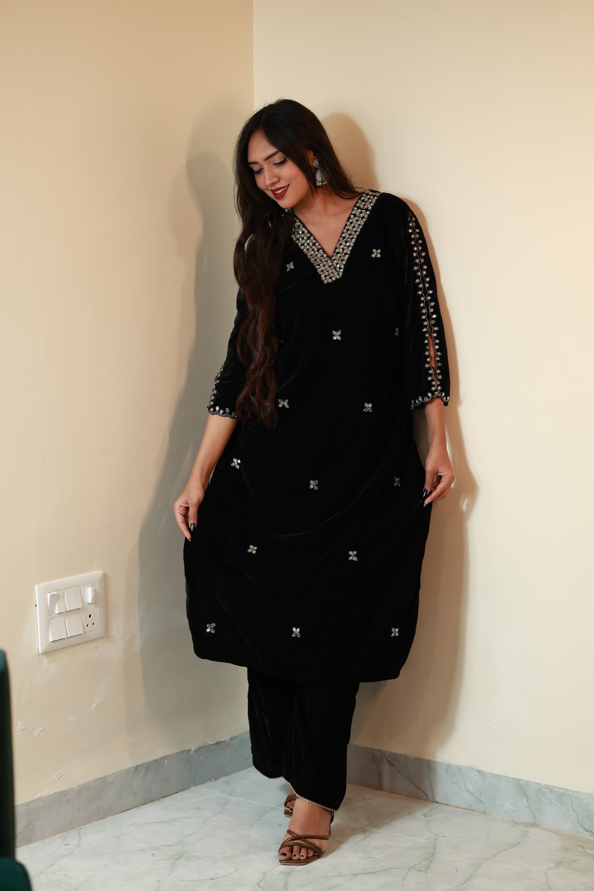 The Sukkoon Kaajal Kurta Set features a rich black velvet-touch fabric accented with delicate mirror embroidery across the neckline, sleeves, and scattered motifs on the kurta. The V-neck design with a statement embroidered panel enhances the festive appeal while keeping the overall look minimal and classy.