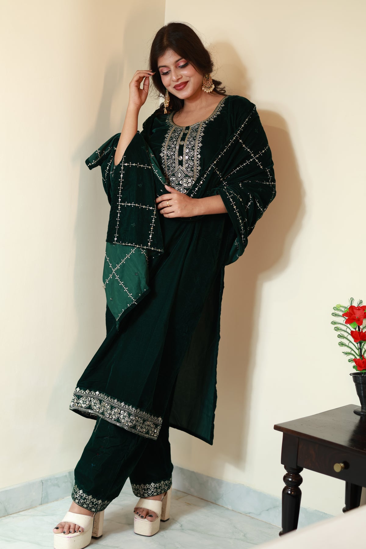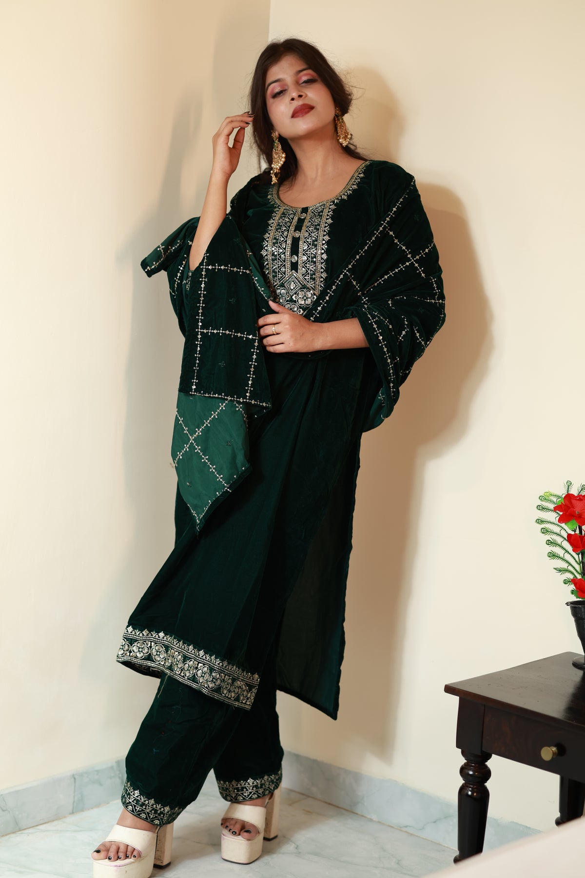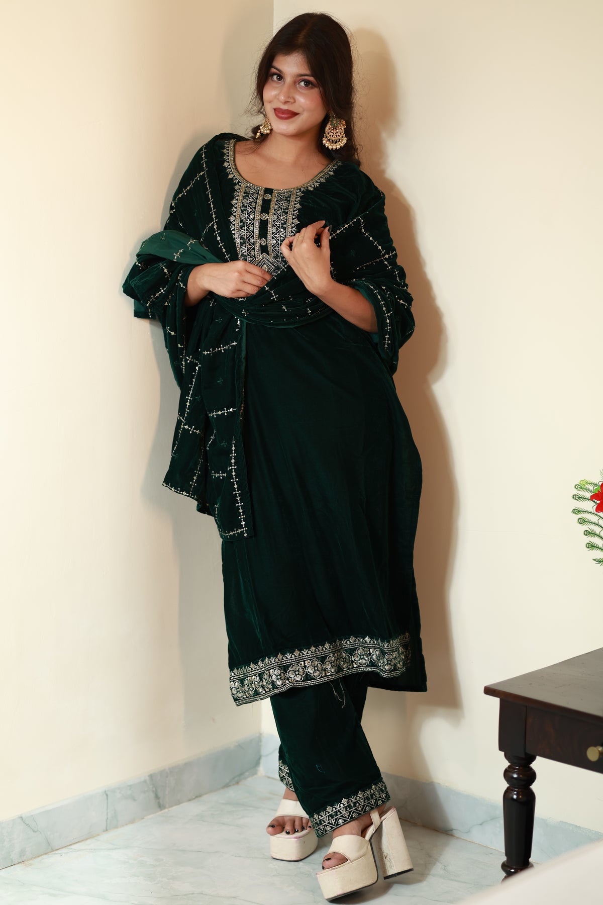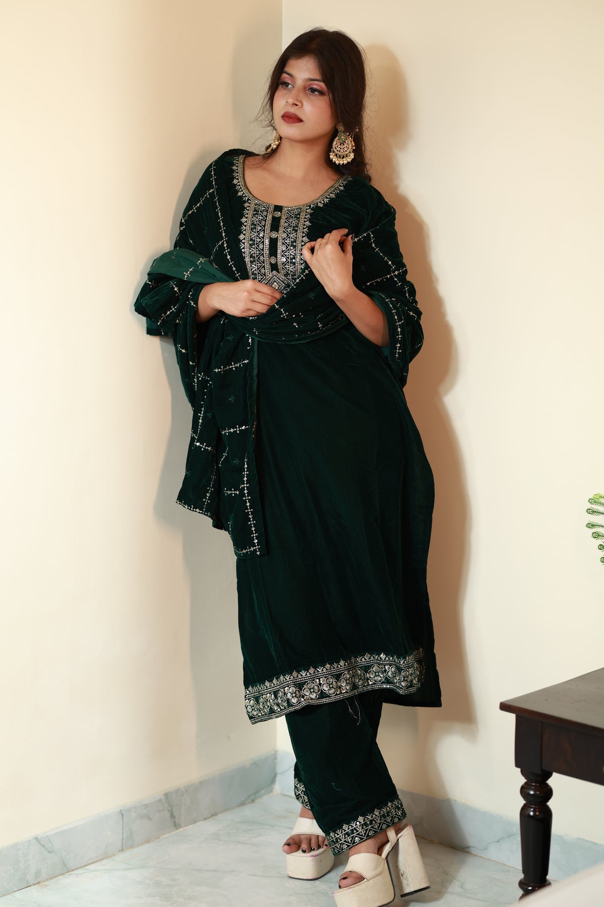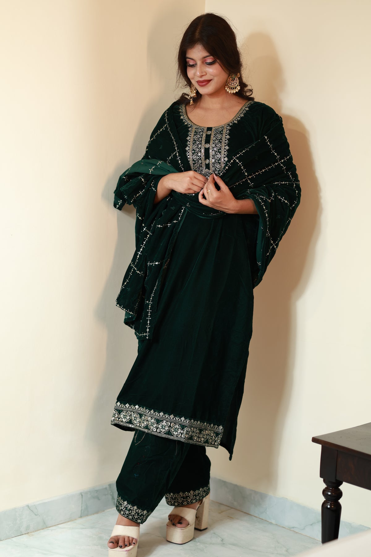 The Sukkoon Panna Kurta Set comes in a deep emerald green shade with detailed thread and zari embroidery across the neckline, sleeves, and hem. Made from a velvet-touch rayon blend, the fabric offers a rich festive look while staying soft and comfortable for all-day wear.